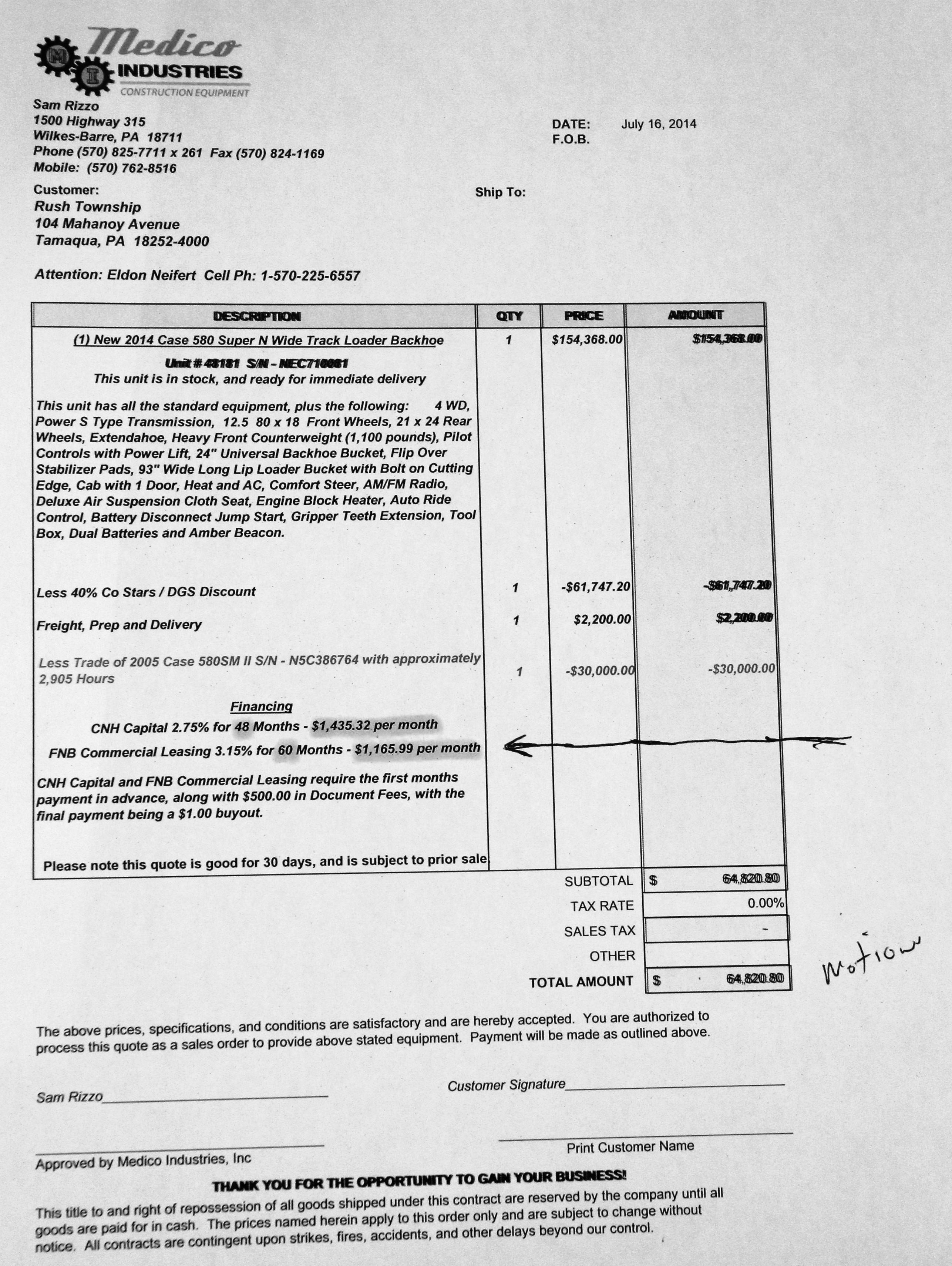 – Supervisors approved a motion to purchase a new backhoe, stating their current backhoe is 10 years old and needs $7k to 10k in repairs. The cost of the new backhoe (with trade-in and COSTARS discount) will be about $64k. (see sheet below).