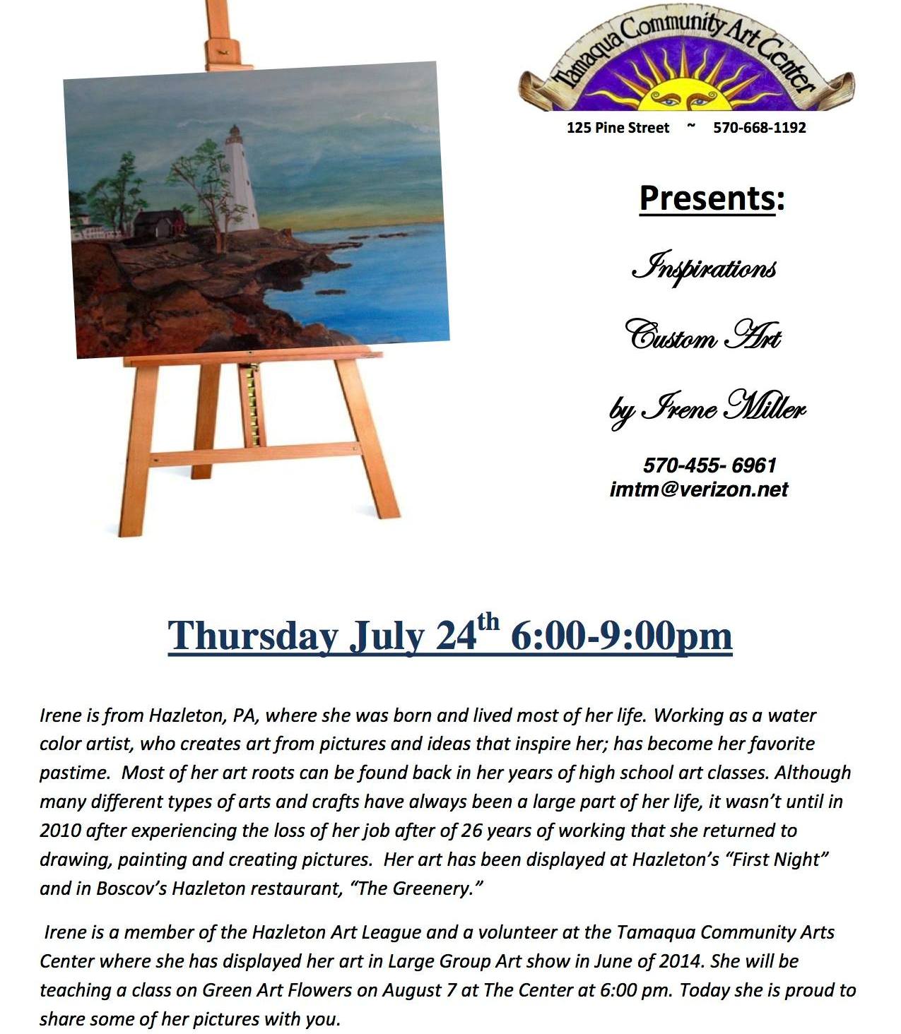 The Tamaqua Community Arts Center is holding an art show today (Thursday, July 24, 2014) from 6 PM to 9 PM at the center. The show features works by Irene Miller of Hazleton.