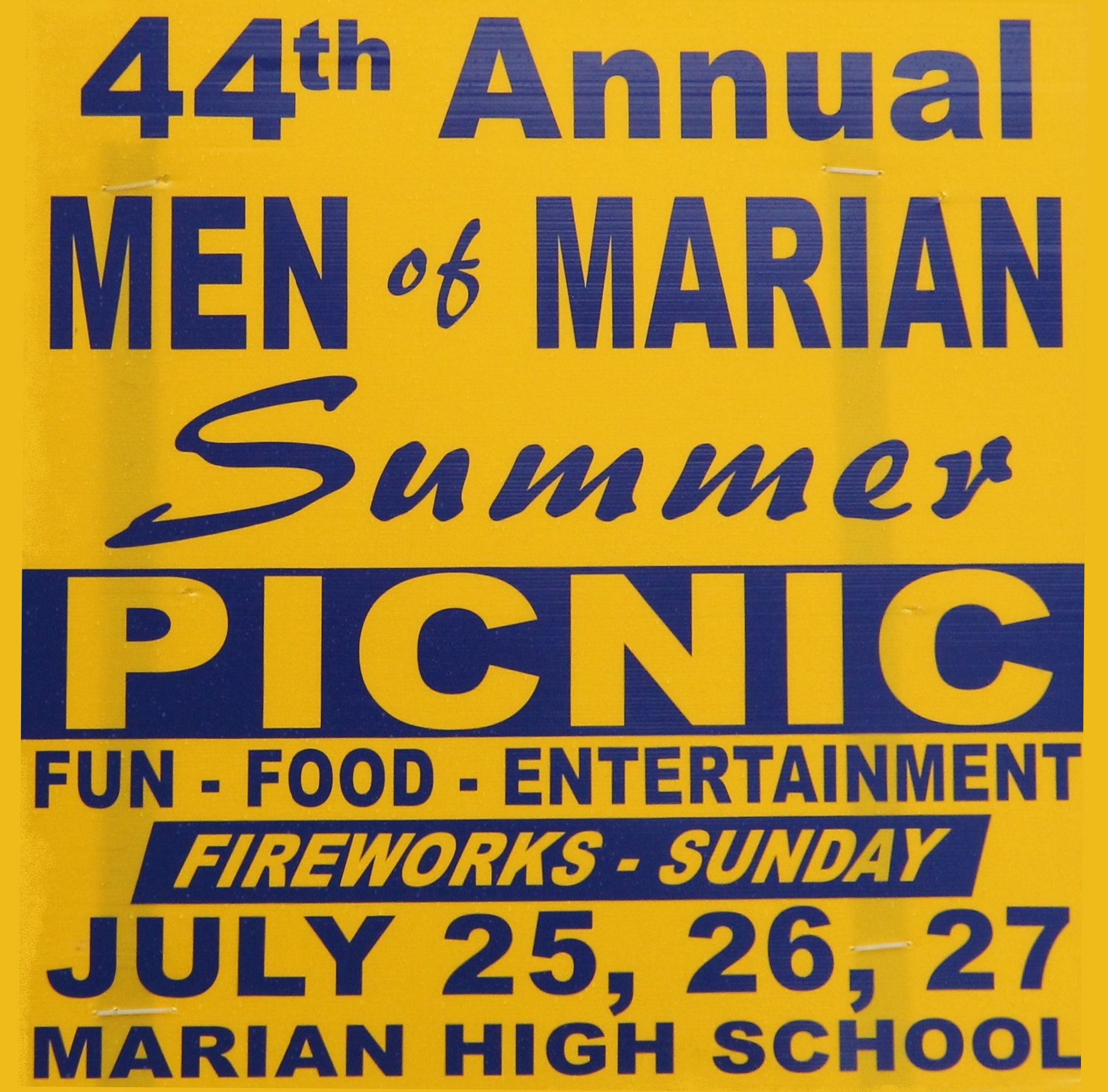 MEN OF MARIAN SUMMER PICNIC FRIDAY, SATURDAY AND SUNDAY AT MARIAN HIGH SCHOOL; FIREWORKS ON SUNDAY