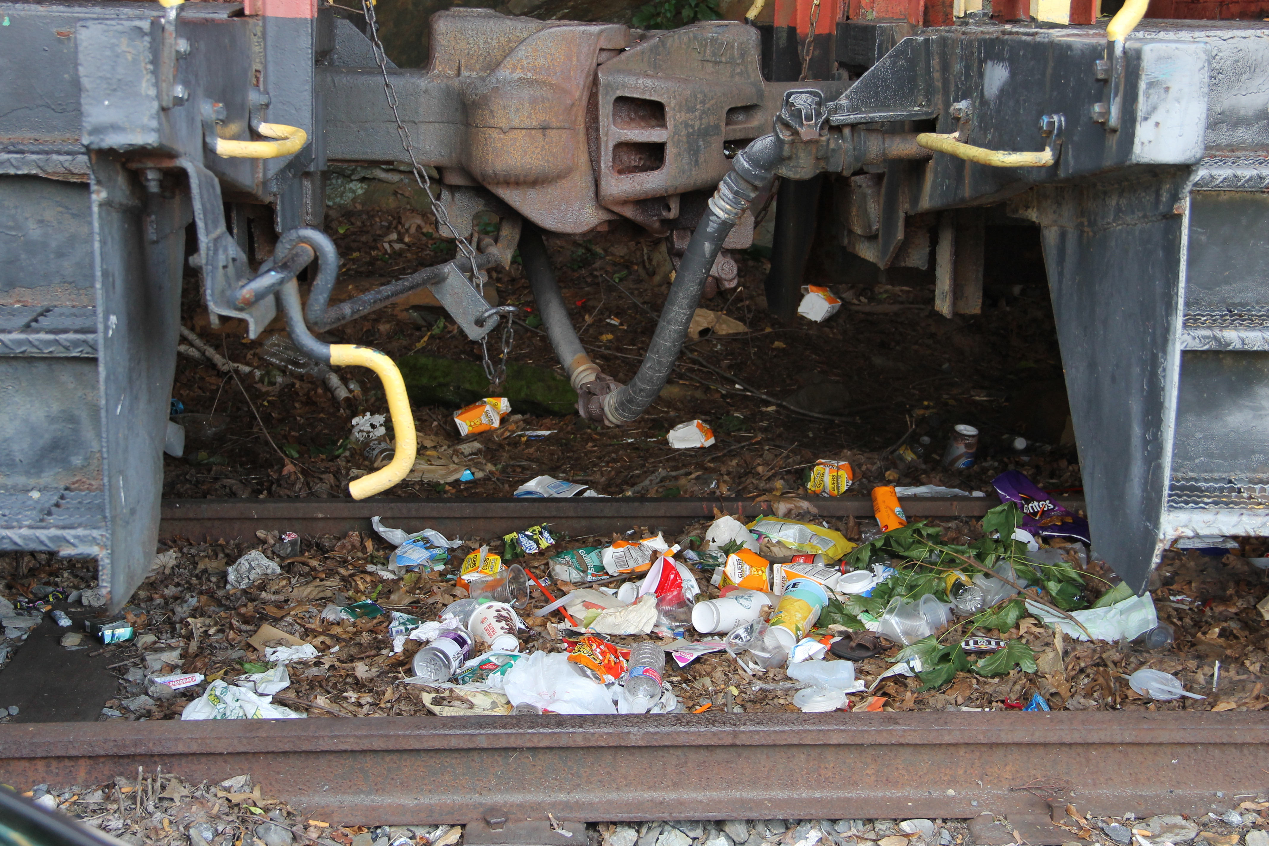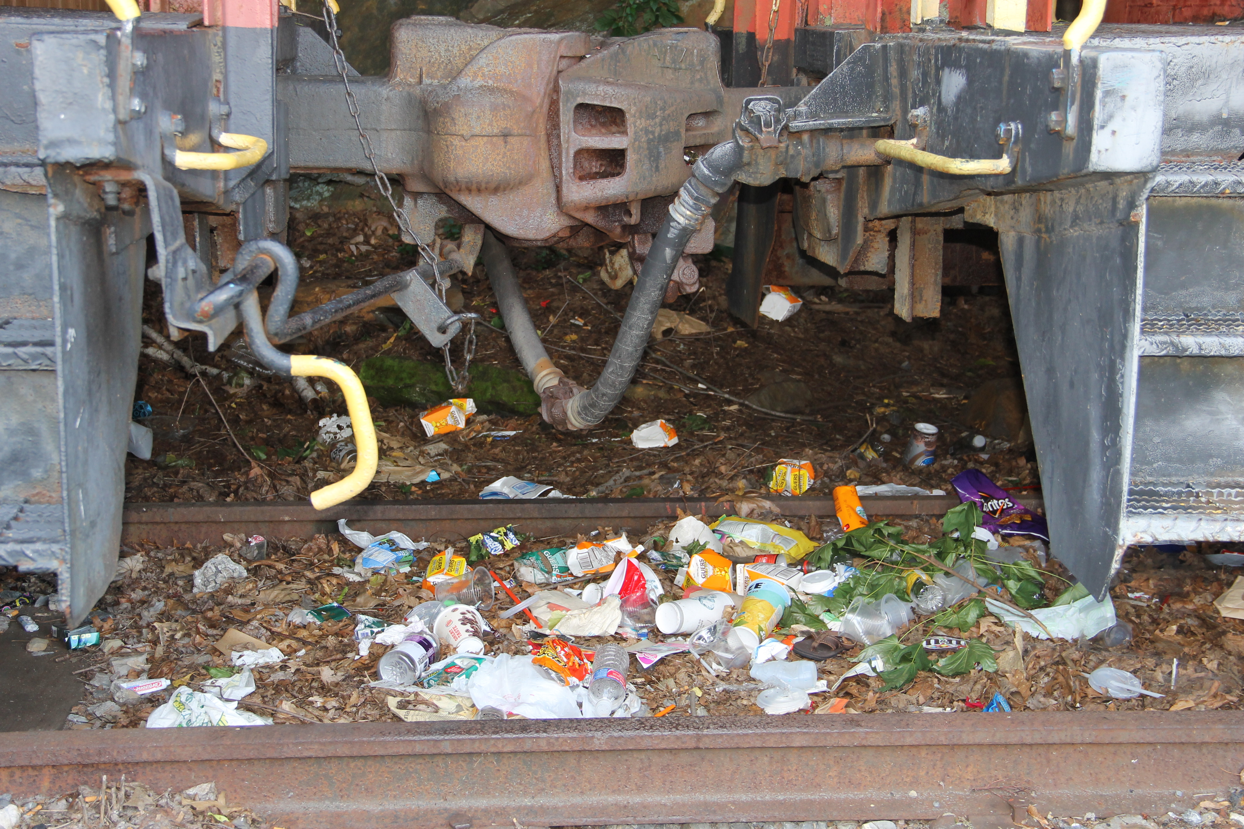 Pictured yesterday (Thursday, July 24, 2014) is litter thrown between two of the train rail cars located adjacent to the Tamaqua Train Station. The area was cleaned by volunteers less than three weeks ago.