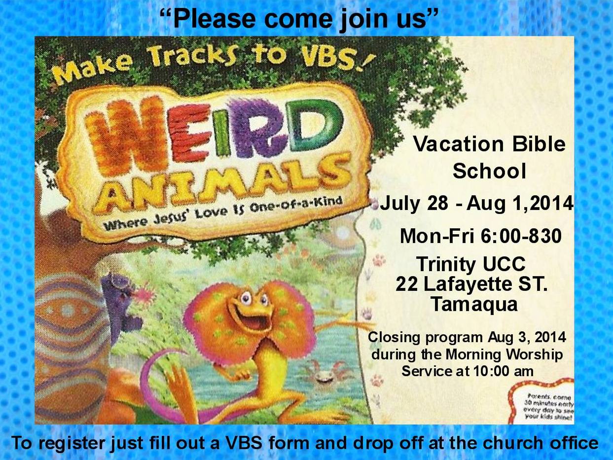 Members and parishioners with Trinity United Church of Christ in Tamaqua are holding a ‘Weird Animals’ Bible School Camp starting today (Monday, July 28, 2014) and ending Friday, August 1, 2014.