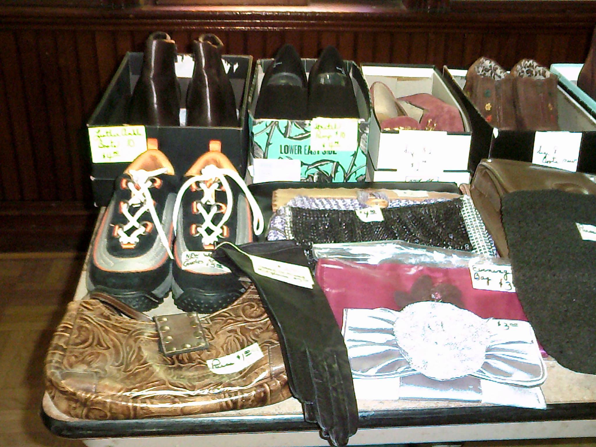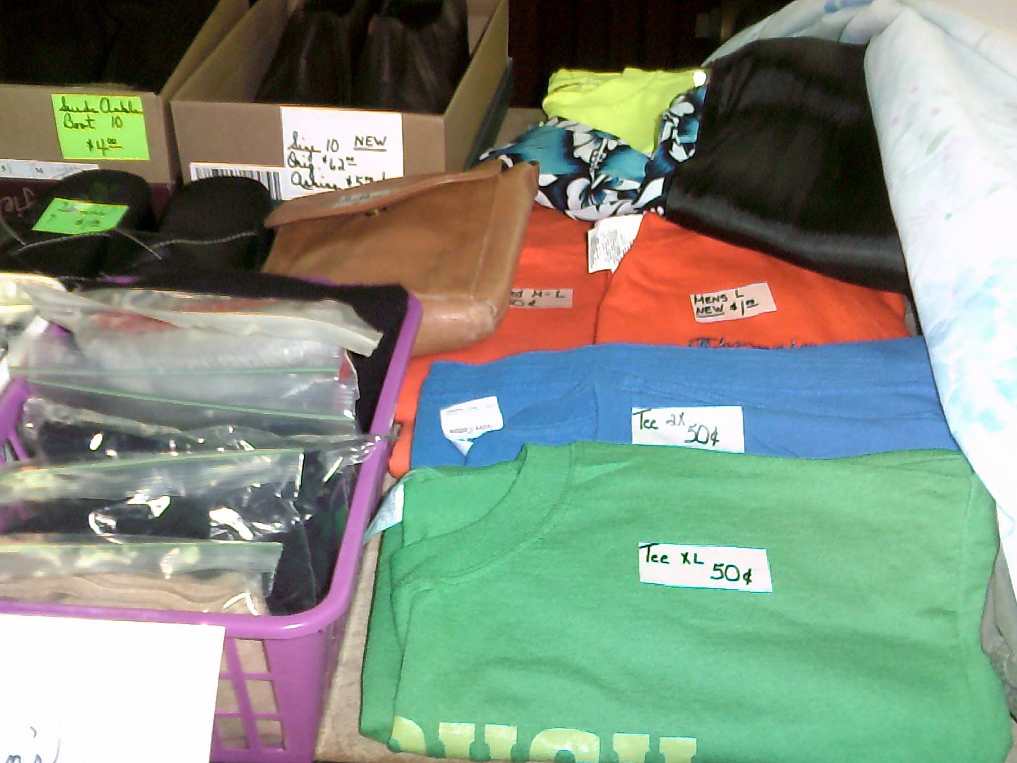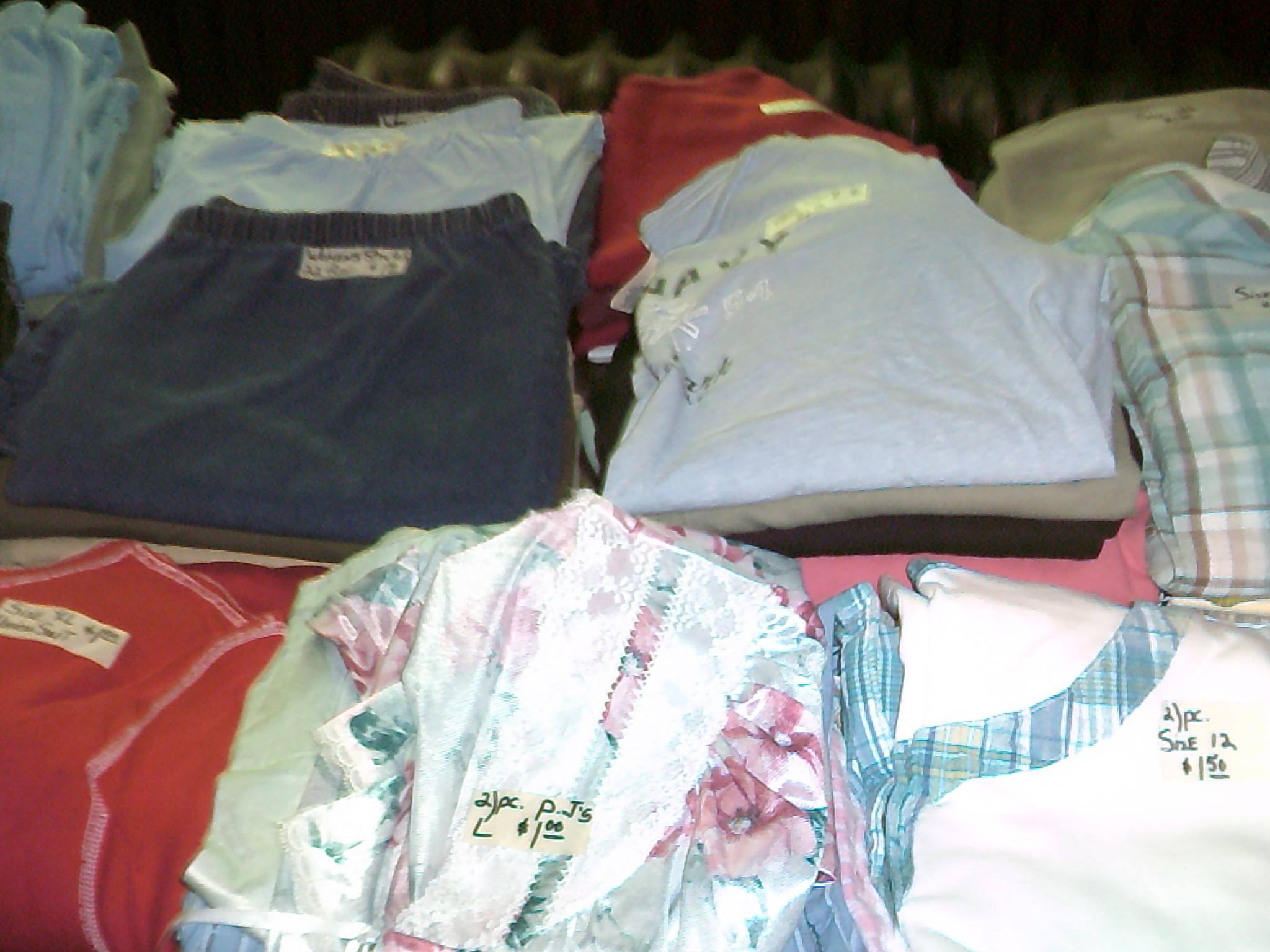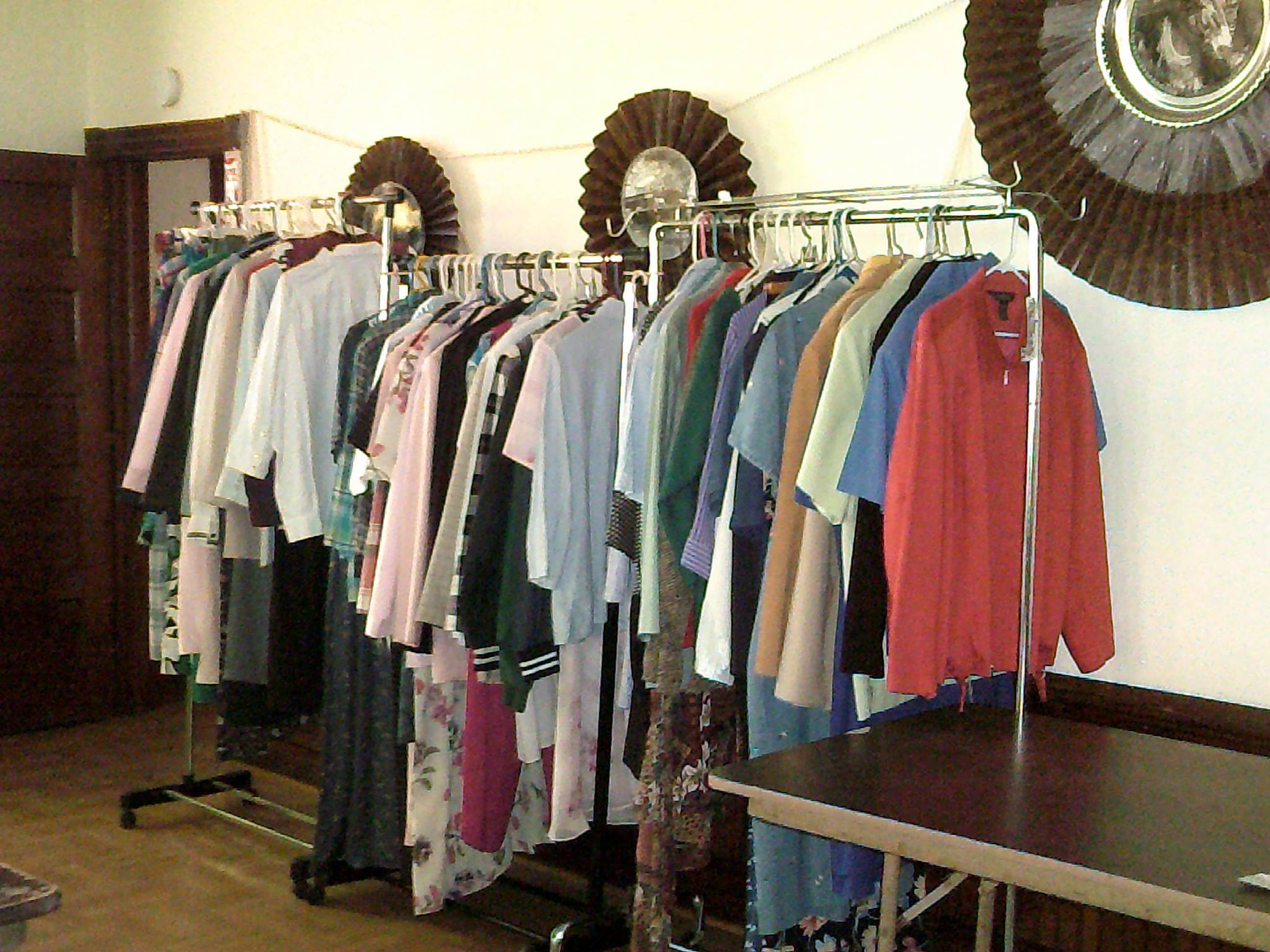 Some items for sale include homemade and vintage jewelry, sewing supplies, quilting stuff, cookbooks and a lg. amt. of books, racks of beautiful brand name women’s clothing(suitable for the office long dresses, some men’s Docker’s pants at affordable prices, kids clothing, computer stuff, k&k’s, wonderful glassware, and more.