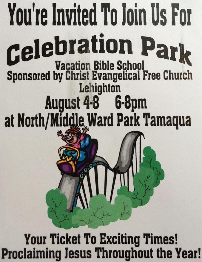 The Christ Evangelical Free Church in Lehighton is holding Vacation Bible School today (Monday, August 4, 2014) to Thursday (August 8, 2014) at the North & Middle Ward Playground in Tamaqua.