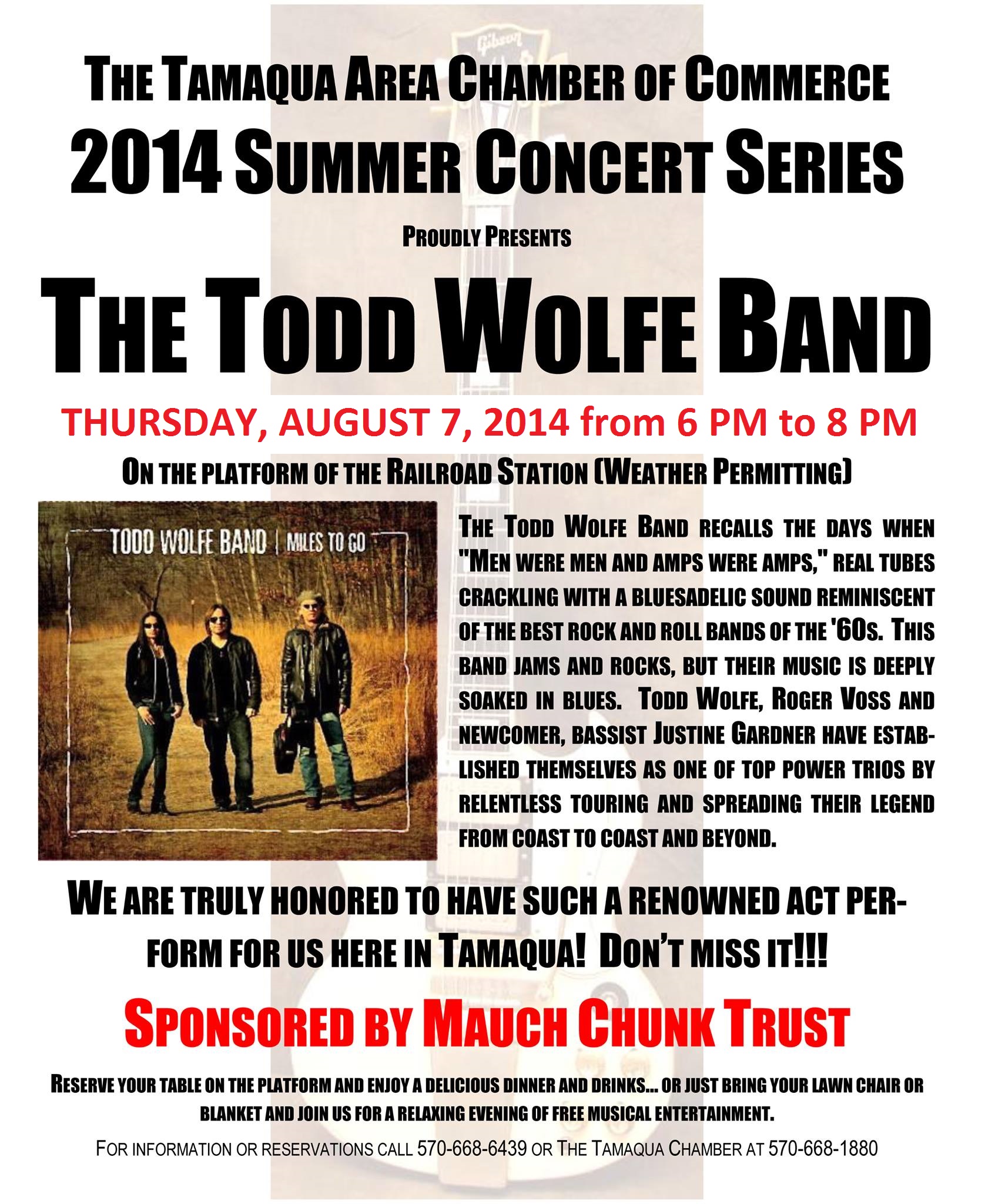 The Todd Wolfe Band will perform classic rock and bluesadelic during today’s (Thursday, August 7, 2014) Tamaqua Chamber of Commerce’s Summer Concert Series from 6 PM to 8 PM in front of the Tamaqua Train Station.