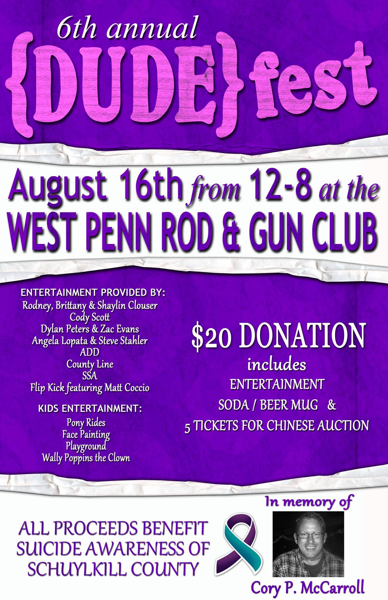 Family, friends and volunteers will be holding their 6th Annual Dudefest on Saturday, August 16, 2014 from 12 PM to 8 PM at the West Penn Rod and Gun Club in West Penn.