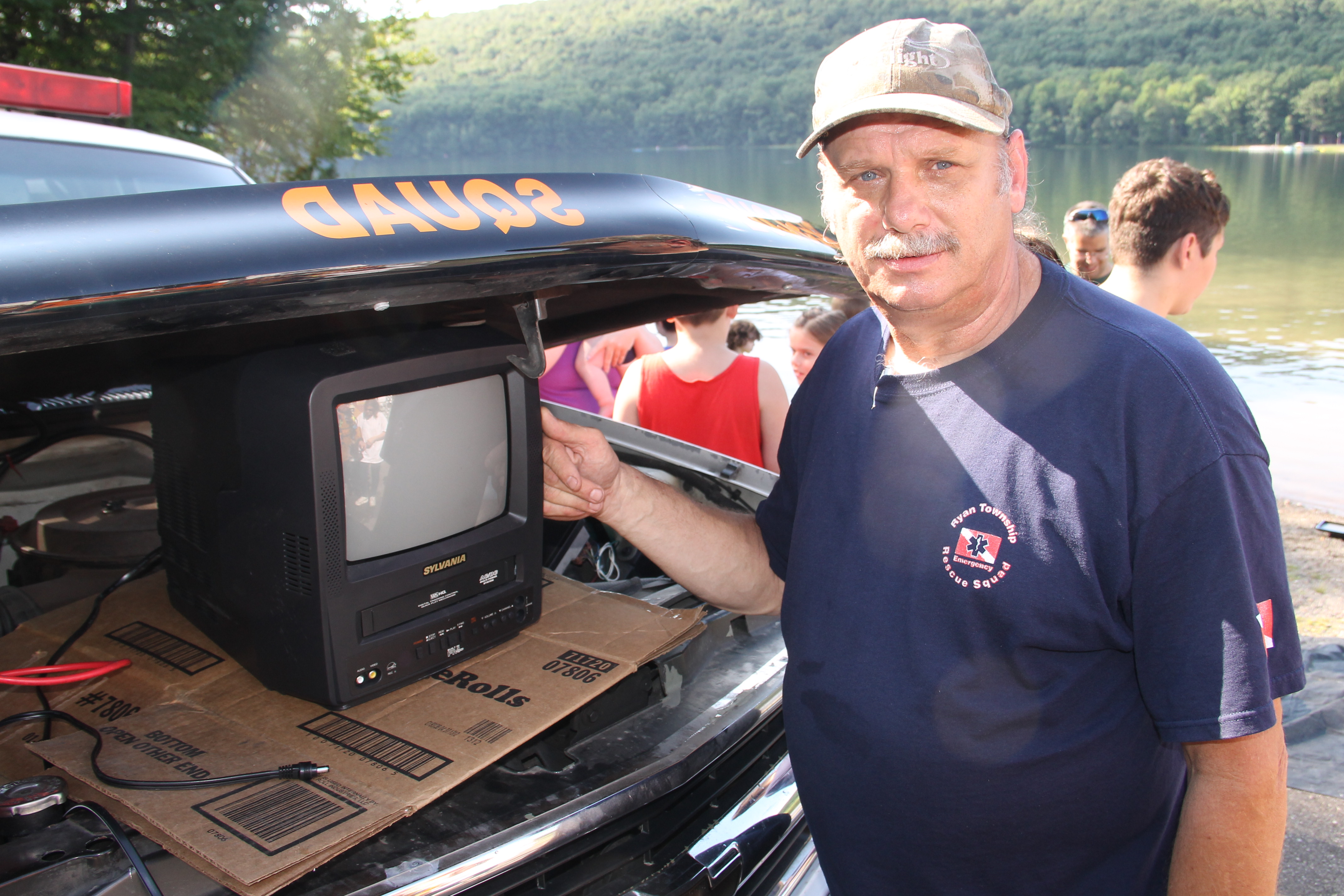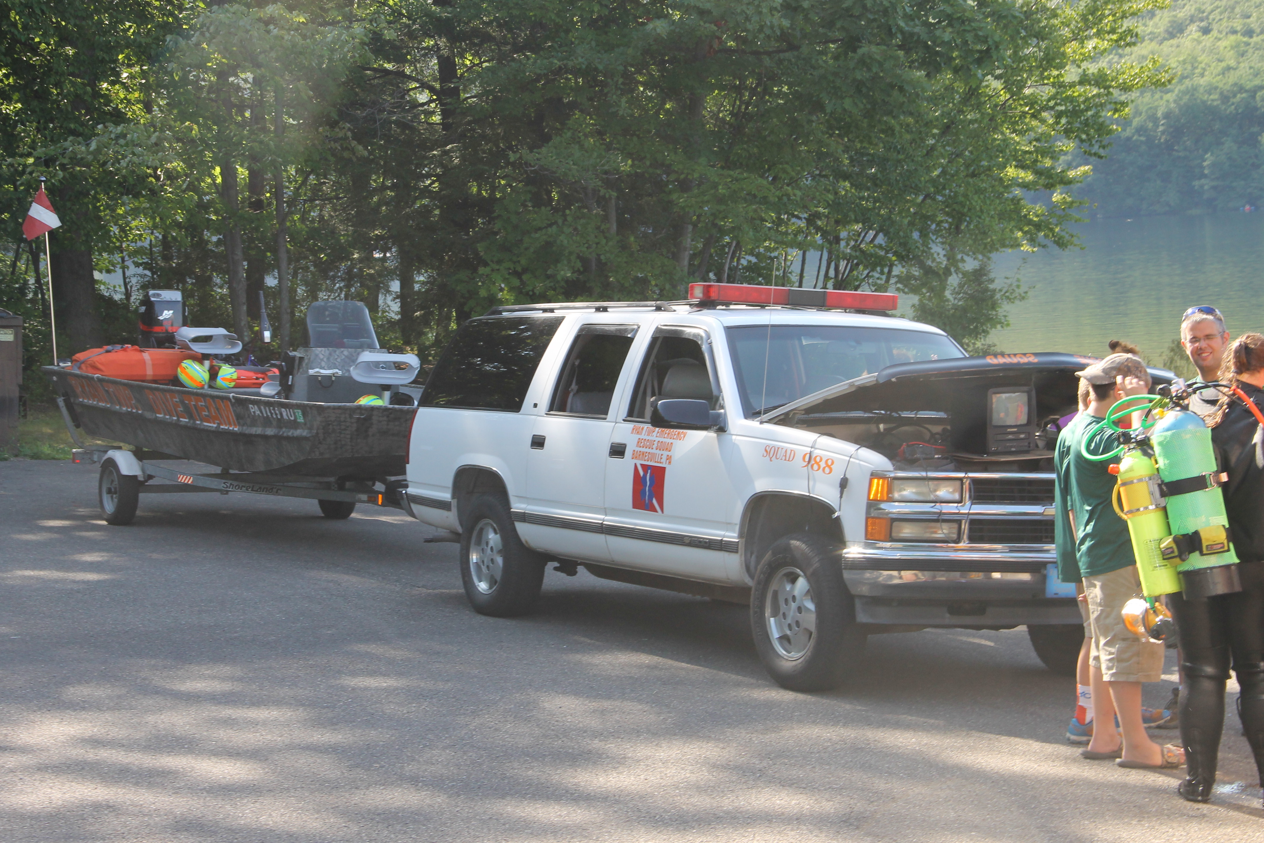 Members and volunteers with the Ryan Township Rescue Squad and Dive Team in Barnesville held a public presentation yesterday (Saturday, August 9, 2014) at the Locust Lake State Park in Barnesville. They discussed multiple topics related to water rescue, underwater search and body recovery. A number of apparatus and equipment were also on display. Popular items consisted of the team’s rescue boat, scuba gear and underwater camera equipment.