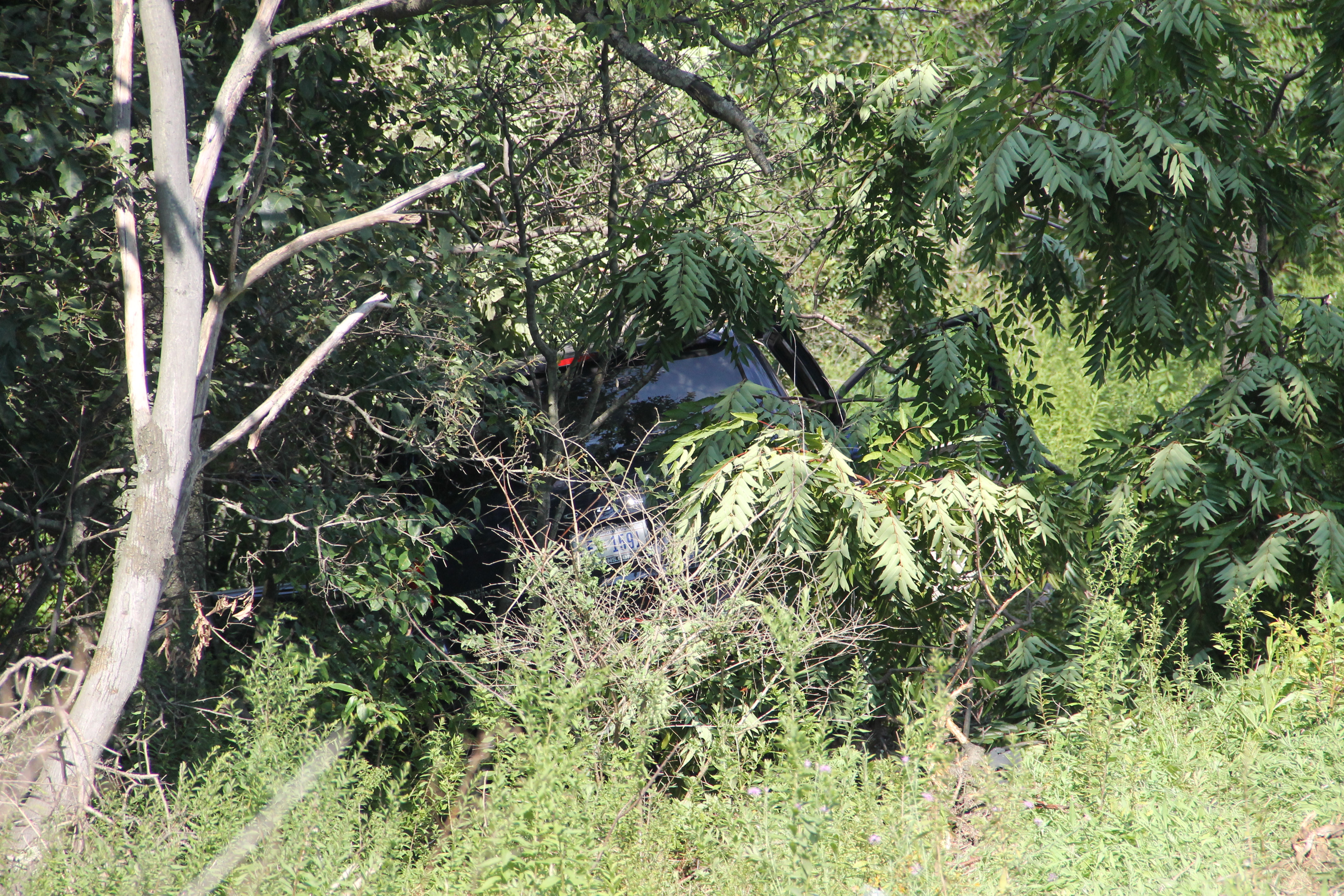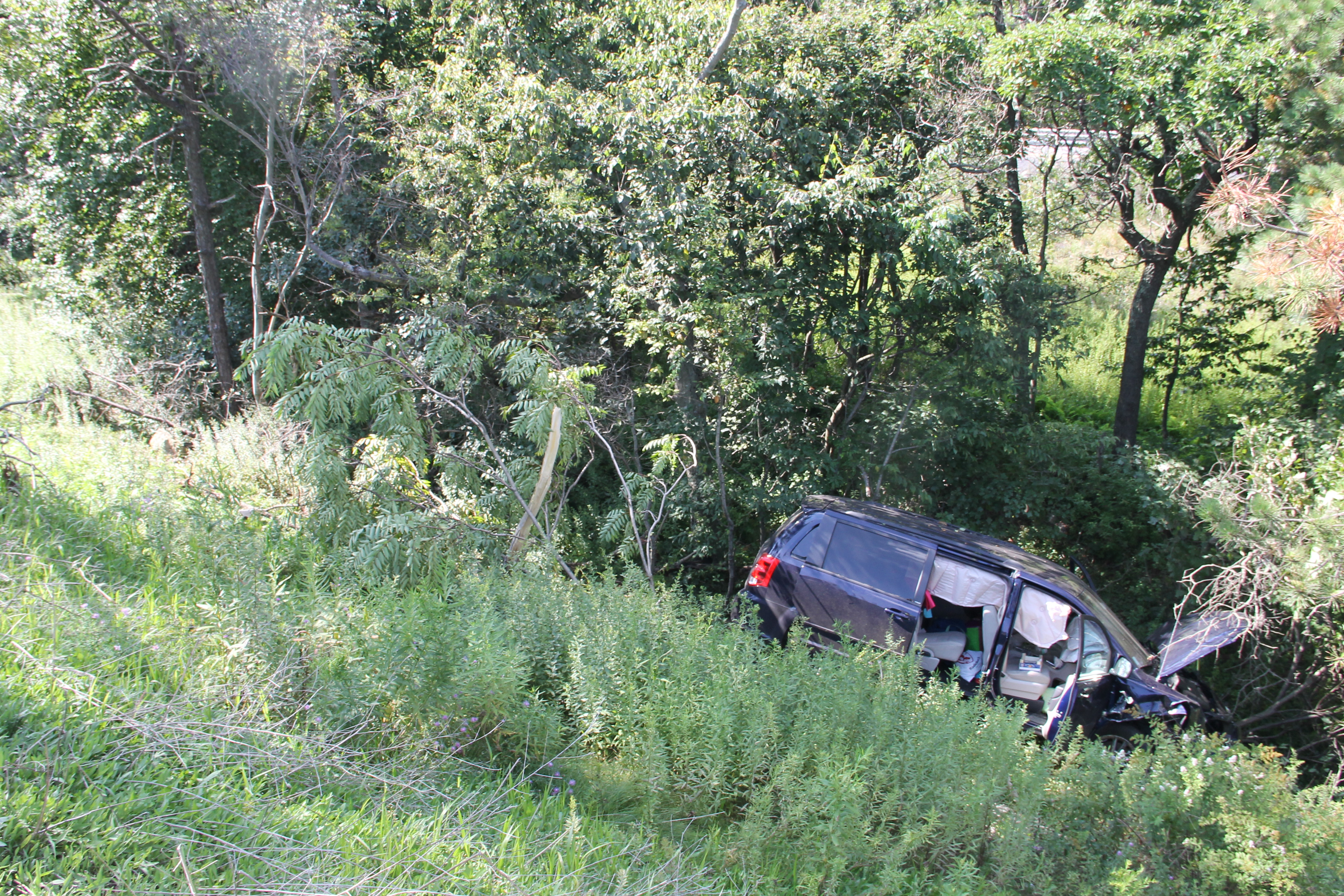 A woman escaped serious injury around 3:15 PM yesterday (Saturday, August 9, 2014) after crashing her blue 2013 Dodge Grand Caravan down an embankment off of Interstate 81 in Ryan Township.