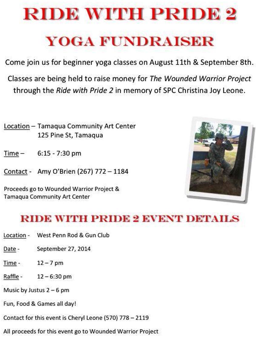 A Yoga fundraiser class is being held today (Monday, August 11, 2014) at 6:15 PM at the Tamaqua Community Arts Center to raise donations for ‘The Wounded Warrior Project’ through the ‘Ride With Pride 2’ in memory of SPC Christina Joy Leone. The class, being taught by instructor Amy O’Brien, will last until around 7:30 PM.