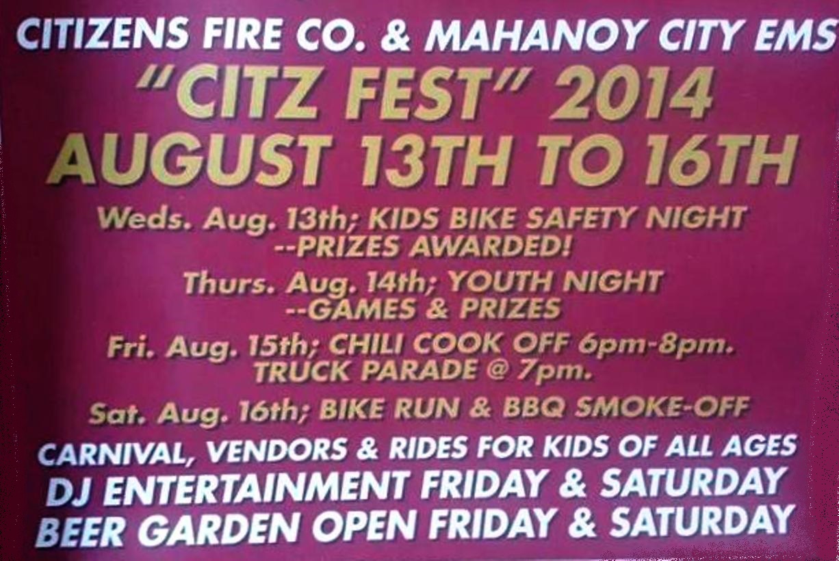 The Citizens Fire Company and Mahanoy City EMS of Mahanoy City are holding their 4-day ‘Citz Fest 2014″ carnival tomorrow (Wednesday, August 13, 2014) to Saturday, August 16, 2014.