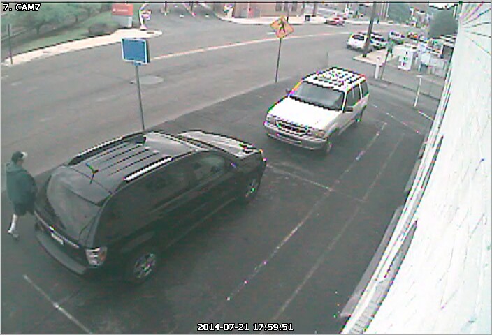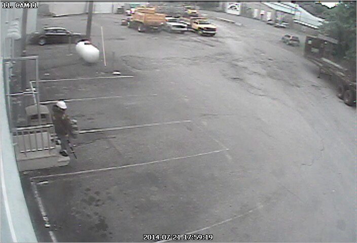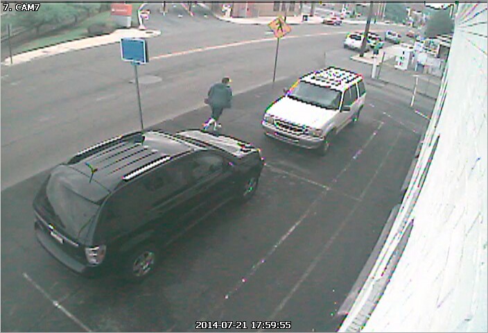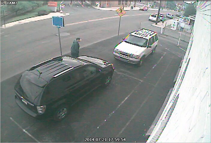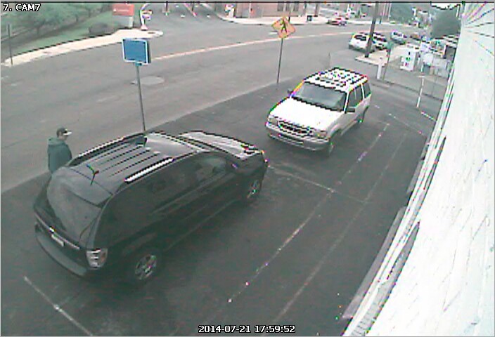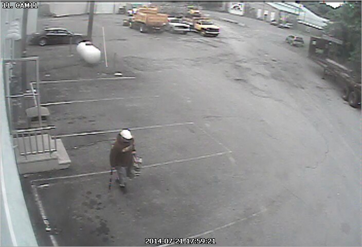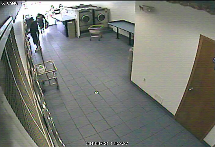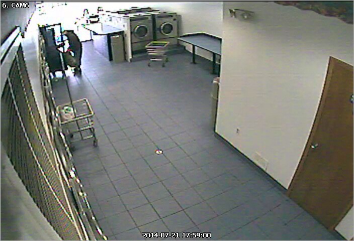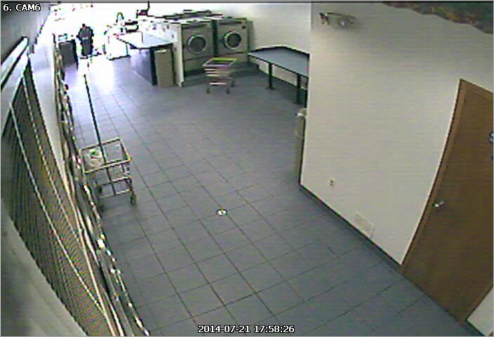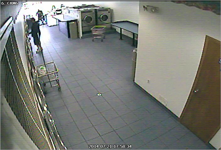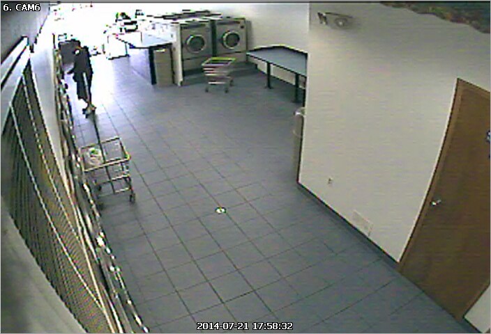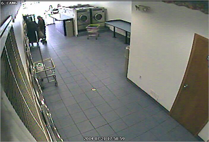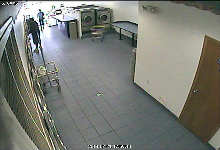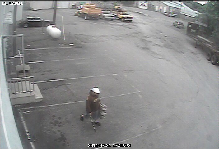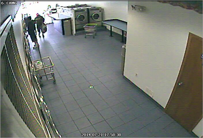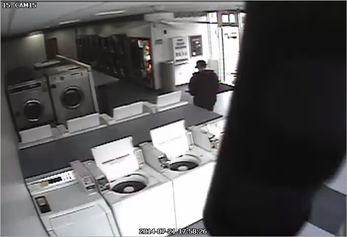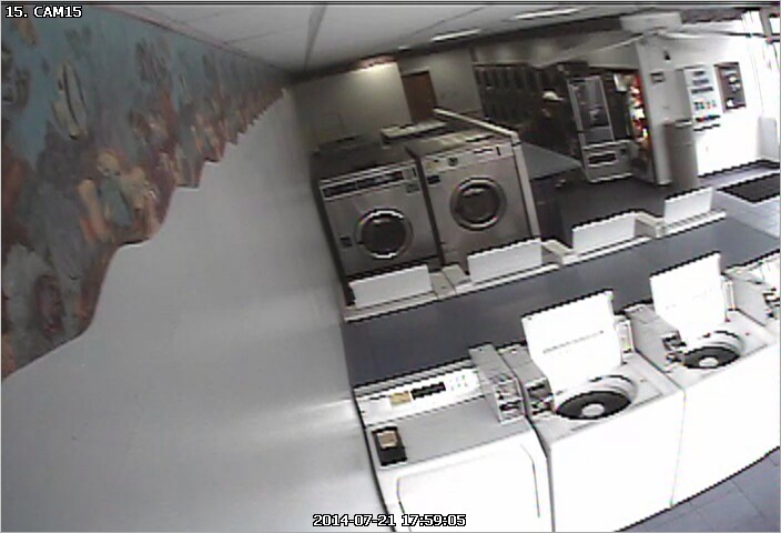 The thief with the cane appeared to be wearing a white cap, long-sleeve brown shirt with a small diamond logo and letters VOLCOM printed on it, grey sweatpants, black shoes and white sox. He also appeared to have a mustache, although it is not known if it was real. While exiting the side steps to the Laundromat, the suspect didn’t use the cane to support himself. This might mean that the cane and the “limp” was used to mislead investigators and prevent identification.