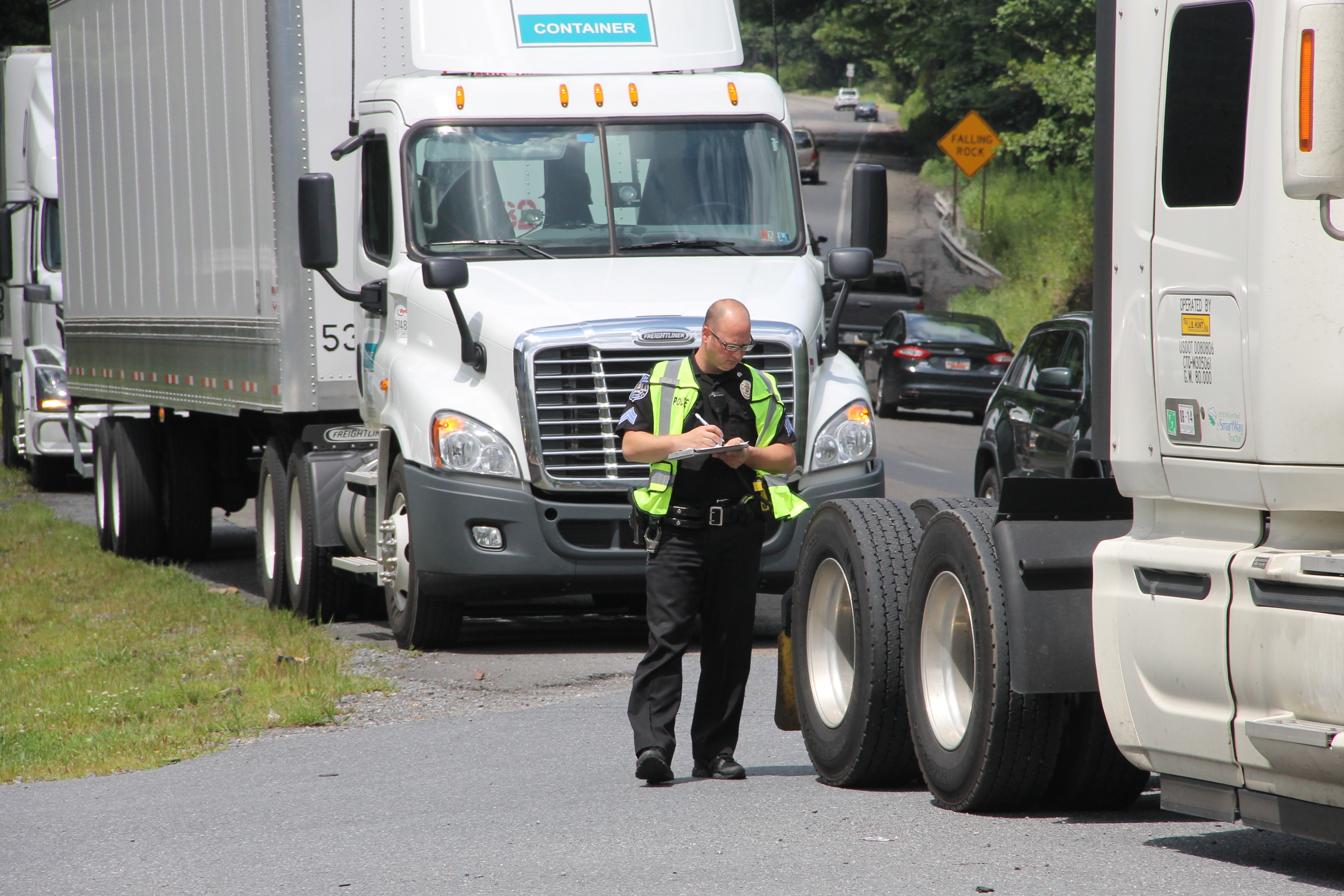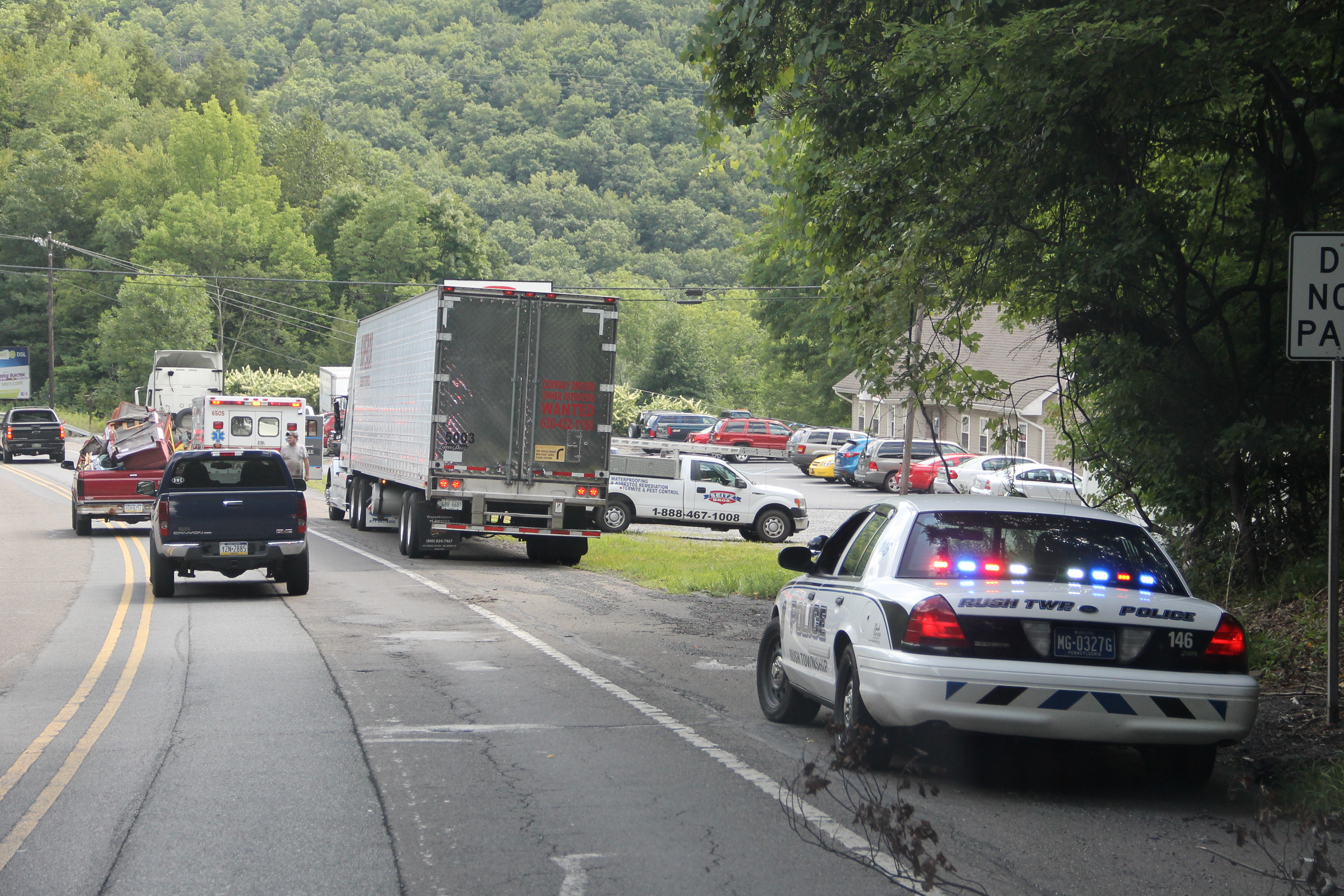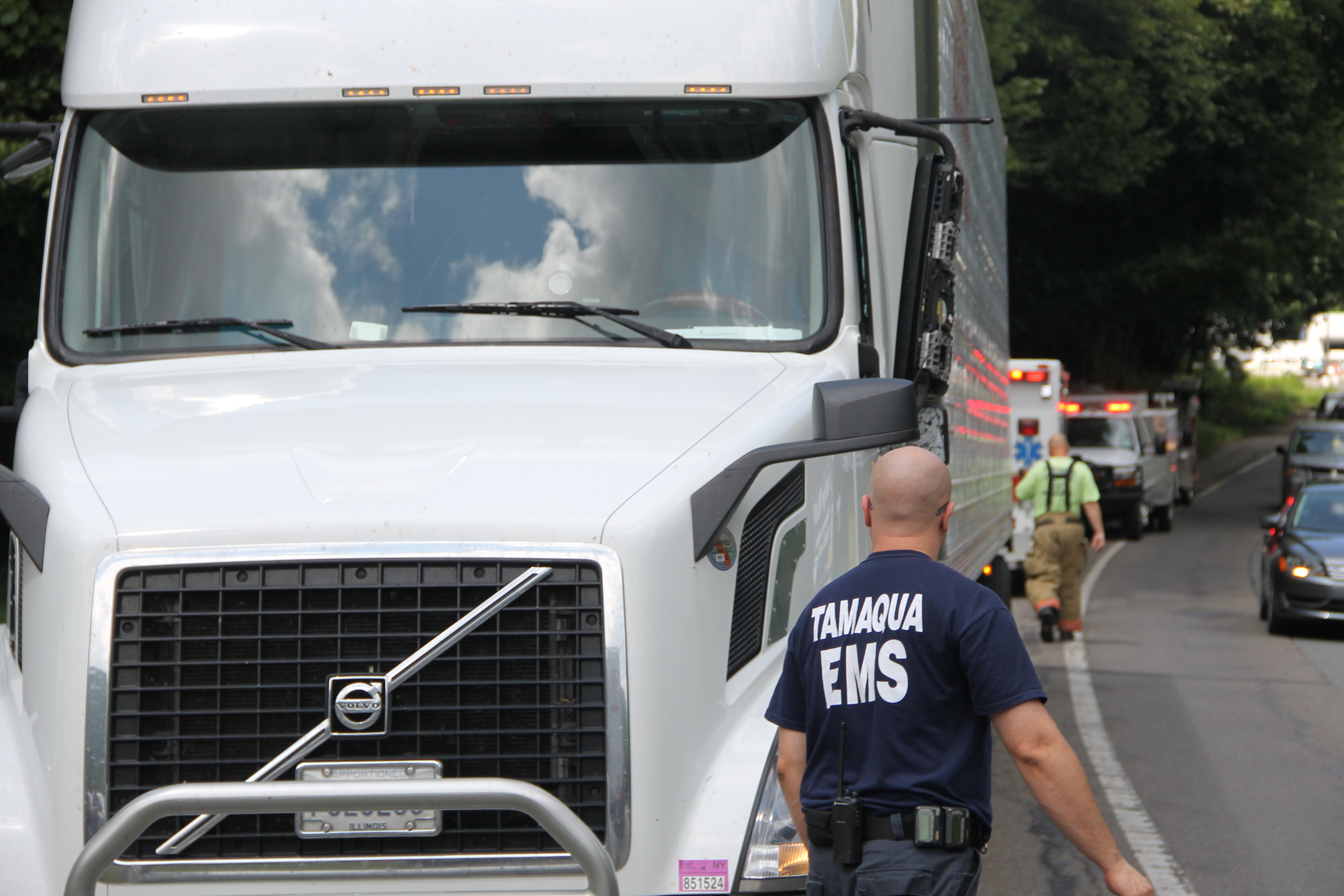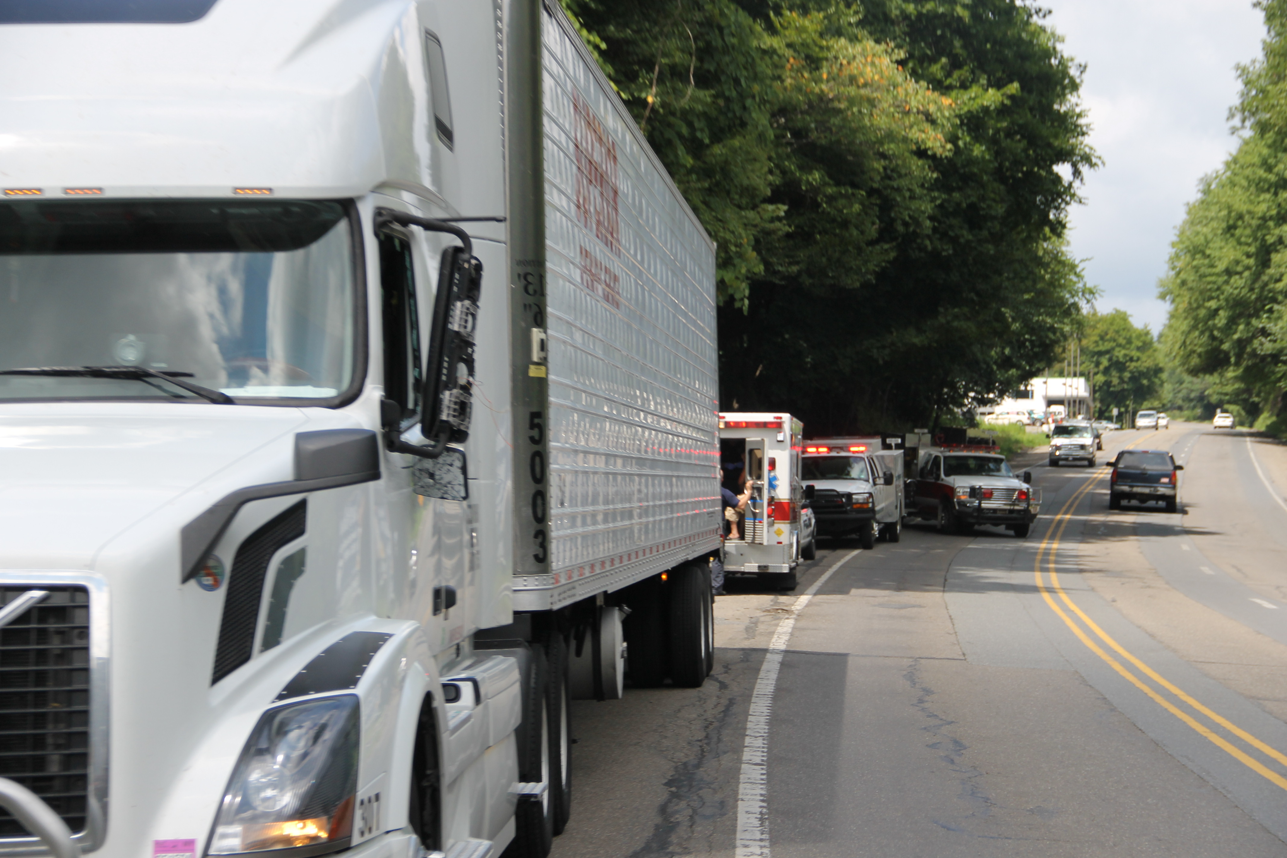 The driver of a tractor trailer was injured today (Wednesday, August 13, 2014) after his truck’s side mirror came in contact with a side mirror of another tractor trailer traveling the opposite direction on the Hometown Hill (SR309) in Rush Township. The incident, which involved two tractors, occurred around 2 PM today in the area in front of Seitz Brothers Exterminating. The tractor trailer traveling north was owned by Superior Overnight Services out of Illinois, while the tractor trailer traveling south was owned by J.B. Hunt out of Oklahoma.