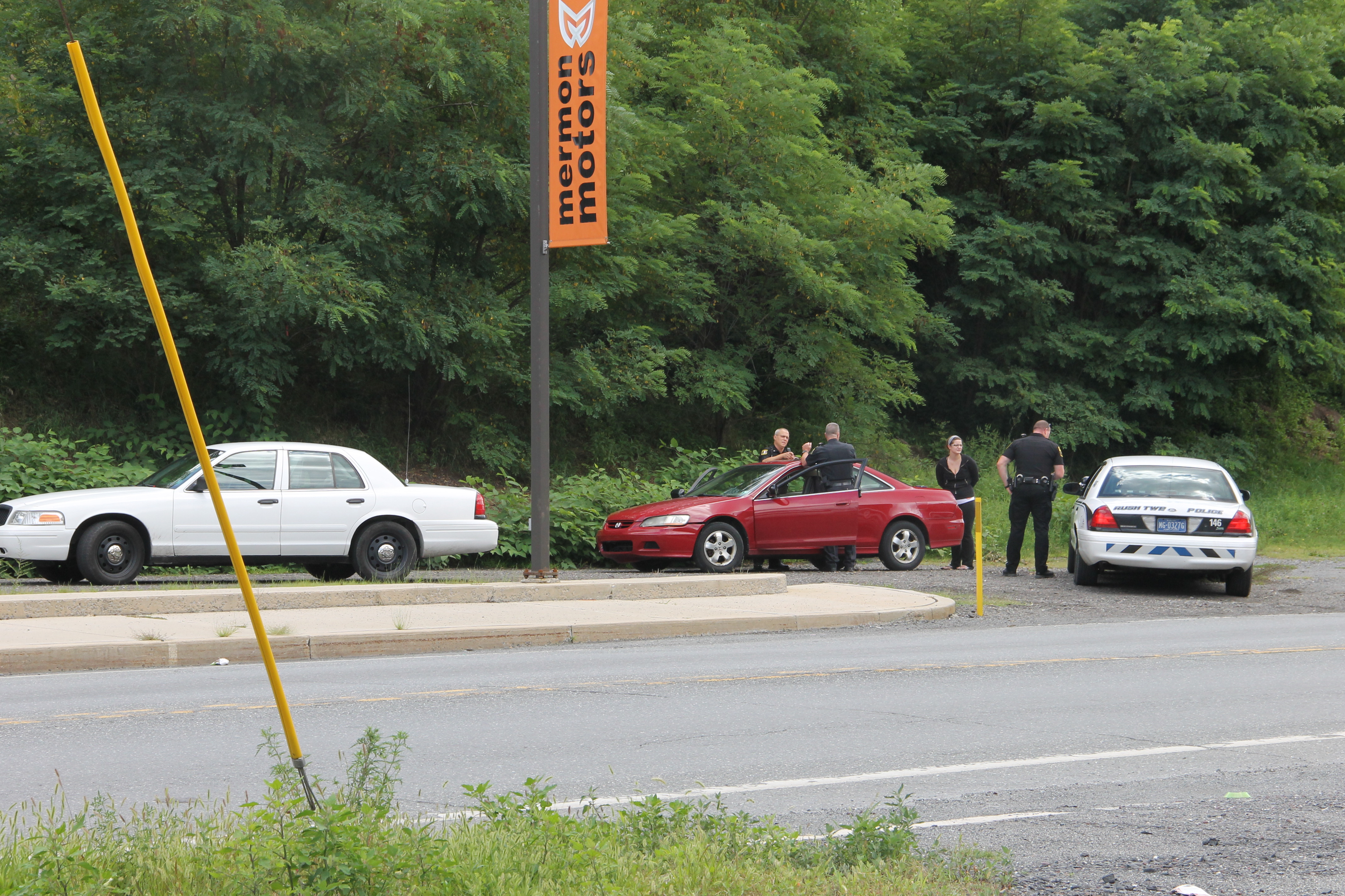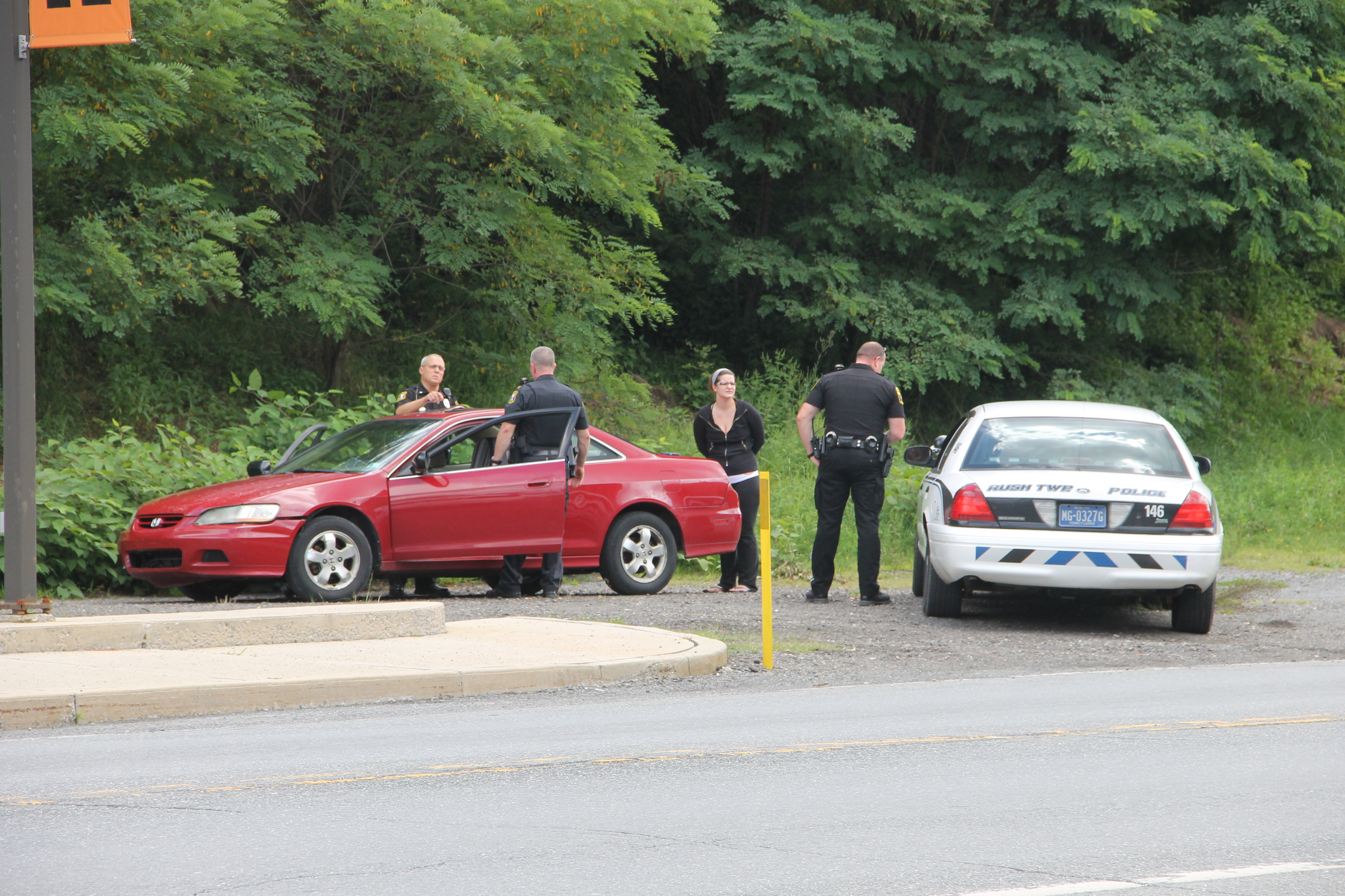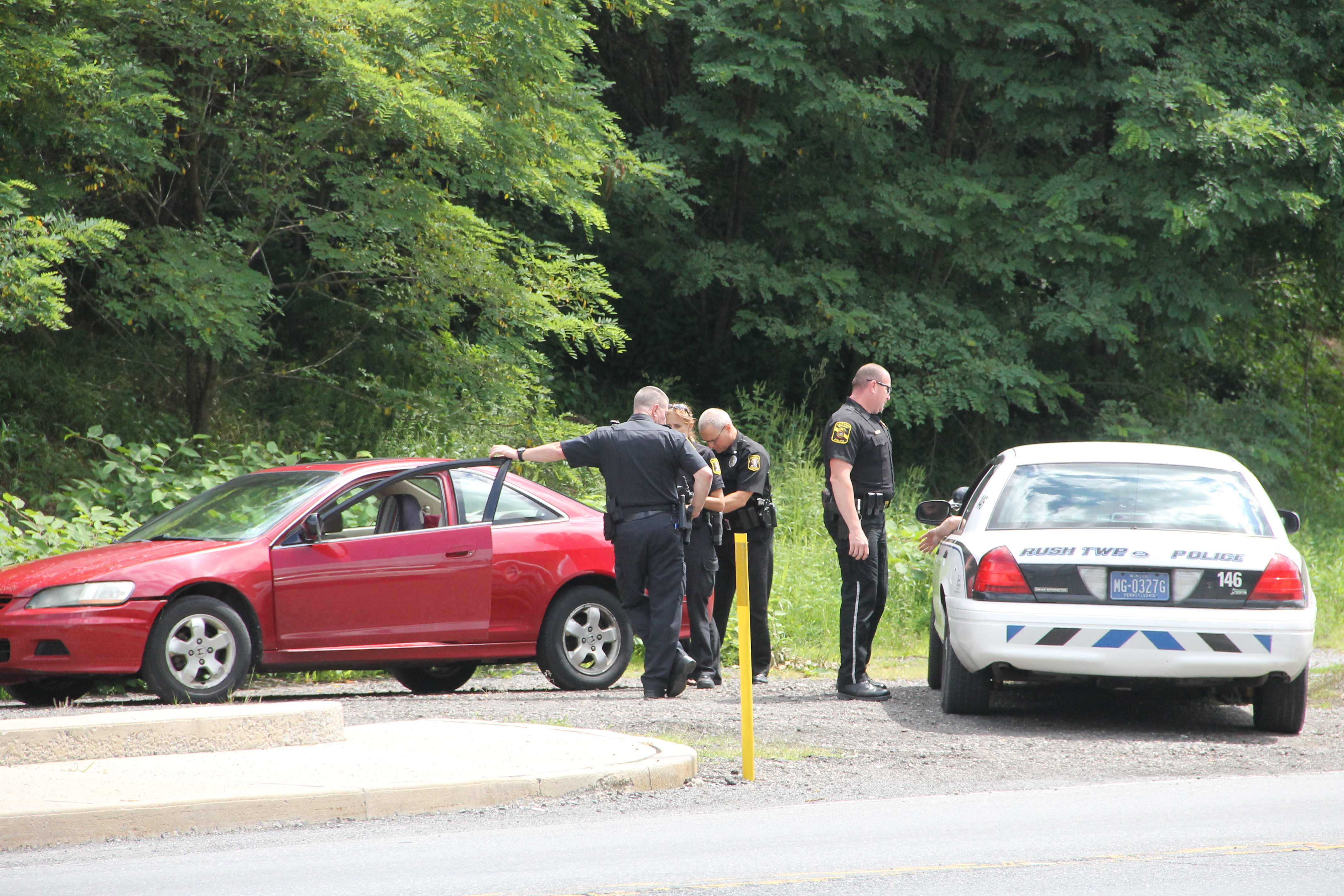 Pictured are photos taken around 1 PM yesterday (Thursday, August 14, 2014) along SR309 at the south end of Tamaqua (at the end of the Mermon Motors lot). Six local police vehicles surrounded an empty red two-door sedan (pictured).