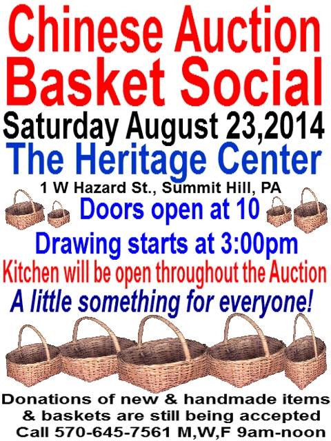 Members and volunteers with the Summit Hill Heritage Center are holding a Chinese Auction and Basket Social on Saturday, August 23, 2014 at the center.
