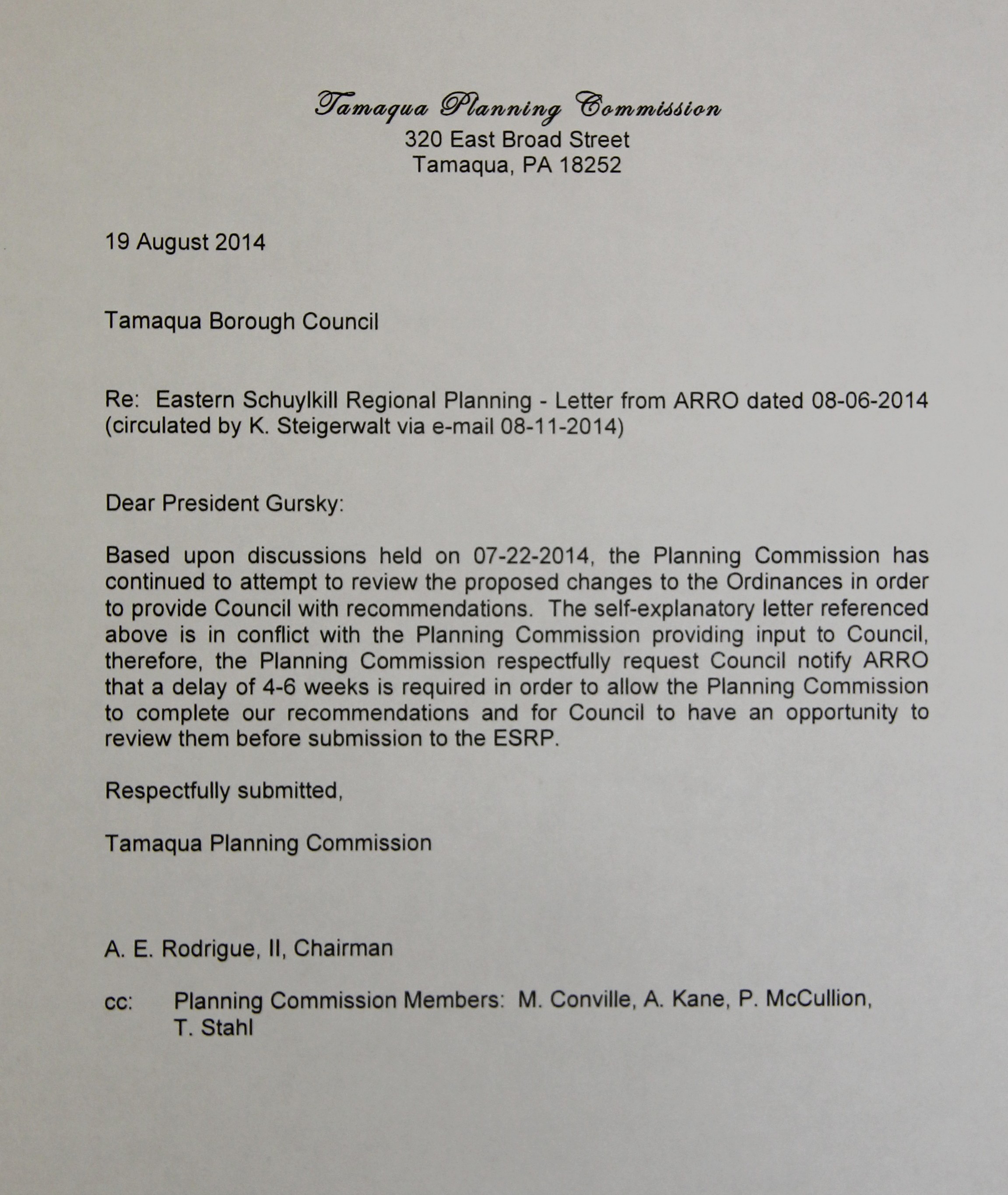 – Macalush read aloud correspondence from A.E. Rodrigue, II, Chairman, Tamaqua Planning Commission, in reply to the above mentioned correspondence from ARRO. (Click HERE to view it).