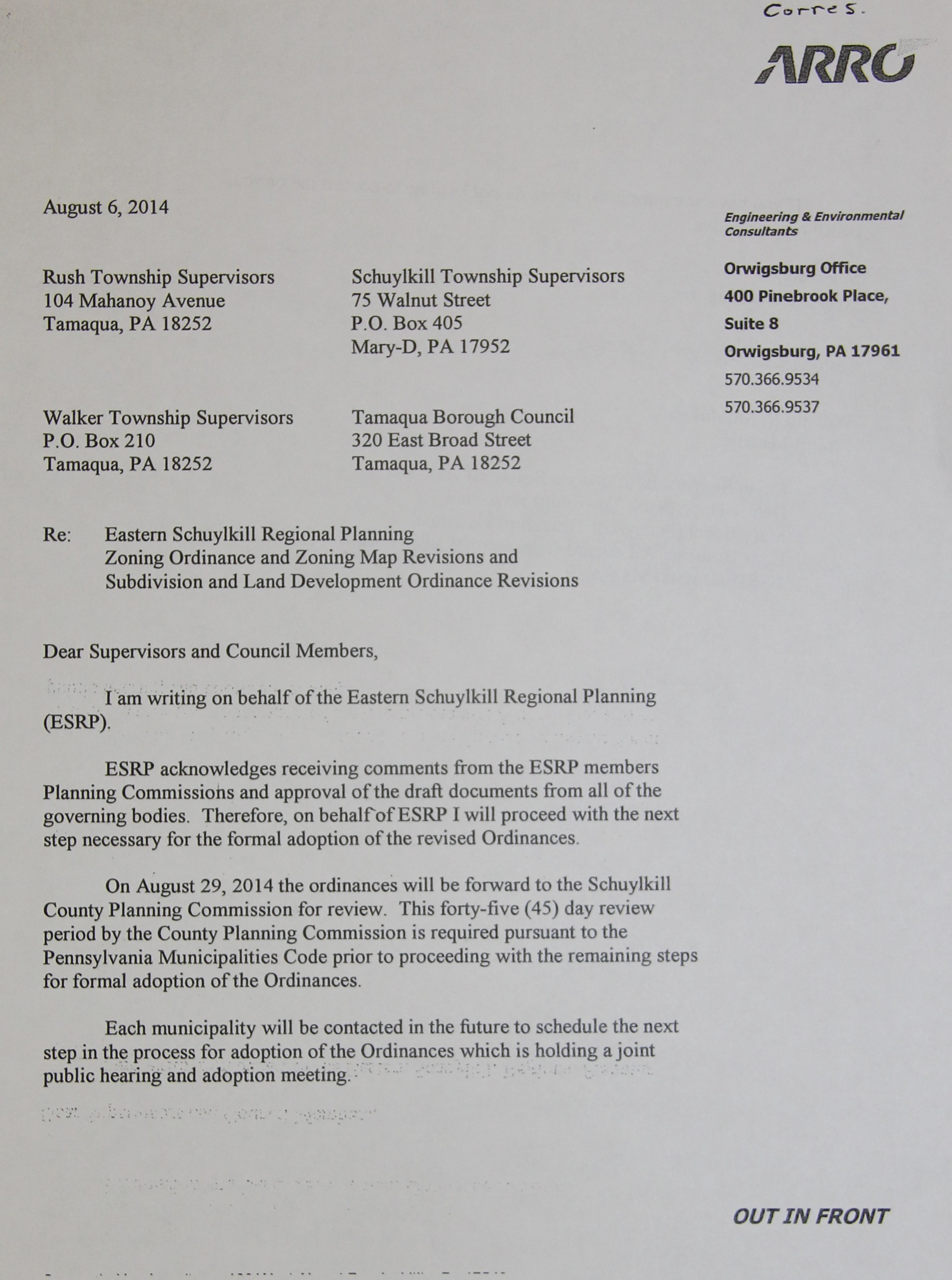 – Macalush read aloud correspondence from William McMullen of ARRO Consulting about Eastern Schuylkill Regional Planning (ESRP) Zoning Ordinance and Zoning Map Revisions and Subdivision and Land Development Ordinance Revisions to the Tamaqua Planning Commission. (Click HERE to view it).