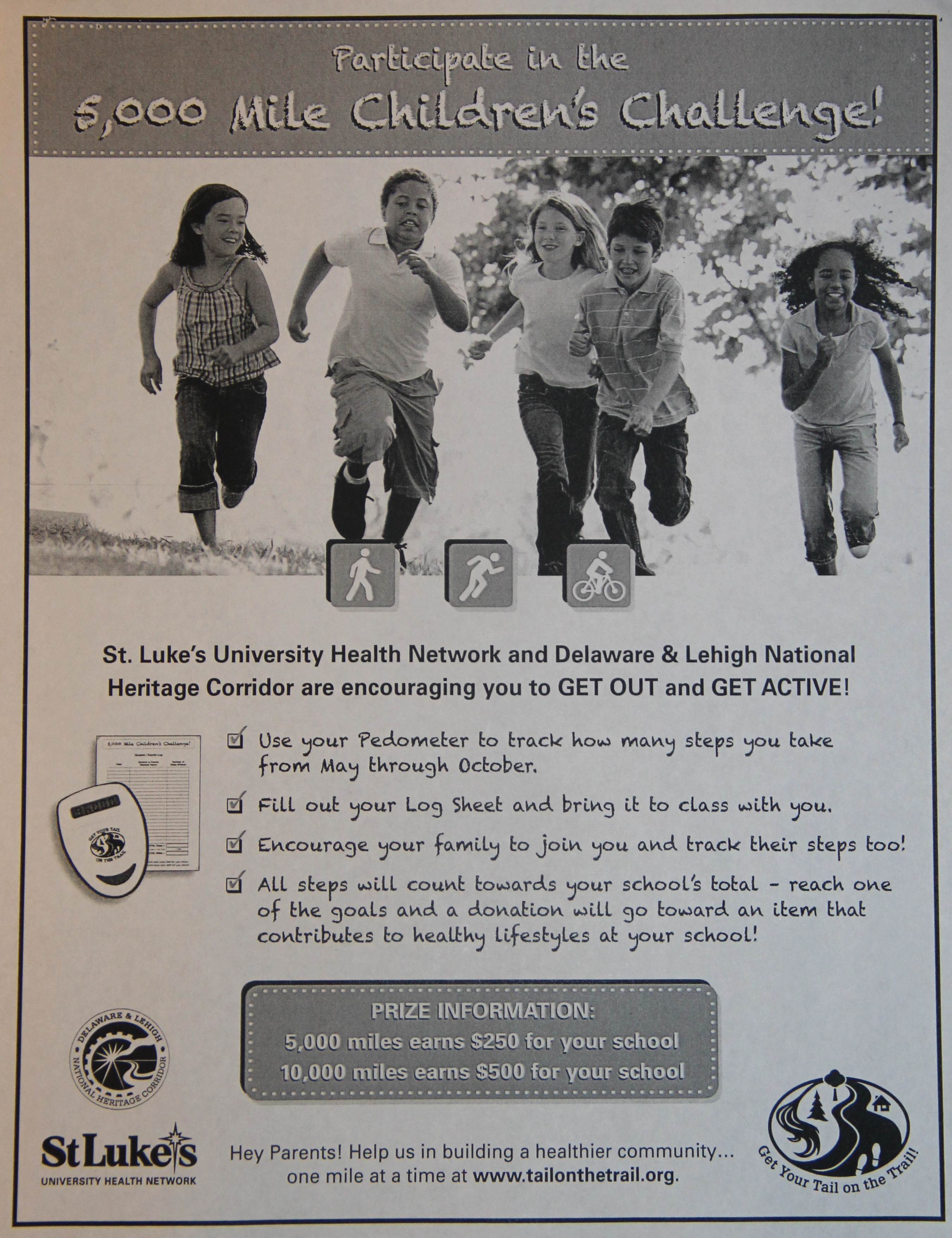 Log your miles via the Trail Tracker on the Get Your Tail on the Trail website and receive great prizes as you achieve your milestone goals. Looking for more of a challenge? Double (330) or Triple (495) your miles and earn extra prizes! Help us in building a healthier community… one mile at a time.