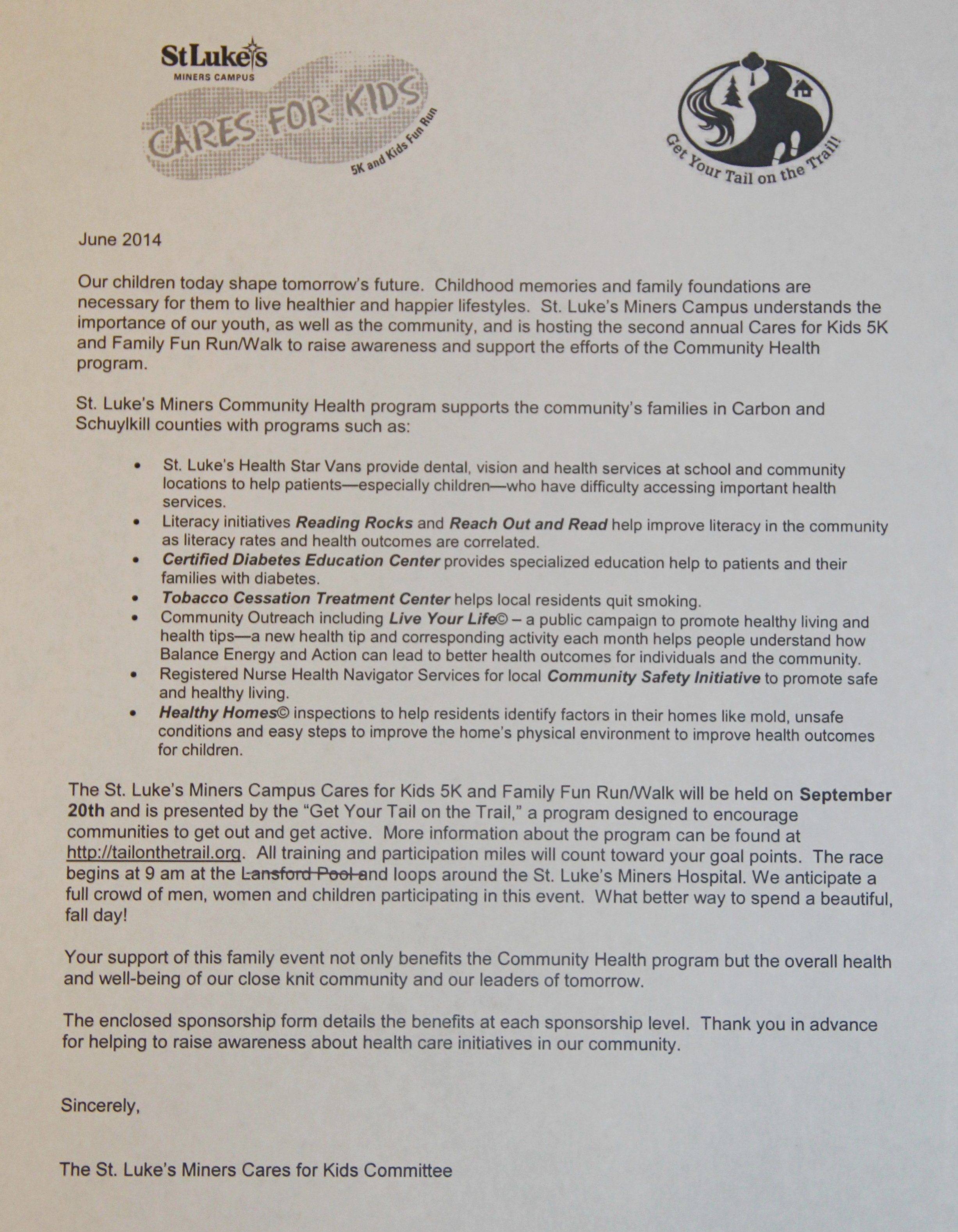 Join us for Monday’s on the track as we prepare for St. Luke’s 2nd Annual Care for Kids Run/Walk & Kids Fun Run, a Get Your Tail on the Trail approved event, to be held at 10 AM on September 20, 2014, beginning at St. Luke’s Miners Campus. Register by September 7, 2014 and receive a commemorative t-shirt. All proceeds from the 2014 Care for Kids Run/Walk will benefit St. Luke’s Miners Community Health, which provides free services to the surrounding communities’ children and adults. For more information about St. Luke’s 2nd Annual Care for Kids Run/Walk & Kids Fun Run, please contact Michelle Bowman at (570) 773-3500 or bowmanmi@slhn.org.