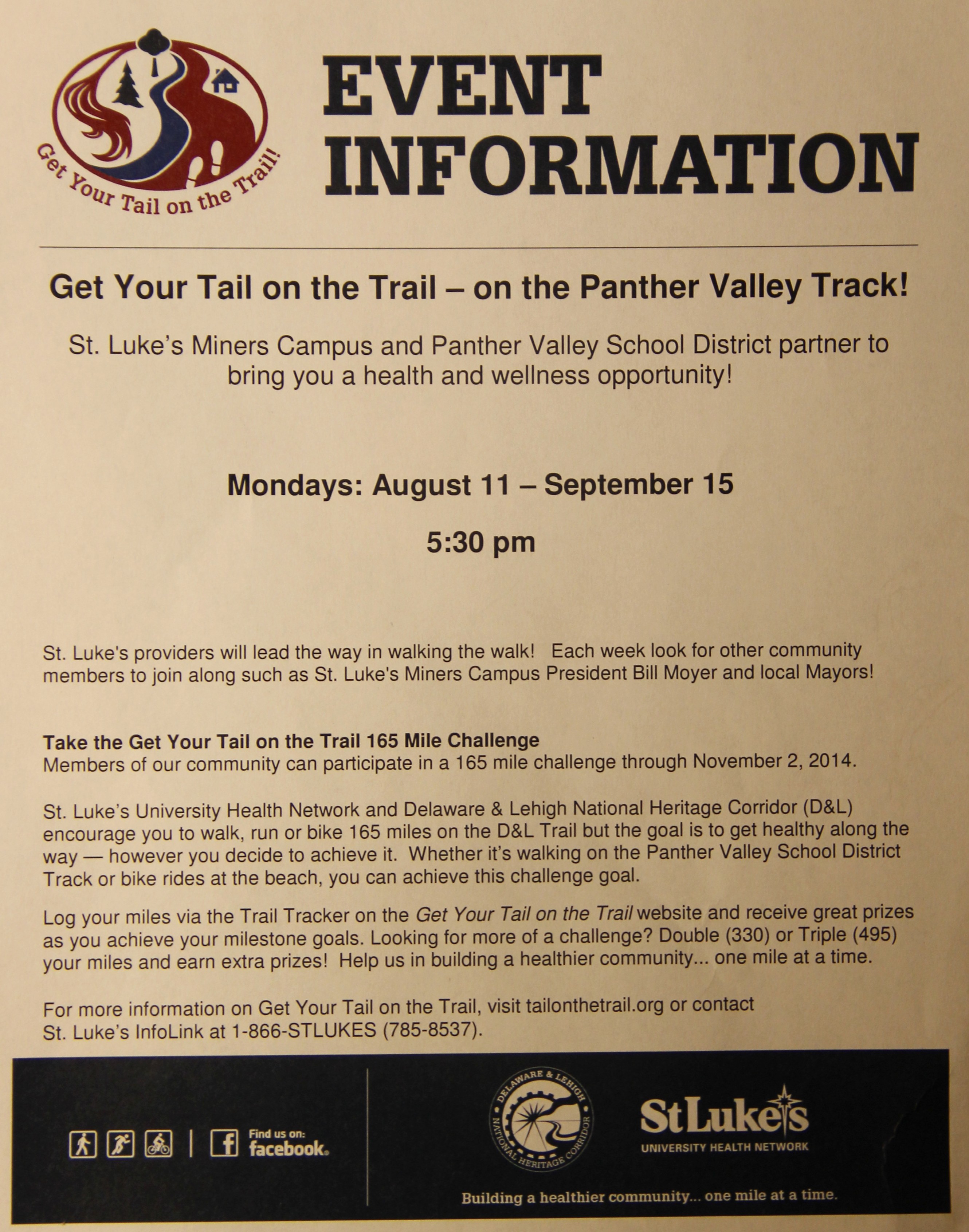 St. Luke’s University Health Network and Delaware & Lehigh National Heritage Corridor (D&L) partnered with the Panther Valley School District to hold their annual ‘Get Your Tail on the Trail’ event recently at the Panther Valley Stadium in Lansford.