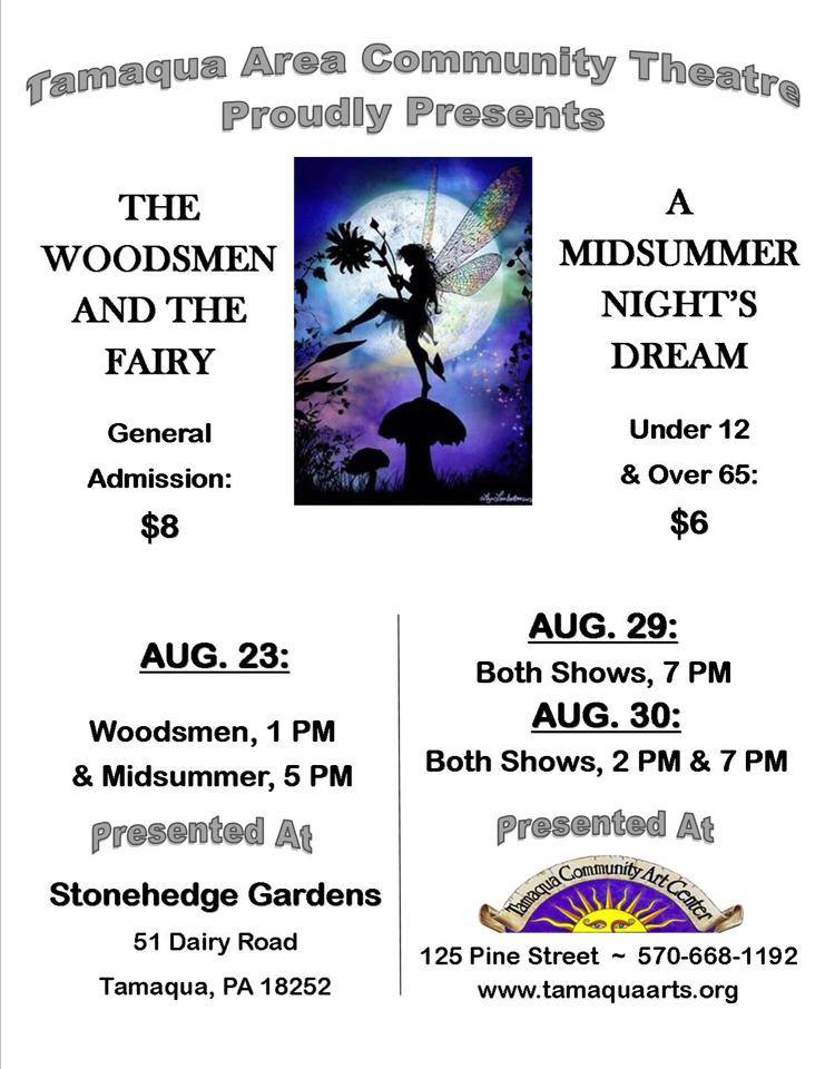 Actors, actresses, and volunteers with the Tamaqua Area Community Theatre are presenting their combined performances of ‘The Woodsmen and the Fairy’ & ‘A Midsummer Night’s Dream’ at the Tamaqua Community Arts Center on Friday, August 29, 2014 at 7 PM and Saturday, August 30, 2014 at 2 PM and 7 PM.