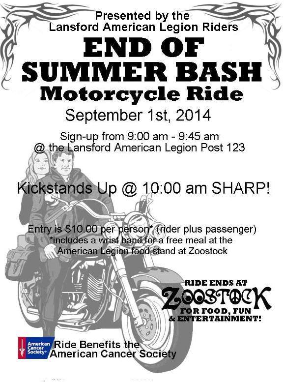 Members and volunteers with the Lansford American Legion Riders are holding an End of Summer Bash Motorcycle Ride on Monday, September 1, 2014 (Labor Day).