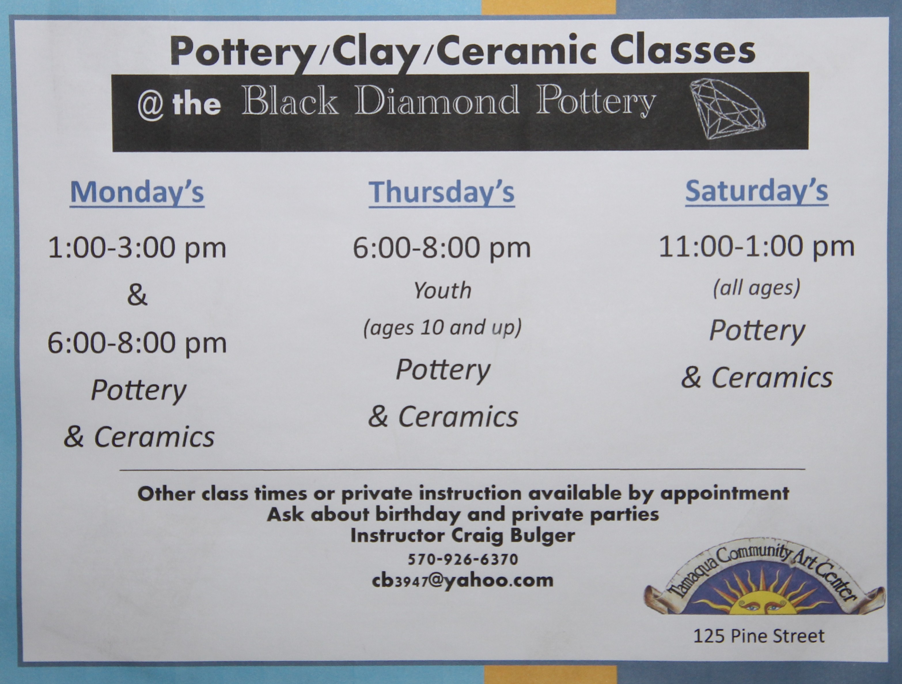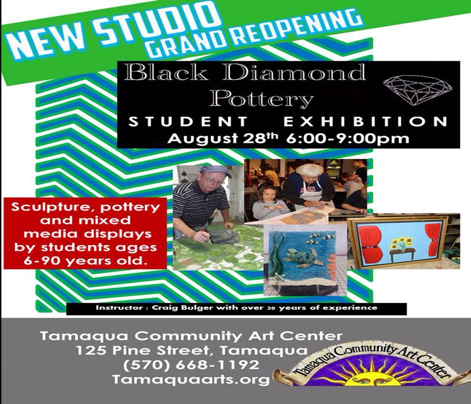 Volunteers and students with the Black Diamond Pottery of the Tamaqua Community Arts Center are holding a student exhibition on Thursday, August 28, 2014 from 6 PM to 9 PM at the center.