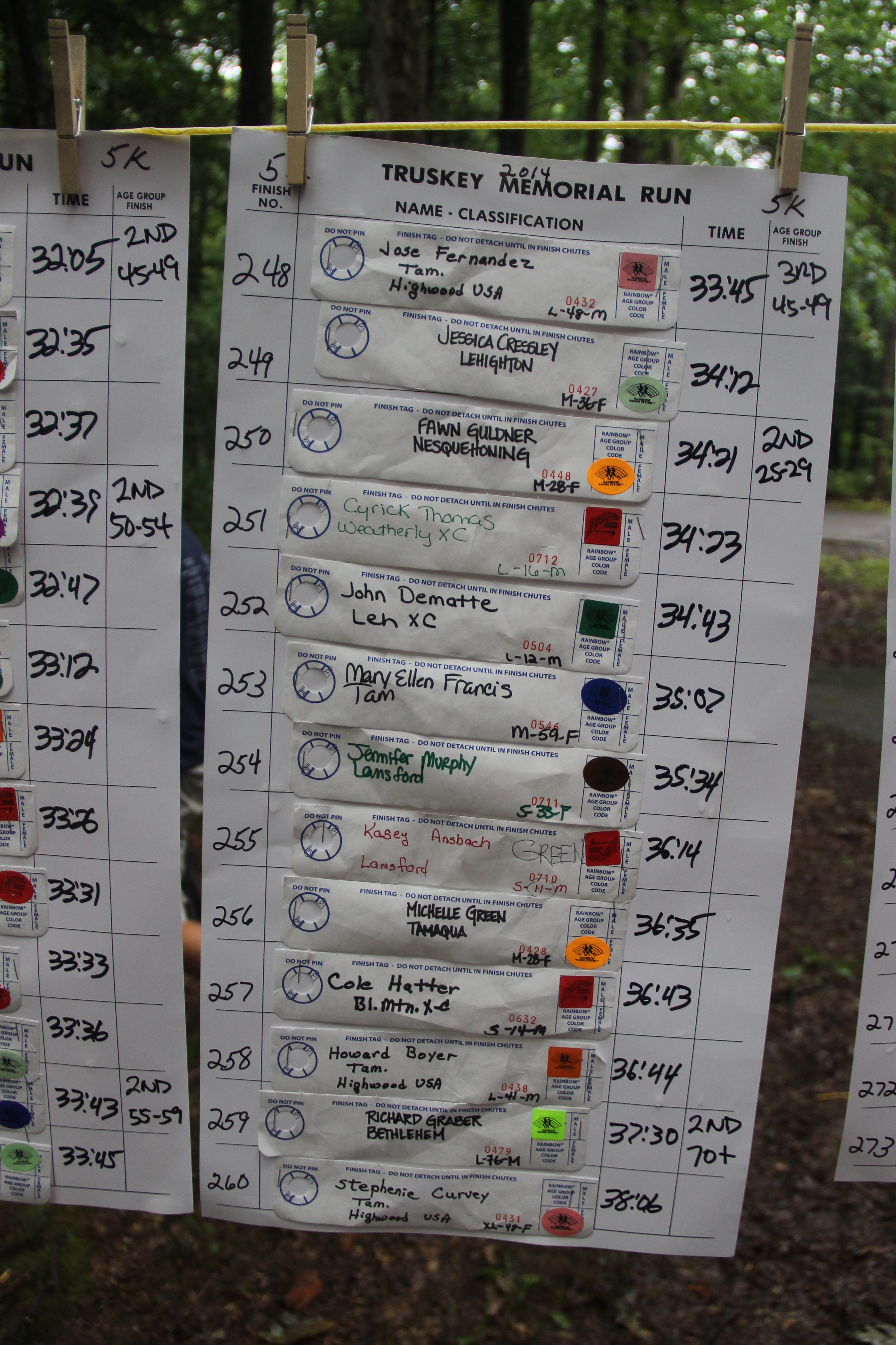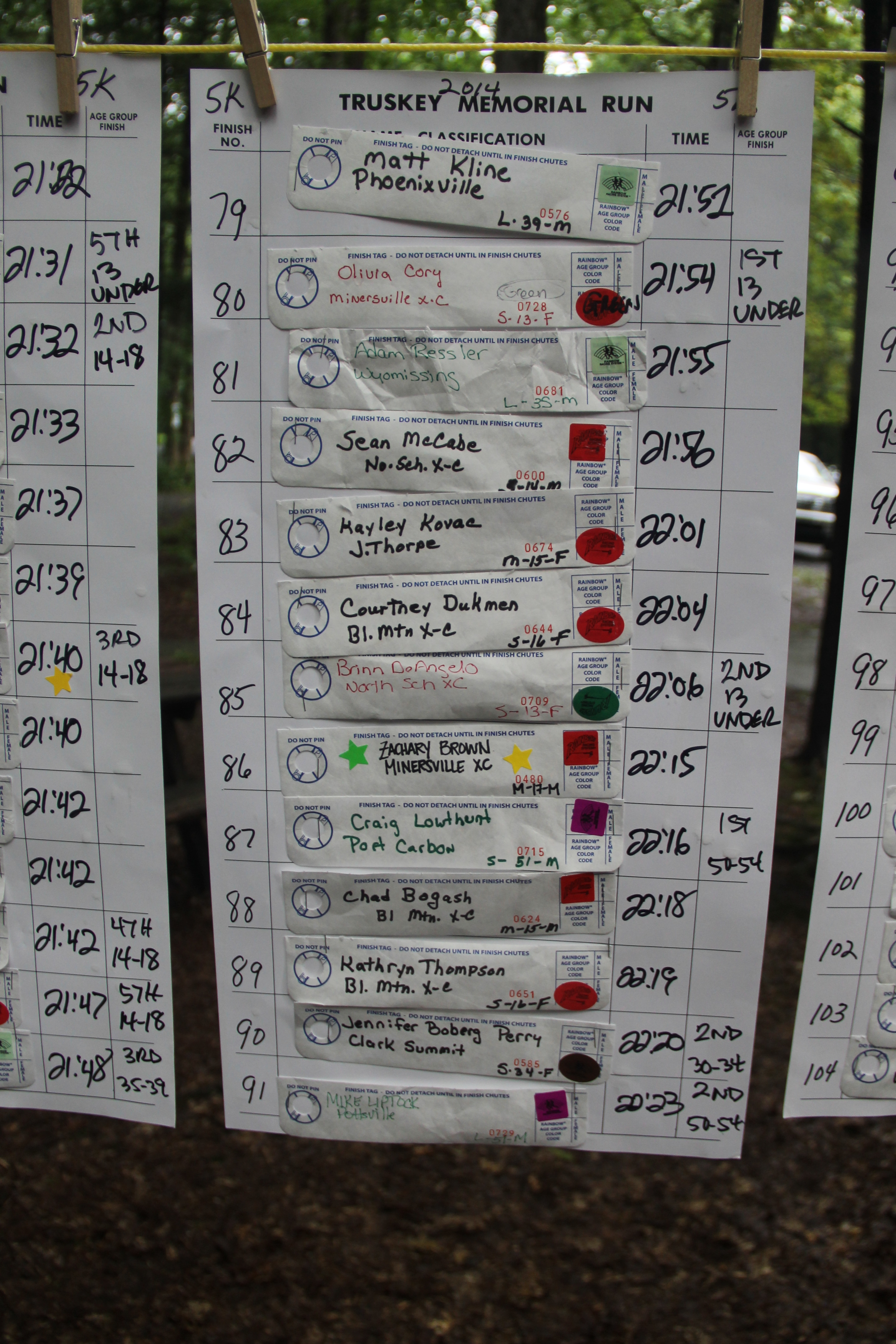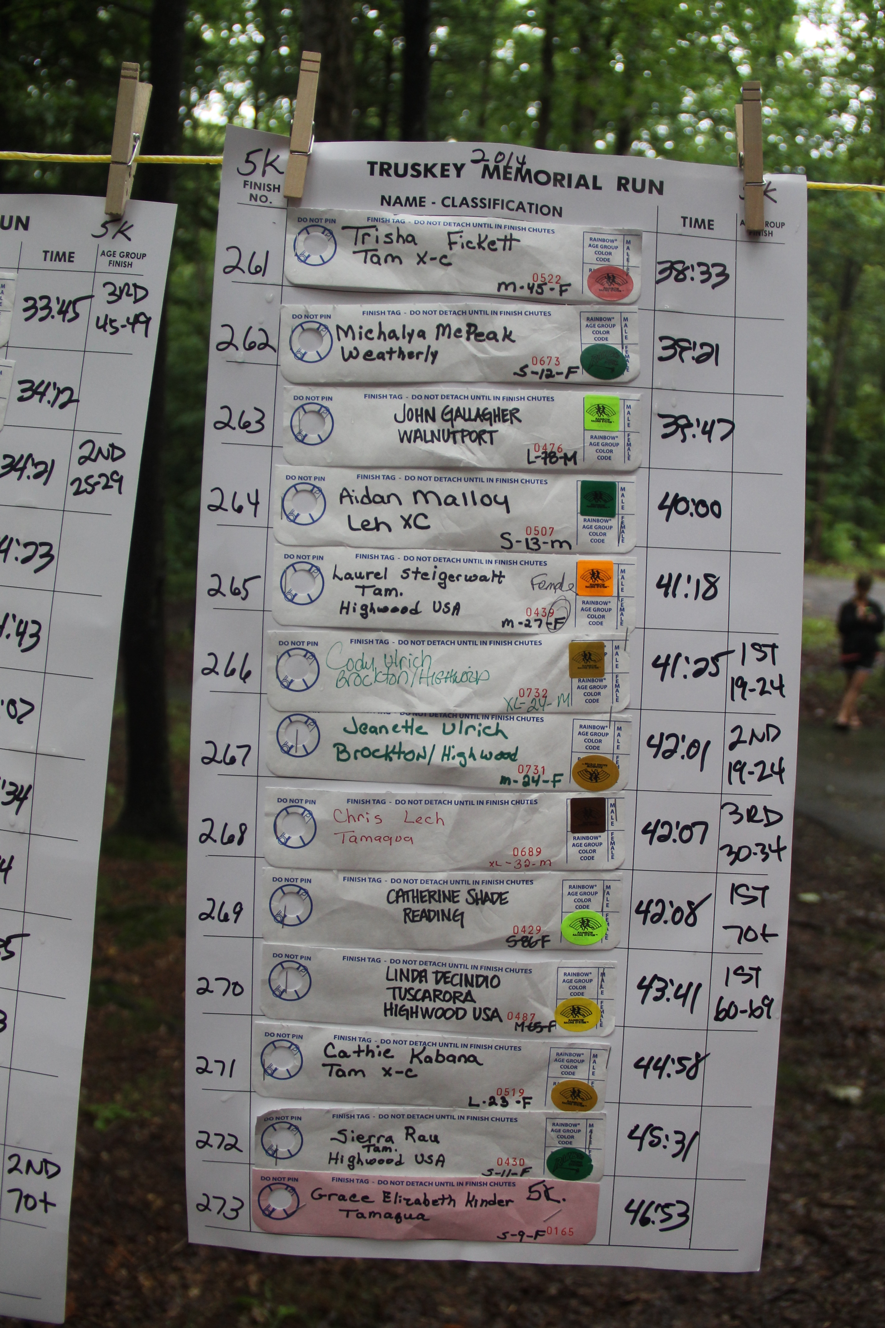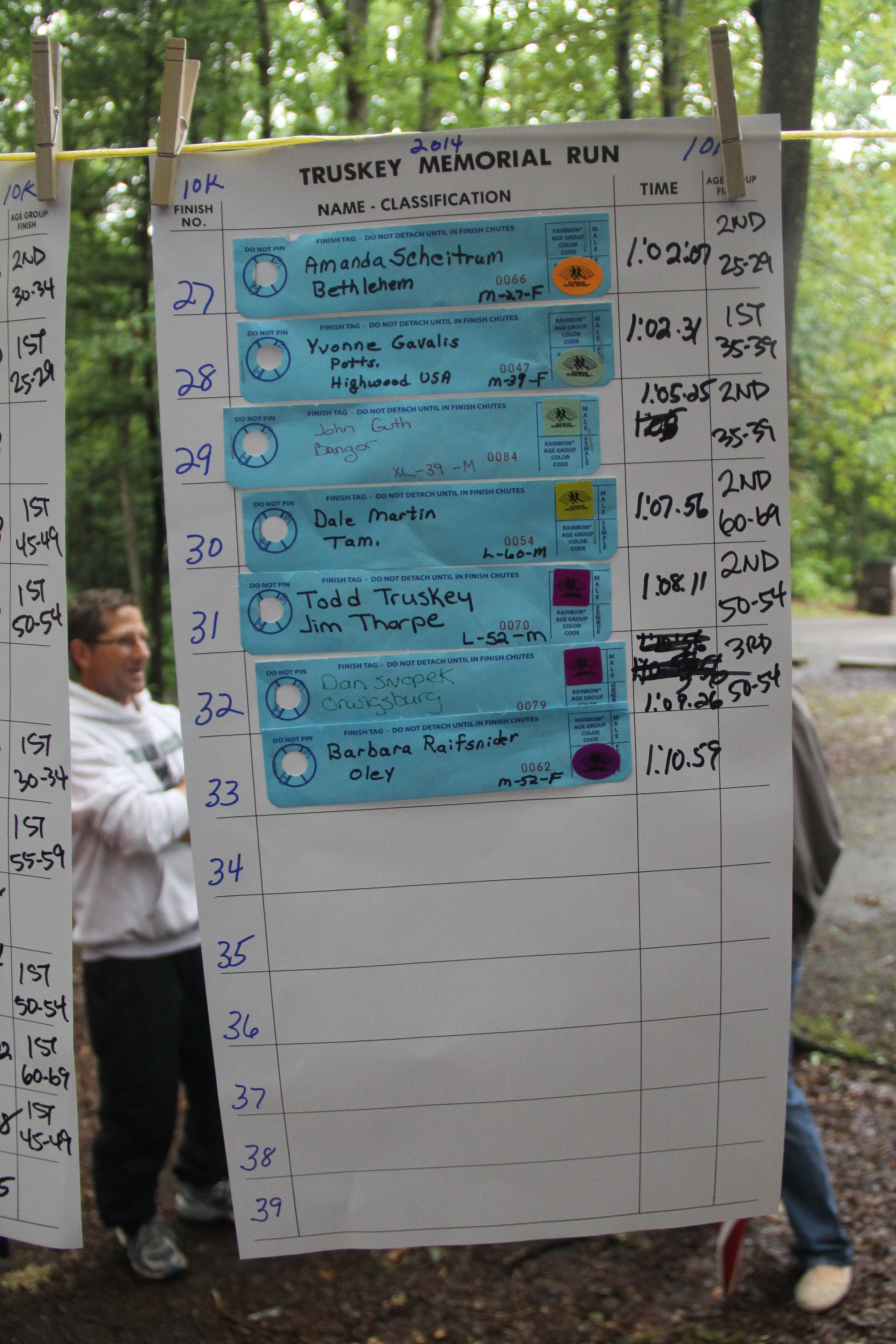 Below are photos of the written time sheets on display following the Chris & Kevin Truskey Memorial 5K & 10K Run/Walk held last Saturday (August 23, 2014) at the Tuscarora State Park. They contain the names, placements and times of all the participants.