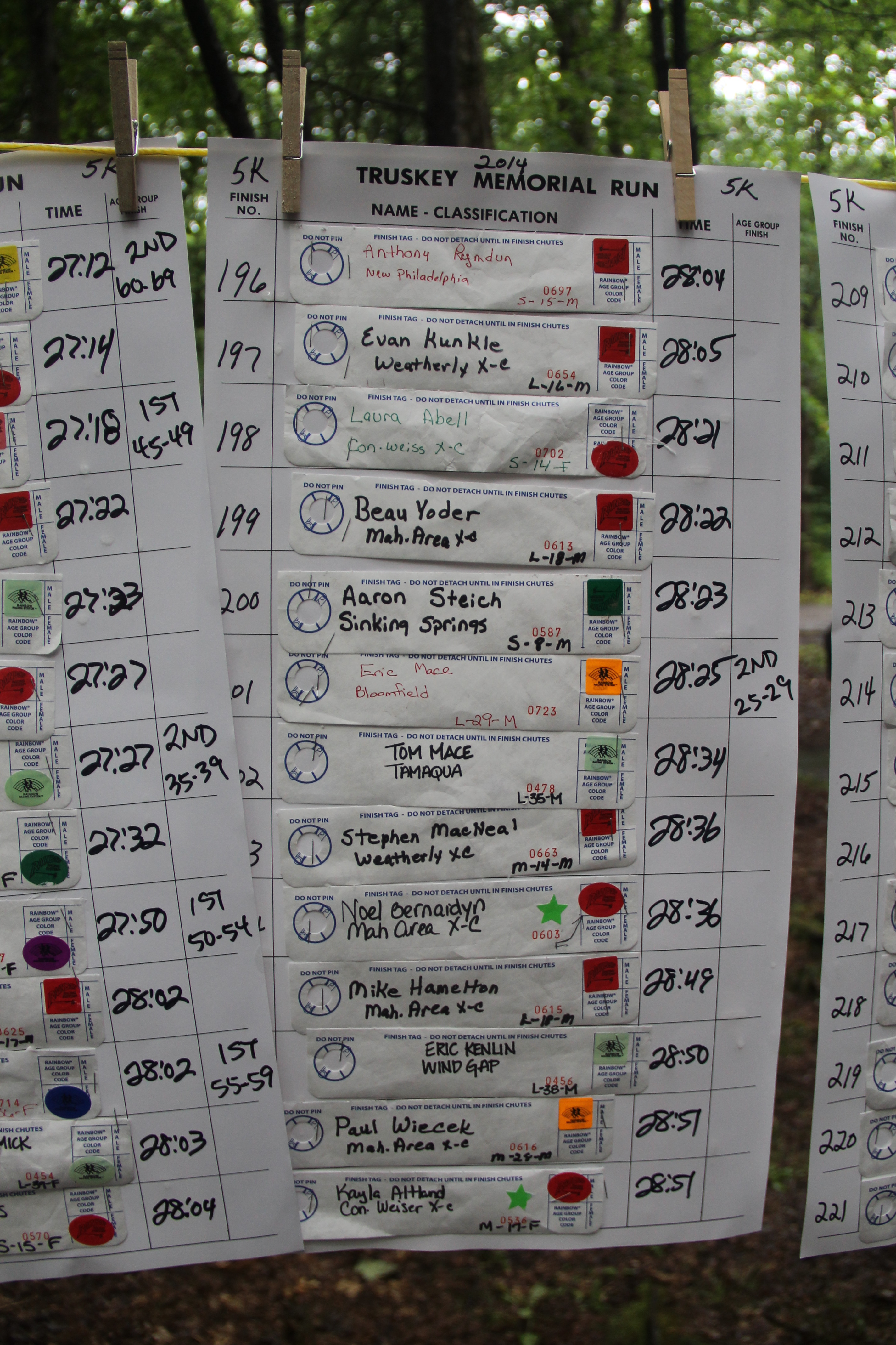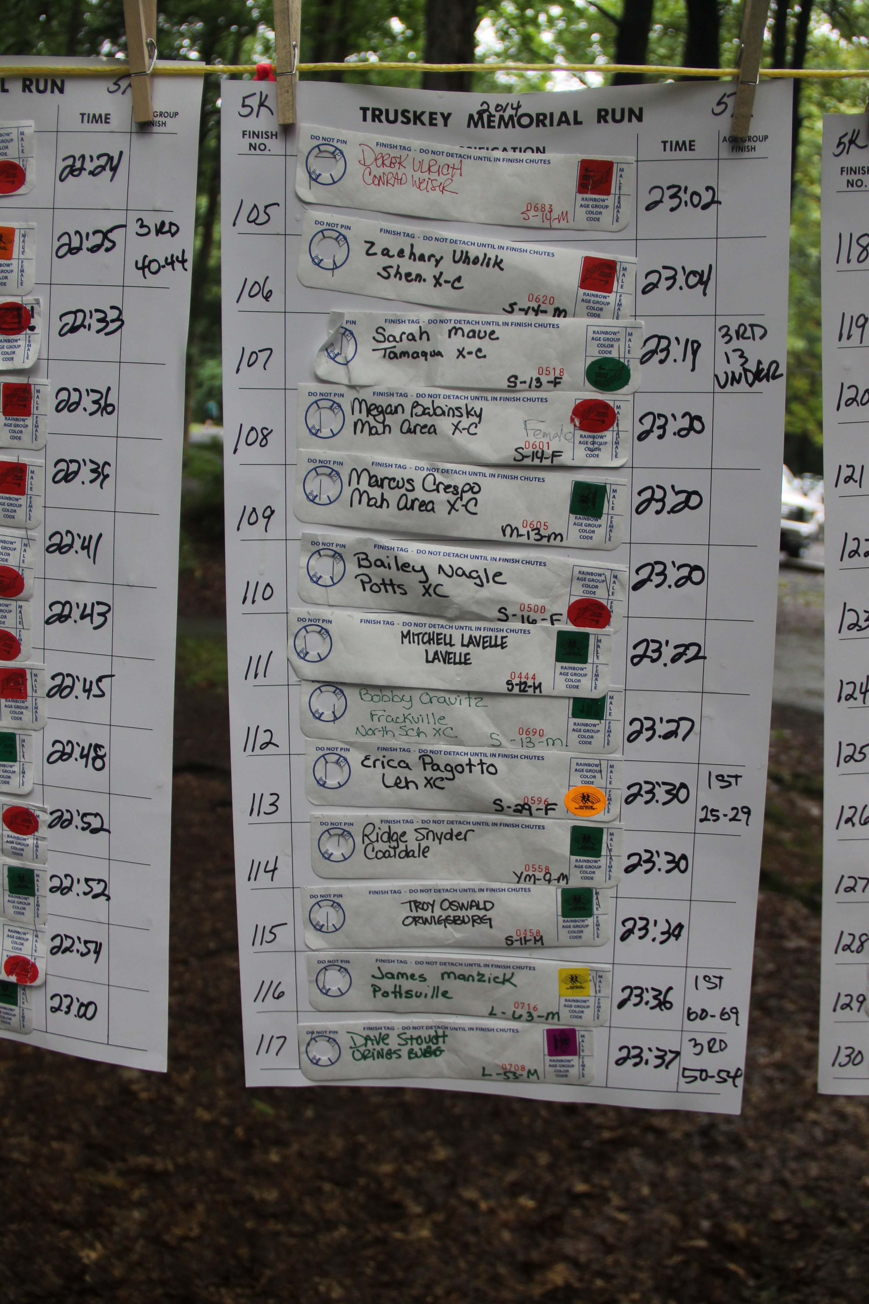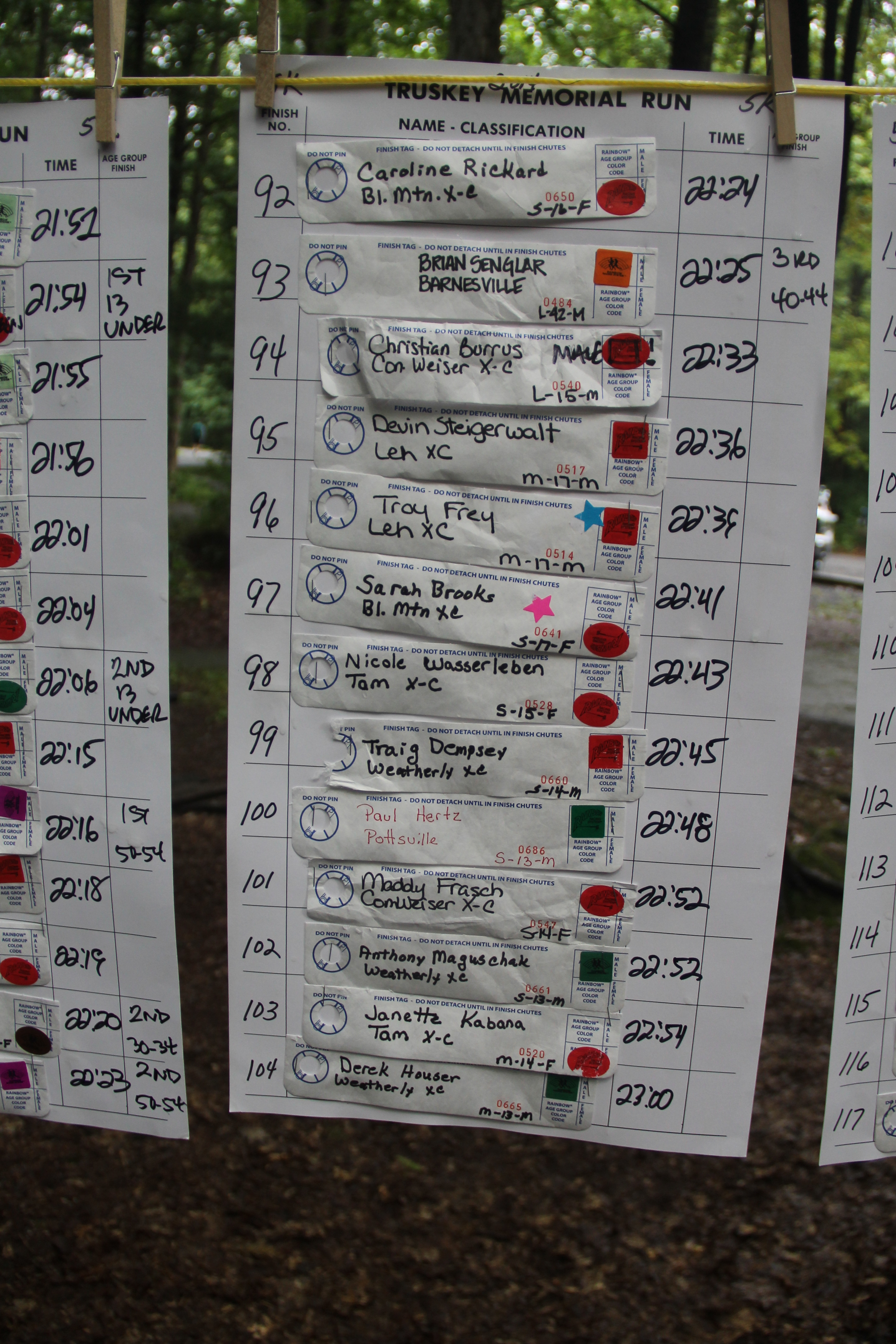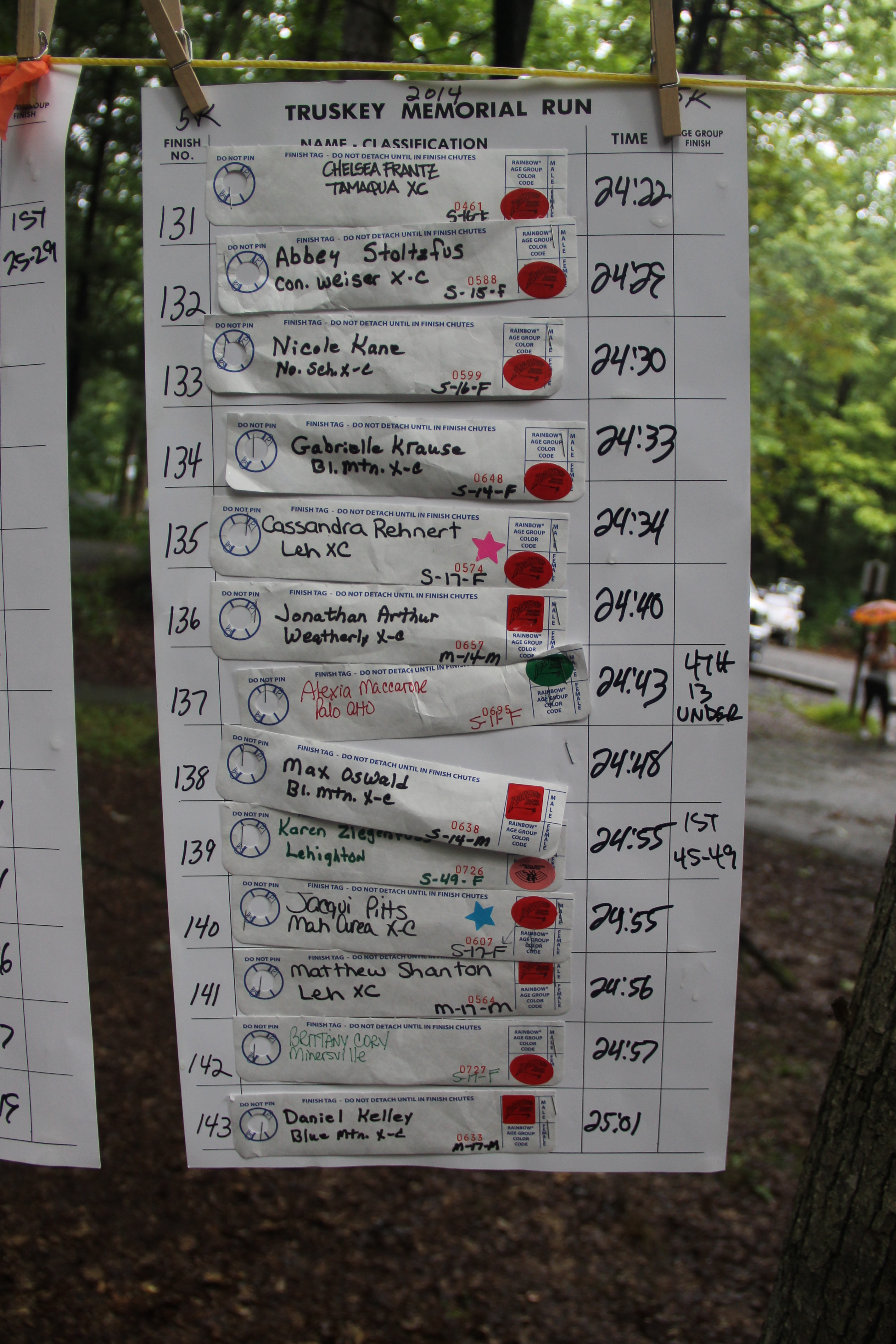 Below are photos of the written time sheets on display following the Chris & Kevin Truskey Memorial 5K & 10K Run/Walk held last Saturday (August 23, 2014) at the Tuscarora State Park. They contain the names, placements and times of all the participants.