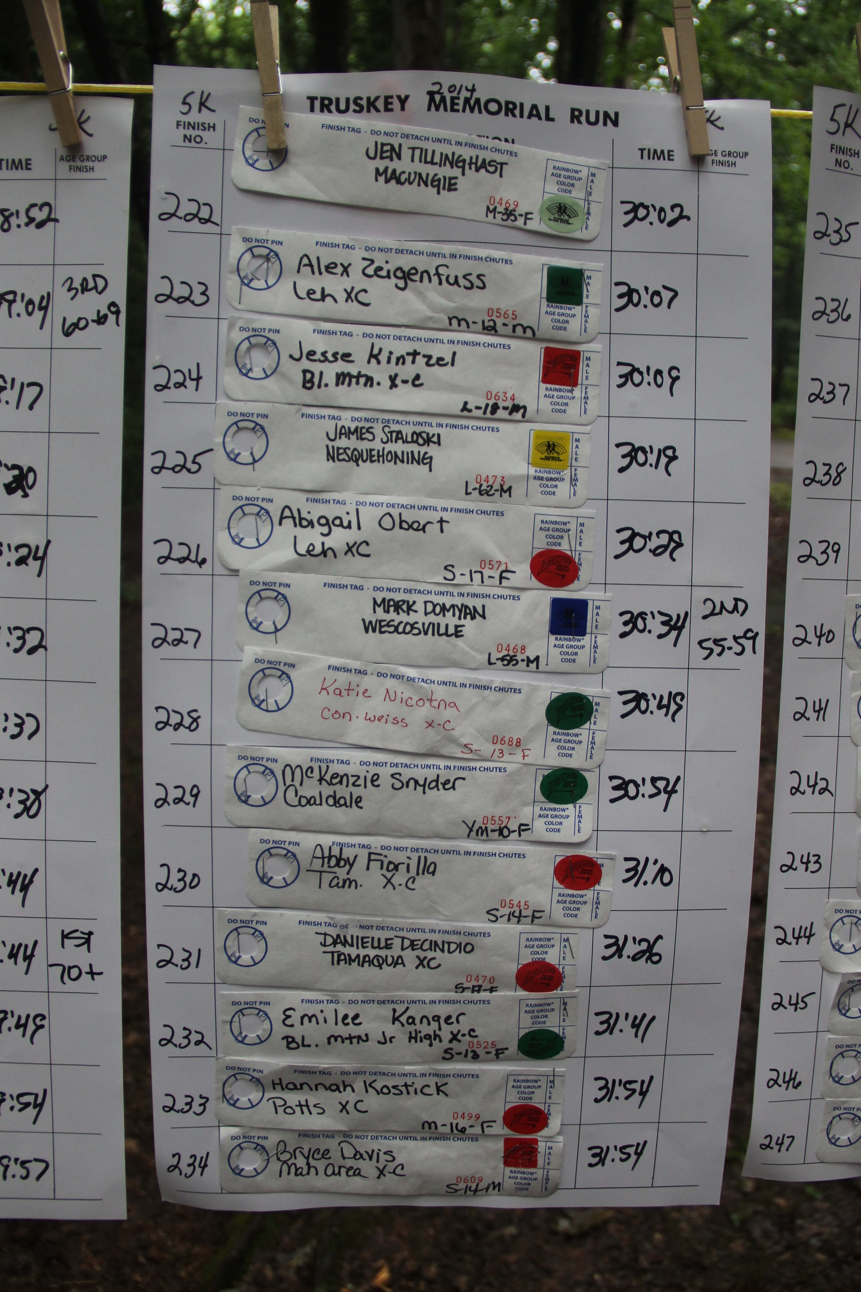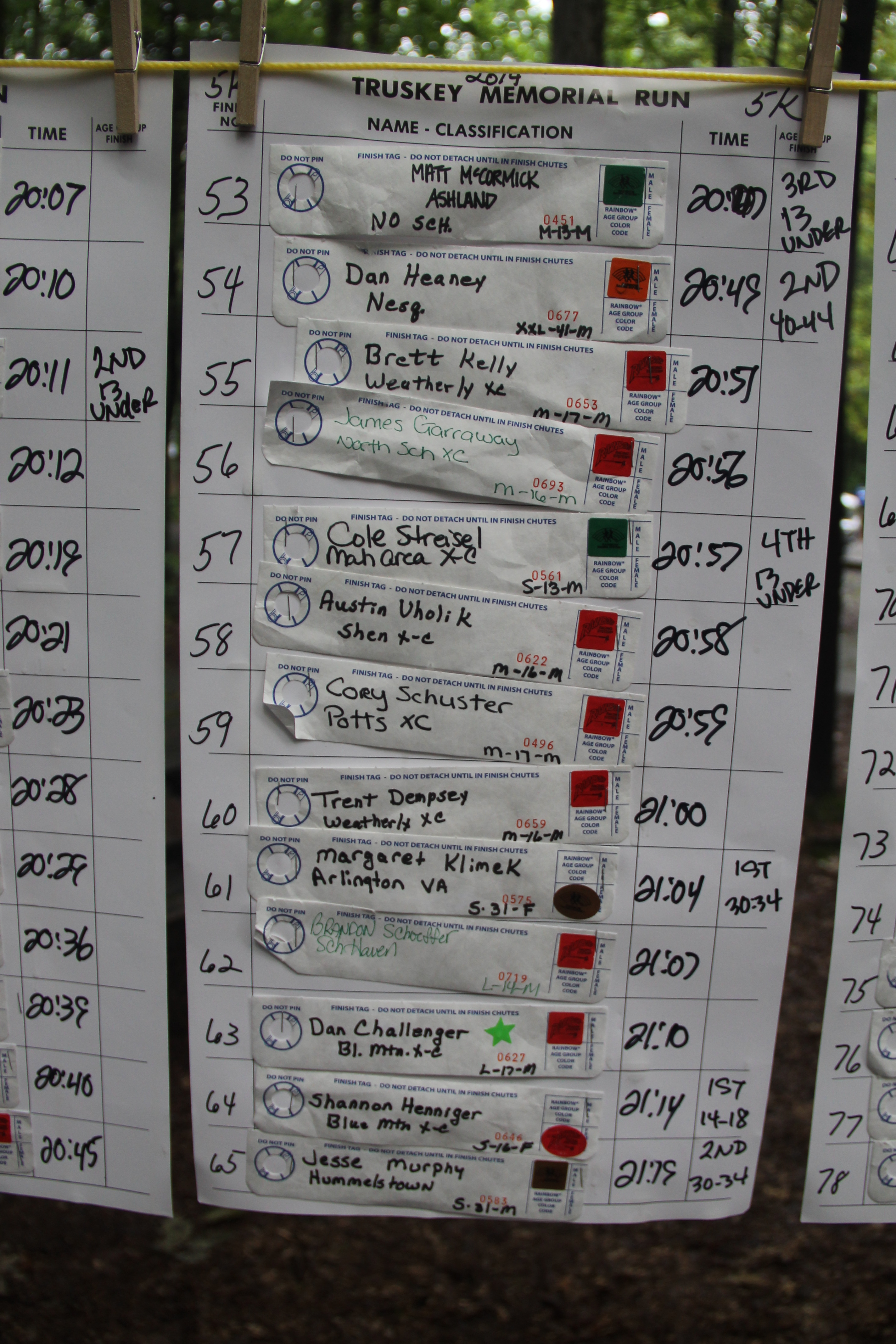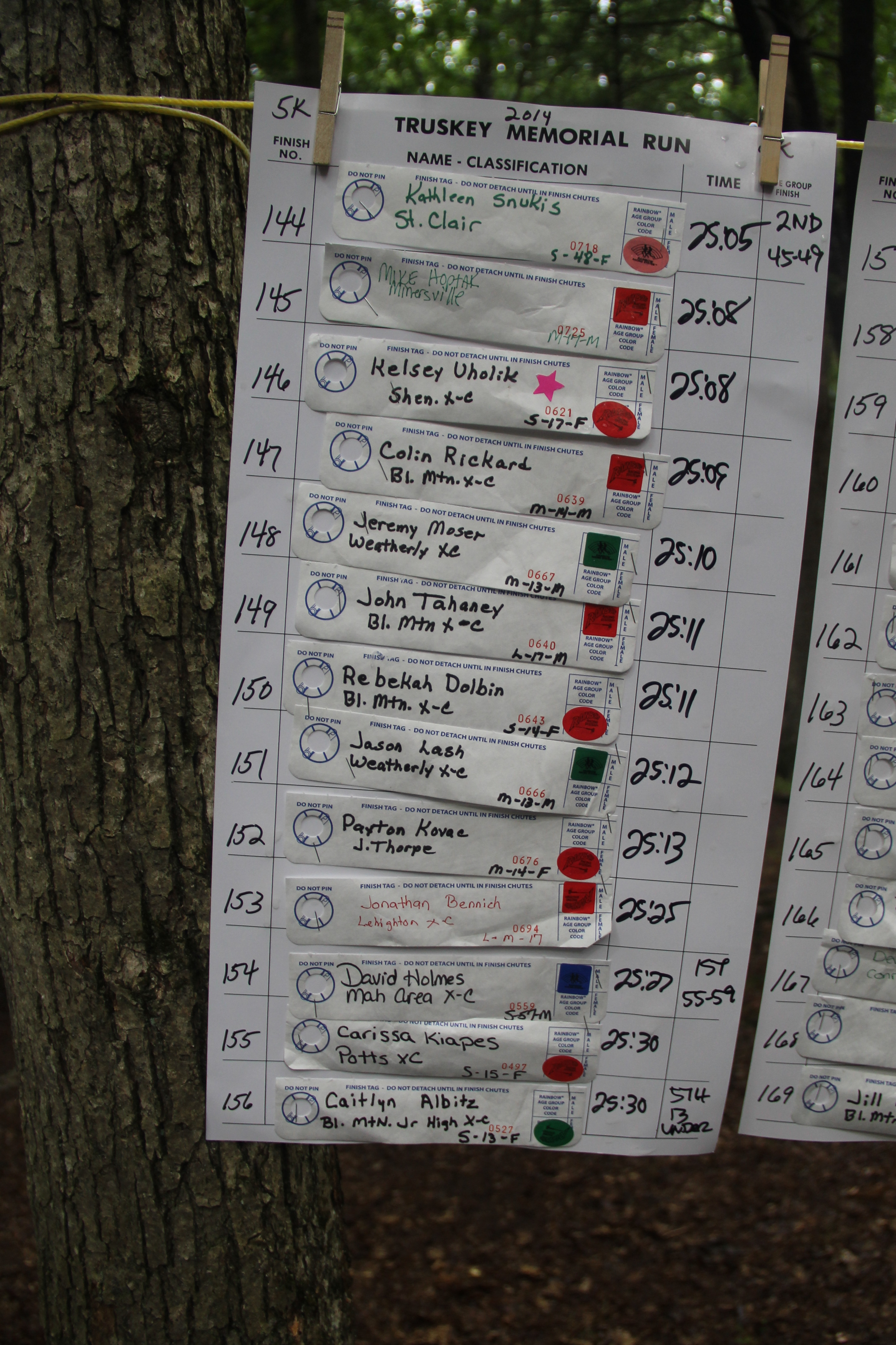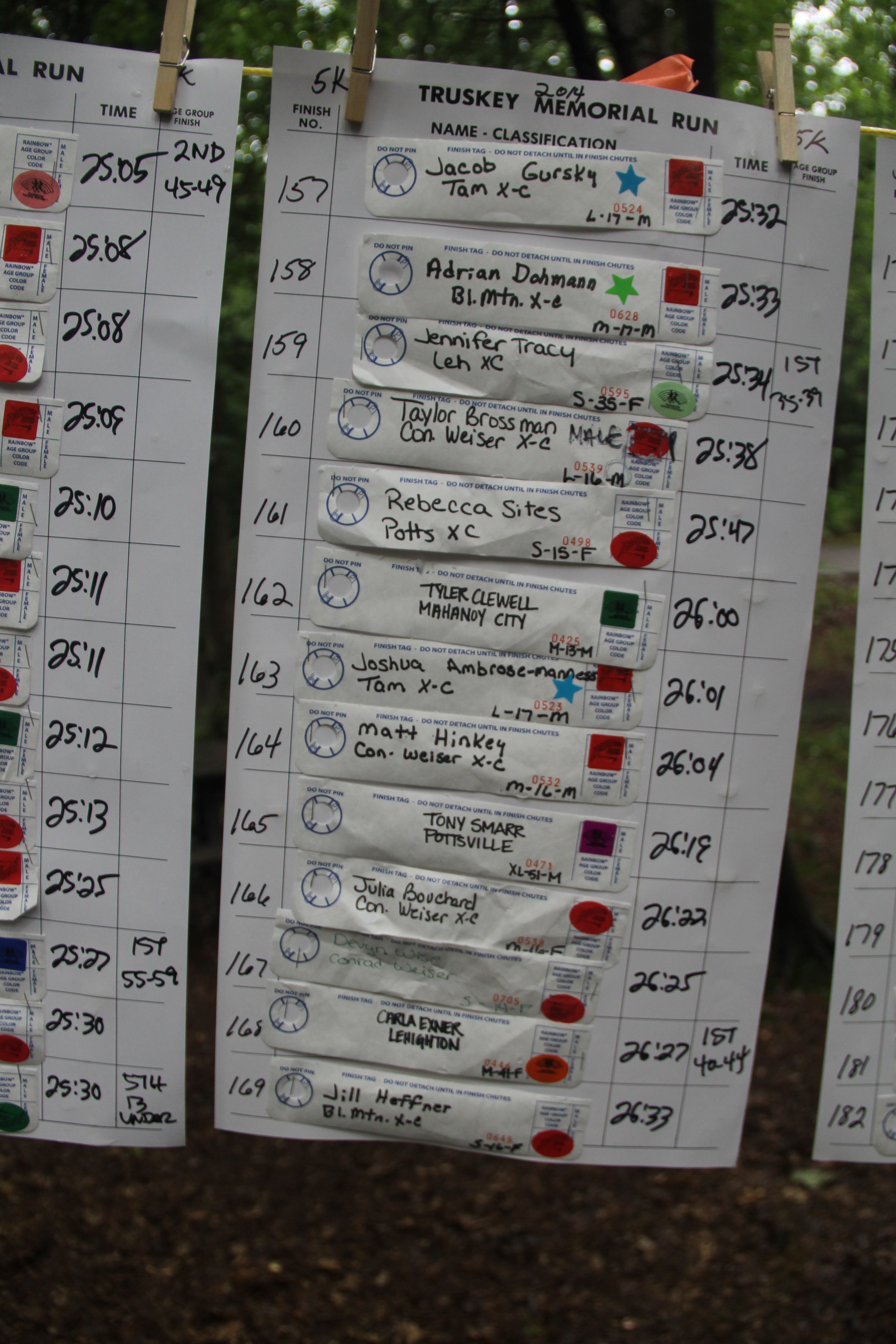 Below are photos of the written time sheets on display following the Chris & Kevin Truskey Memorial 5K & 10K Run/Walk held last Saturday (August 23, 2014) at the Tuscarora State Park. They contain the names, placements and times of all the participants.
