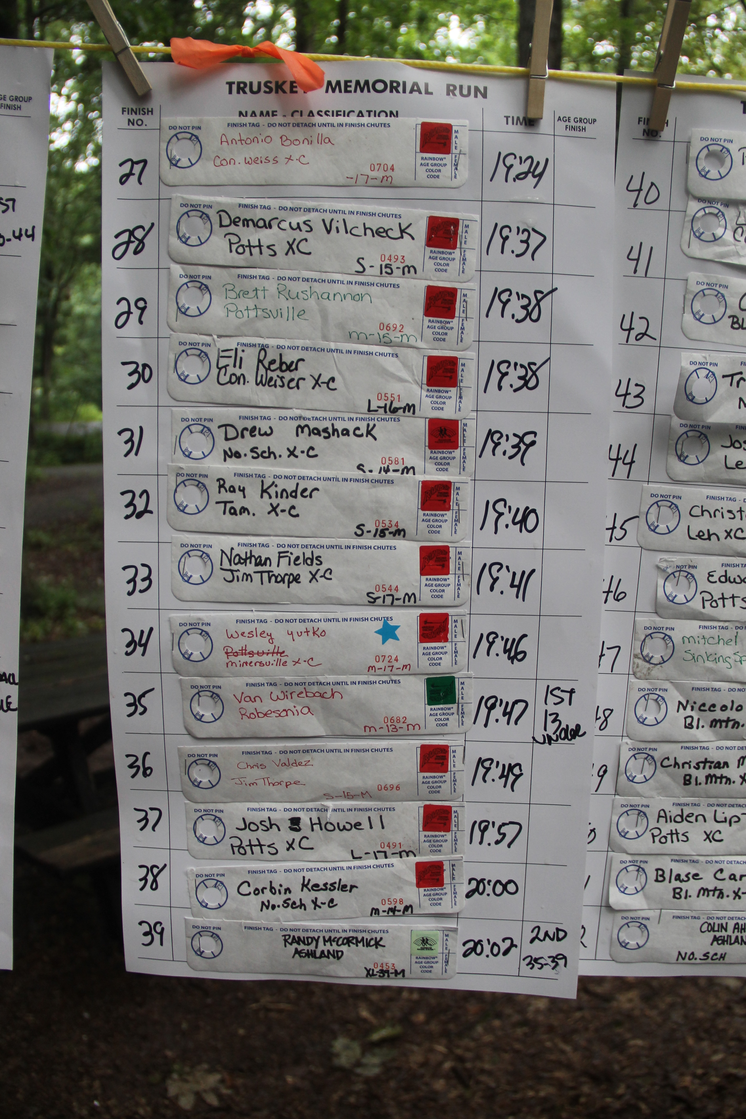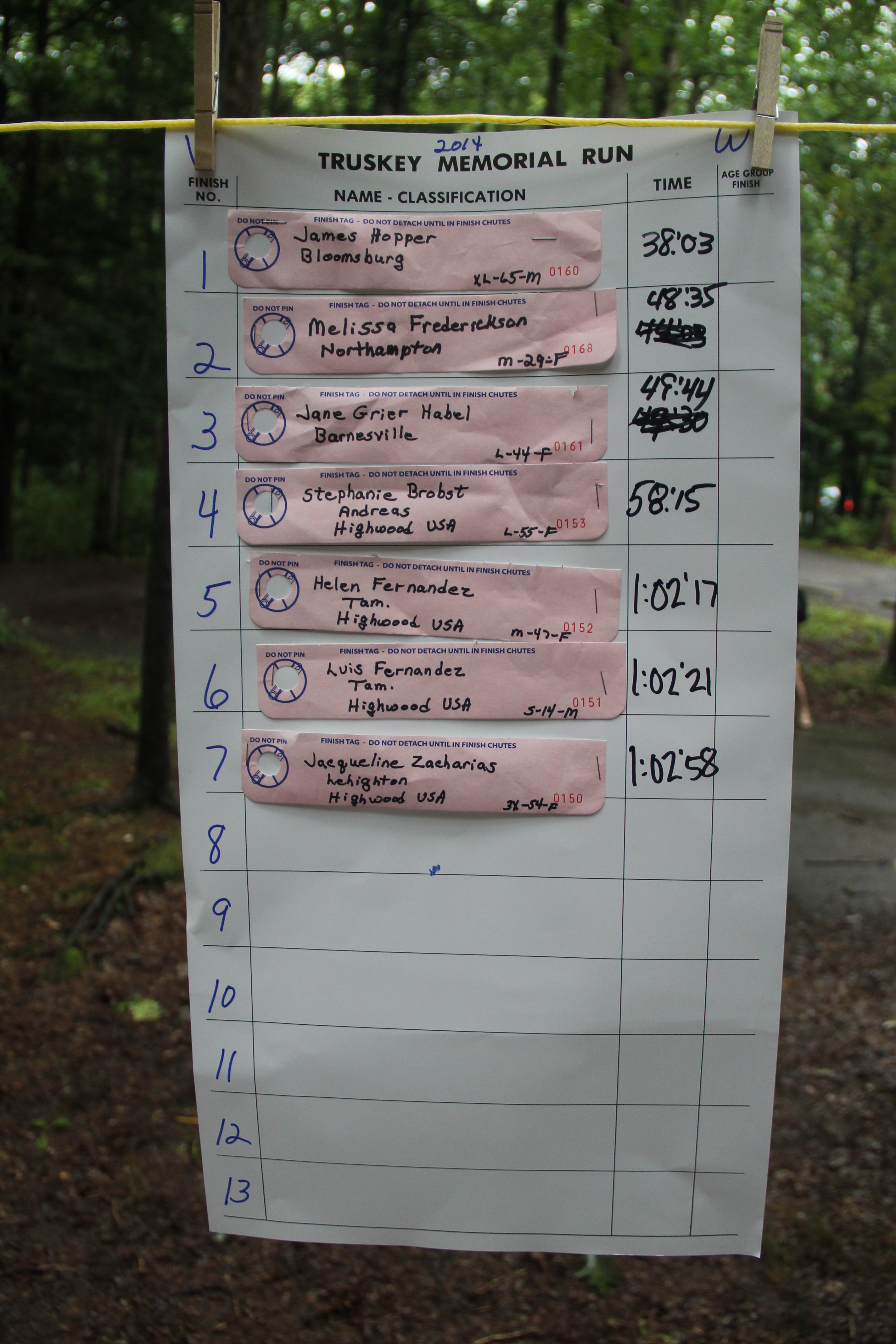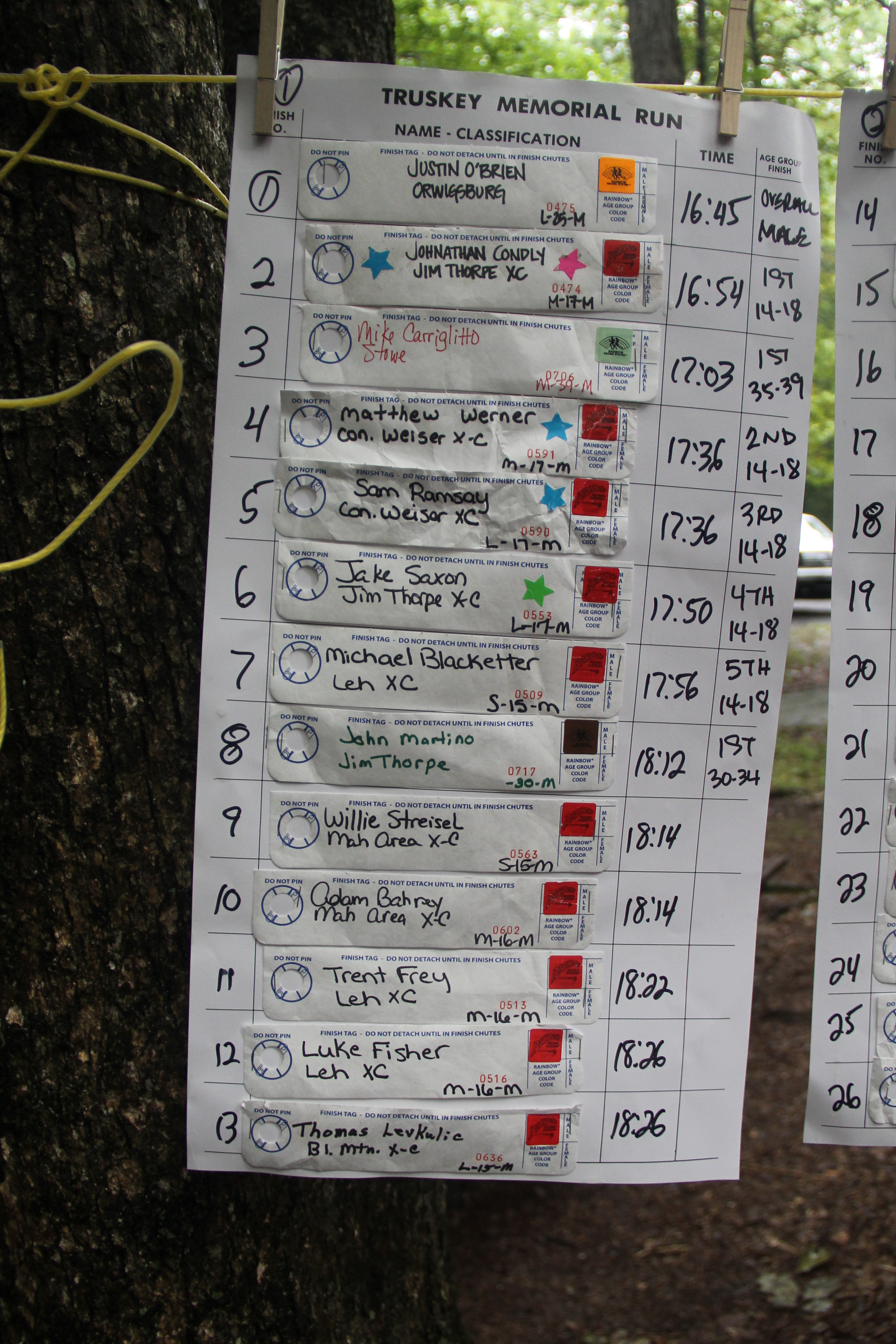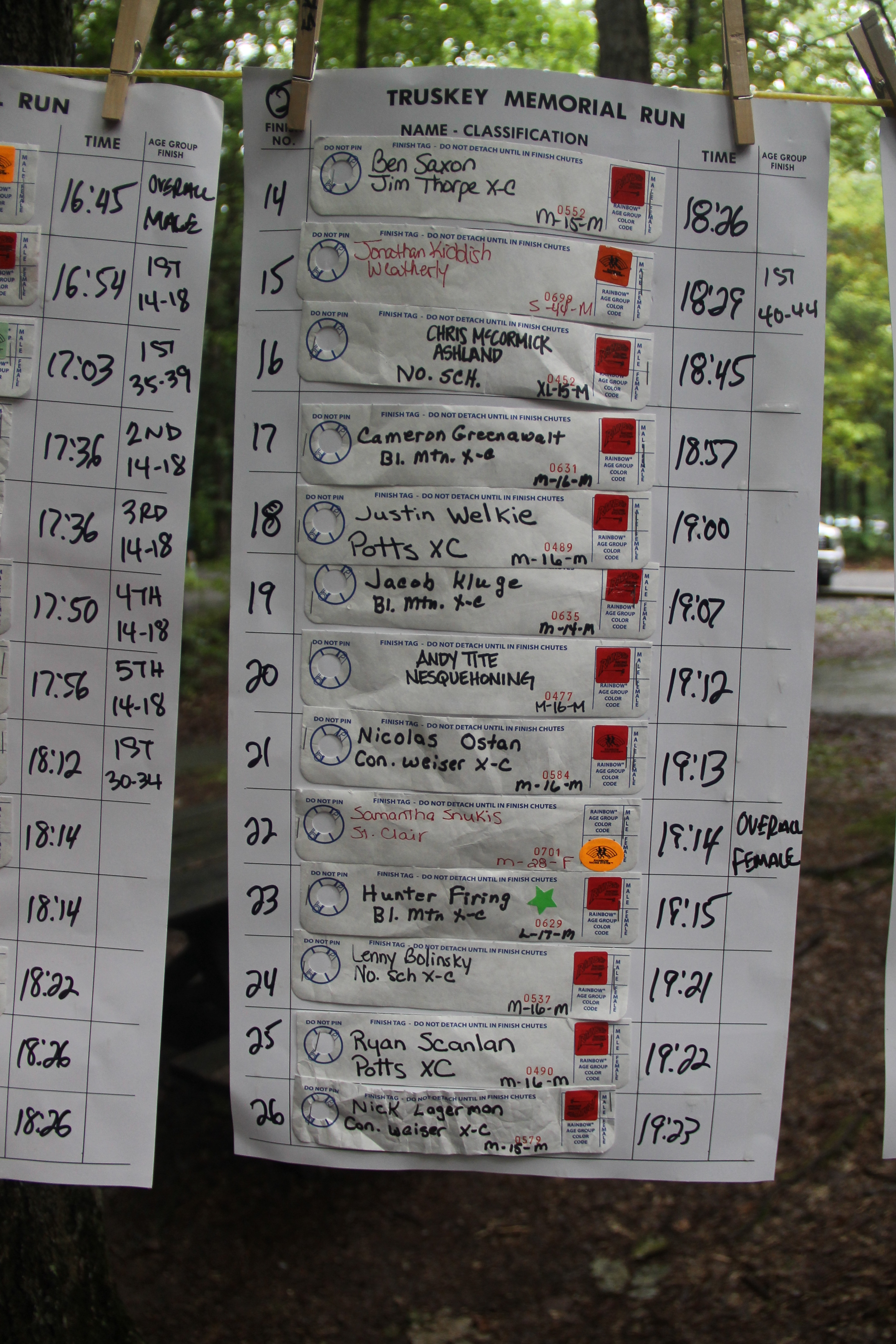 Below are photos of the written time sheets on display following the Chris & Kevin Truskey Memorial 5K & 10K Run/Walk held last Saturday (August 23, 2014) at the Tuscarora State Park. They contain the names, placements and times of all the participants.