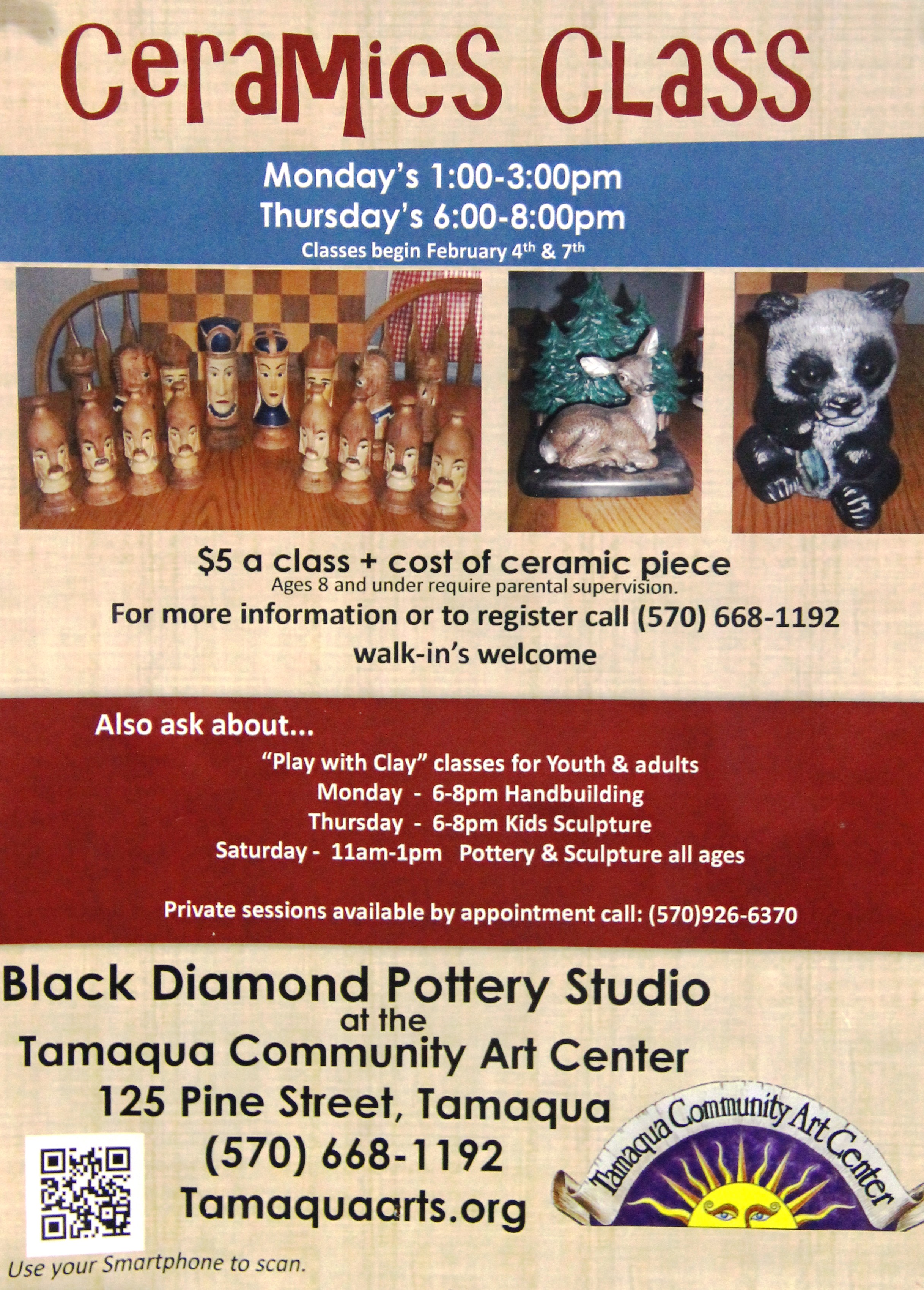 Community members, visitors and guests are given the opportunity to express their artistic or creative sides via the Black Diamond Pottery (BDP) pottery and clay classes held regularly at the Tamaqua Community Arts Center.