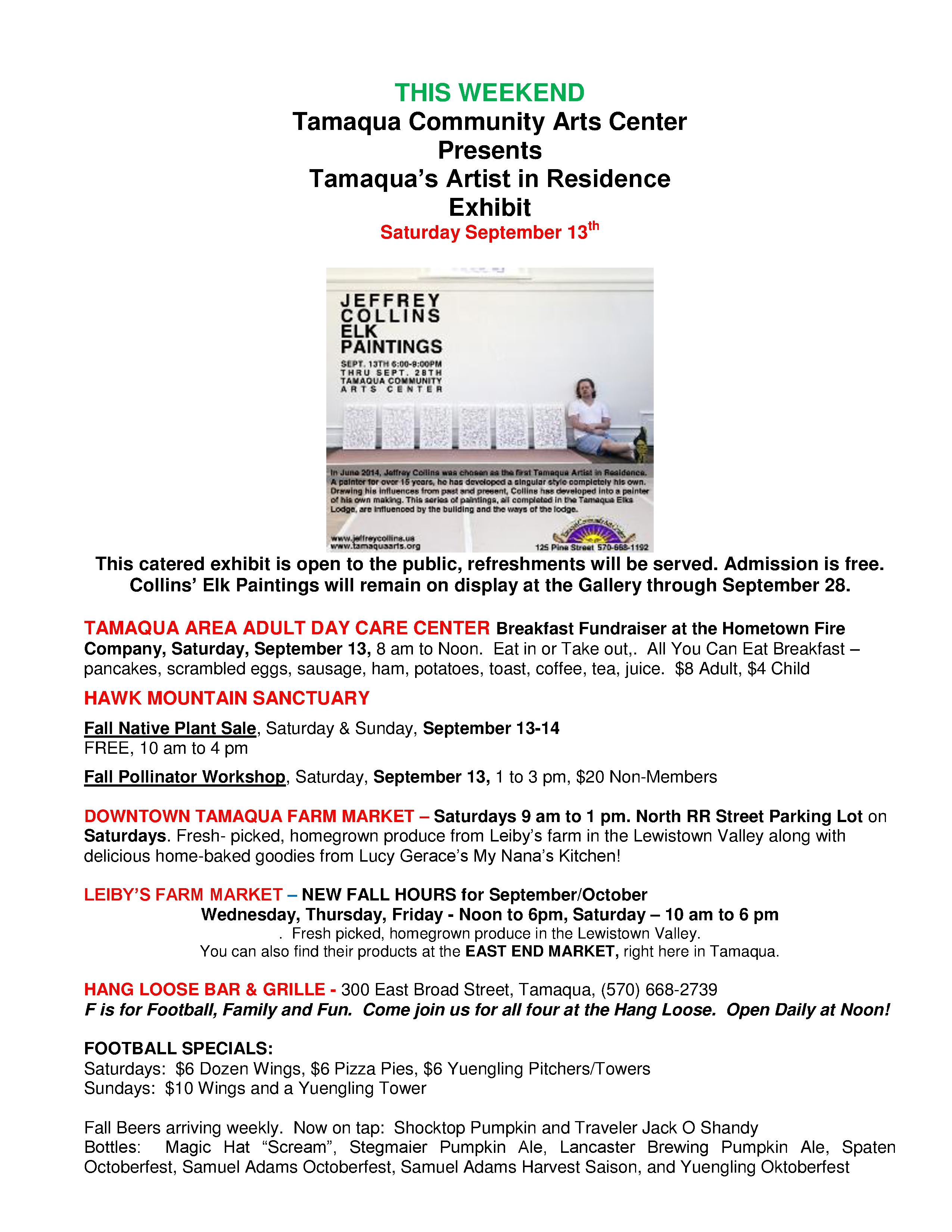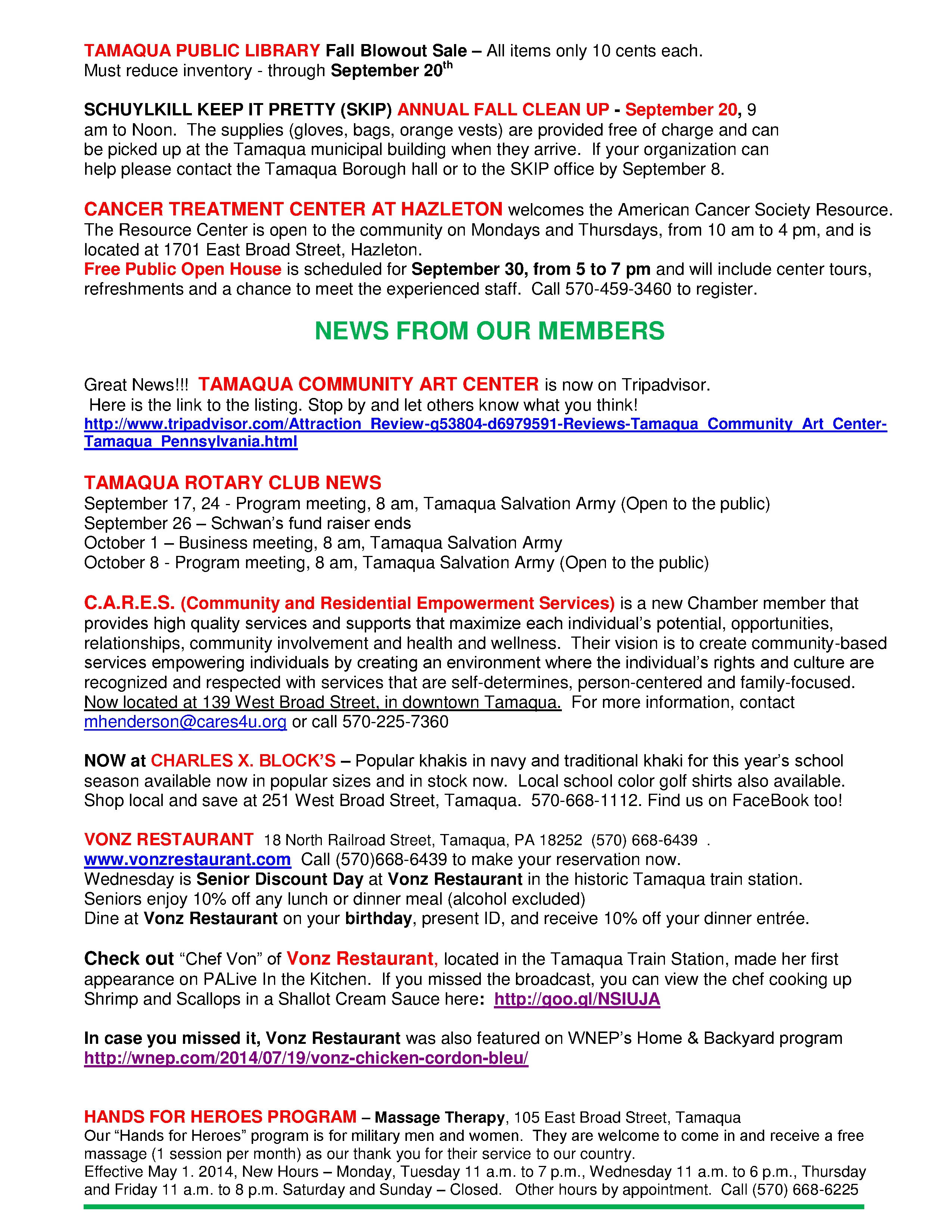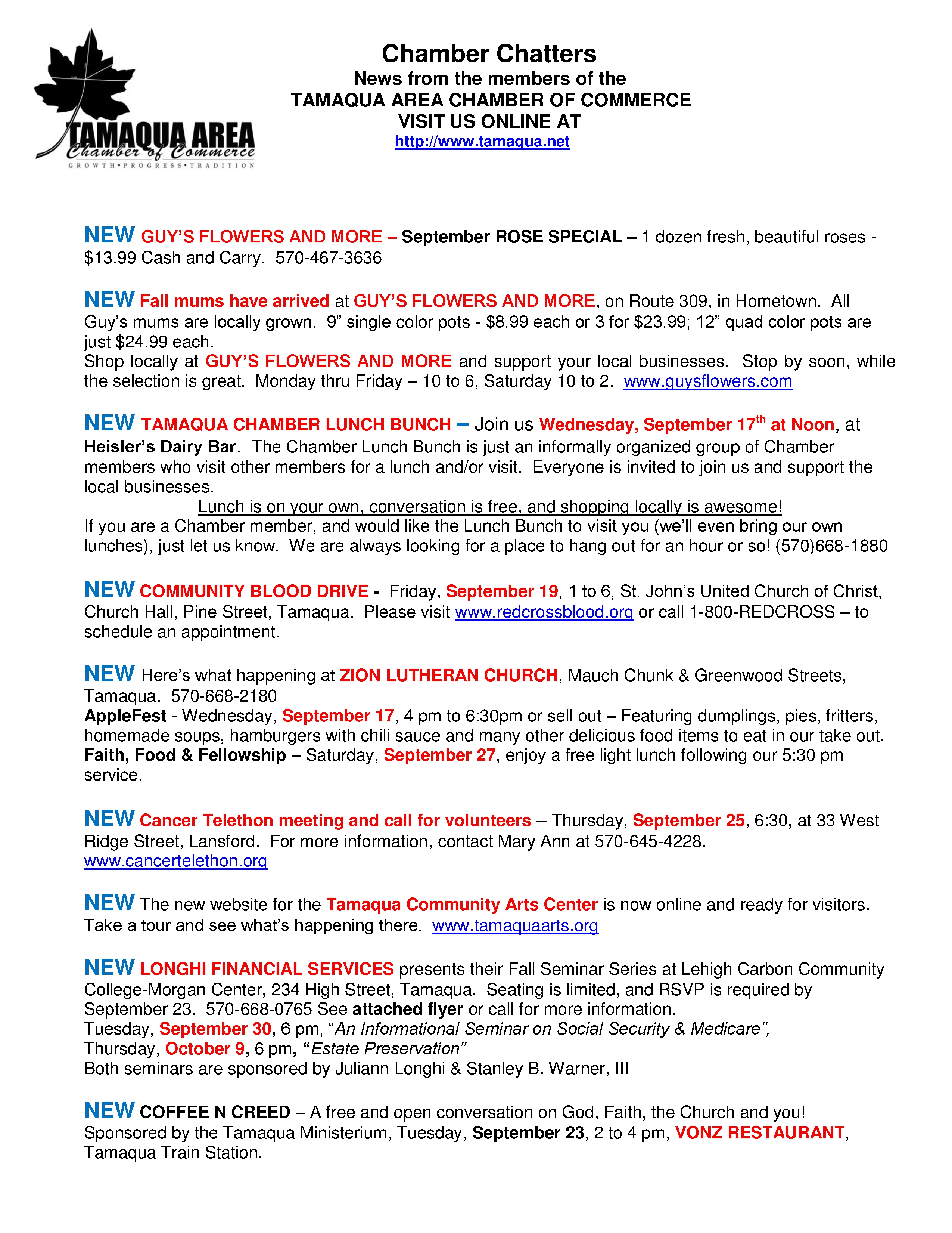 Here is the latest Tamaqua Area Chamber of Commerce’s Chamber Chatters newsletter dated Friday (September 12, 2014).