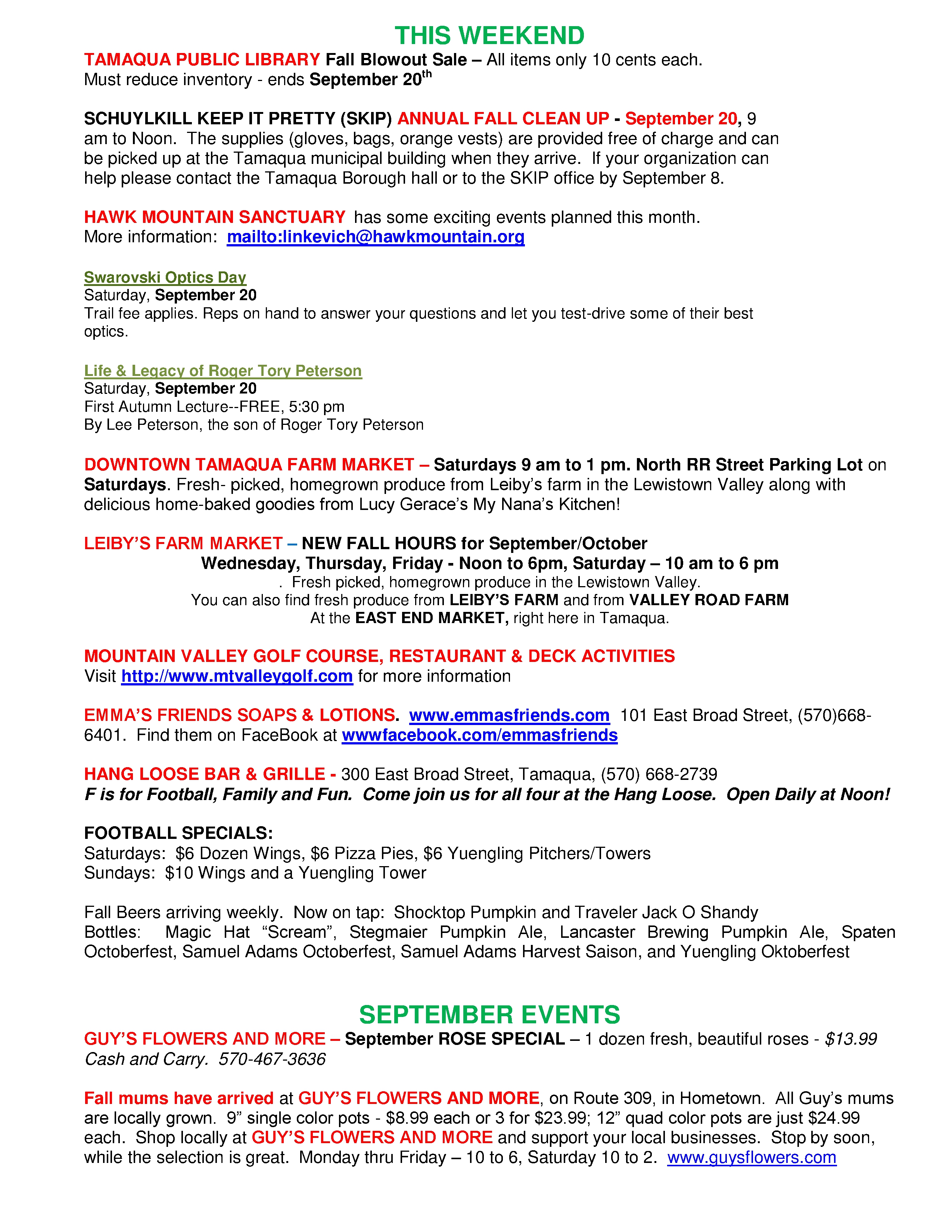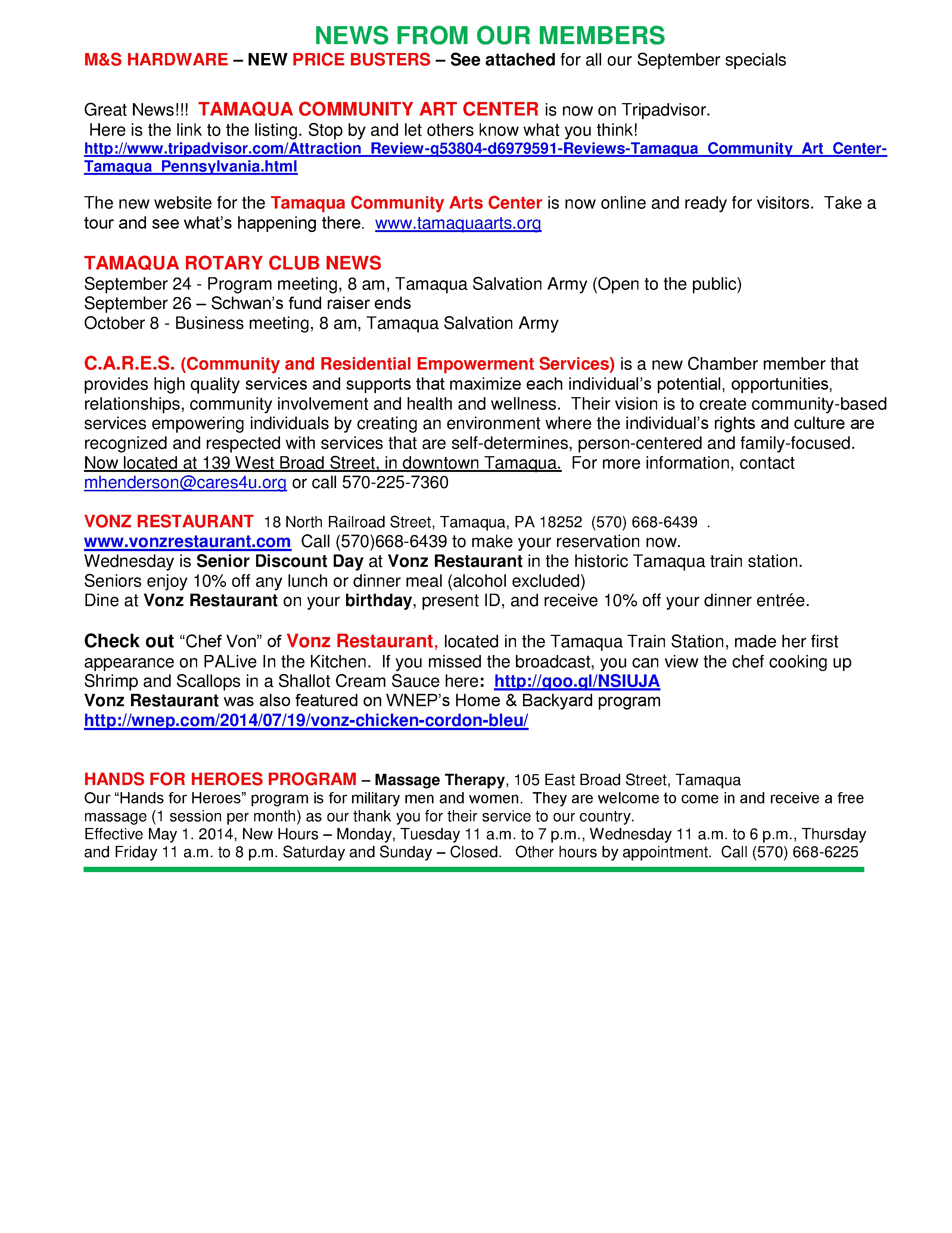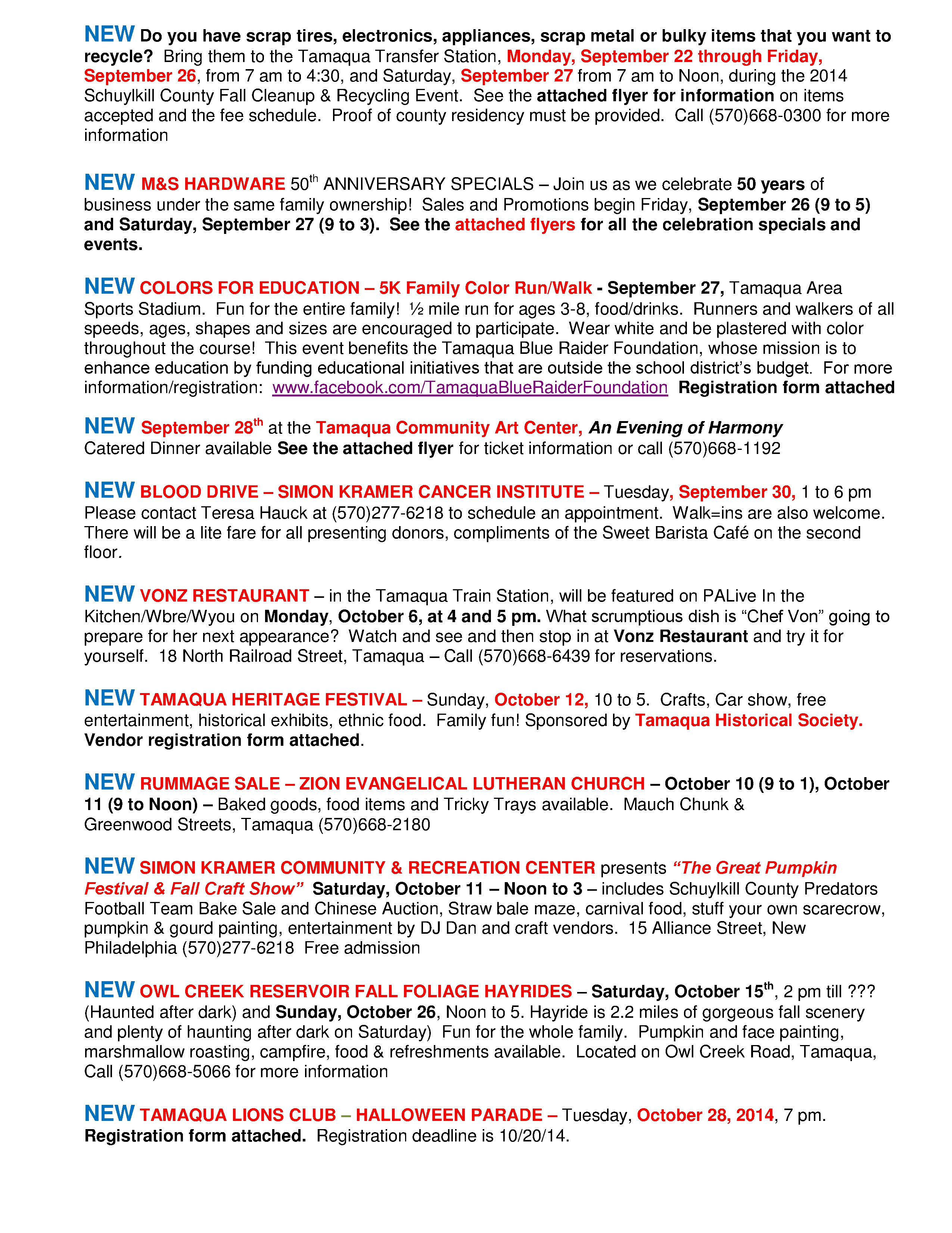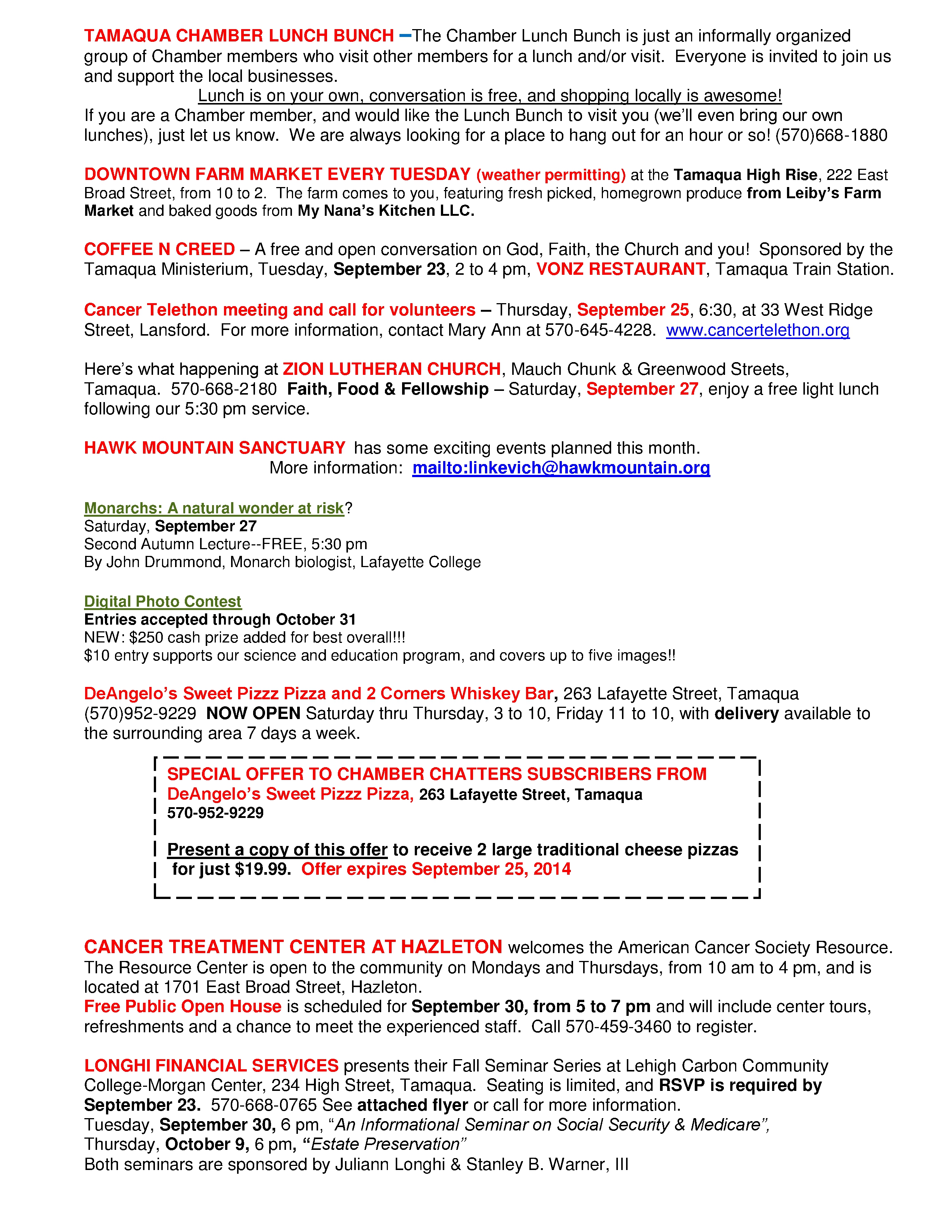 Here is the latest Tamaqua Area Chamber of Commerce’s Chamber Chatters newsletter dated Friday (September 19, 2014).