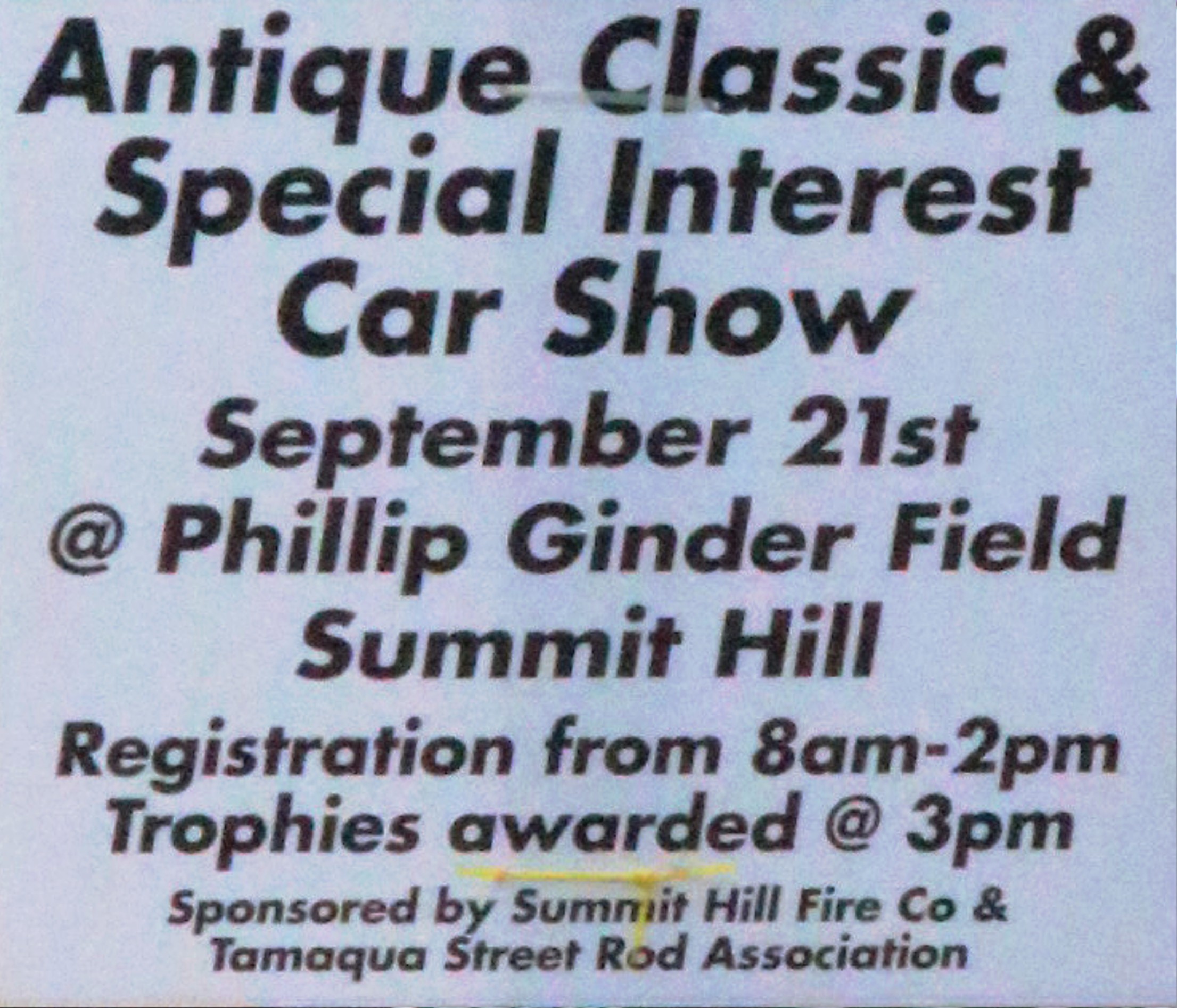 The Tamaqua Street Machines Association (TSMA) is holding an Antique, Classic and Special Interest Car Show at Phillip Ginter Field in Summit Hill on Sunday, September 21, 2014. The Summit Hill Diligence Fire Company is co-sponsoring the event.