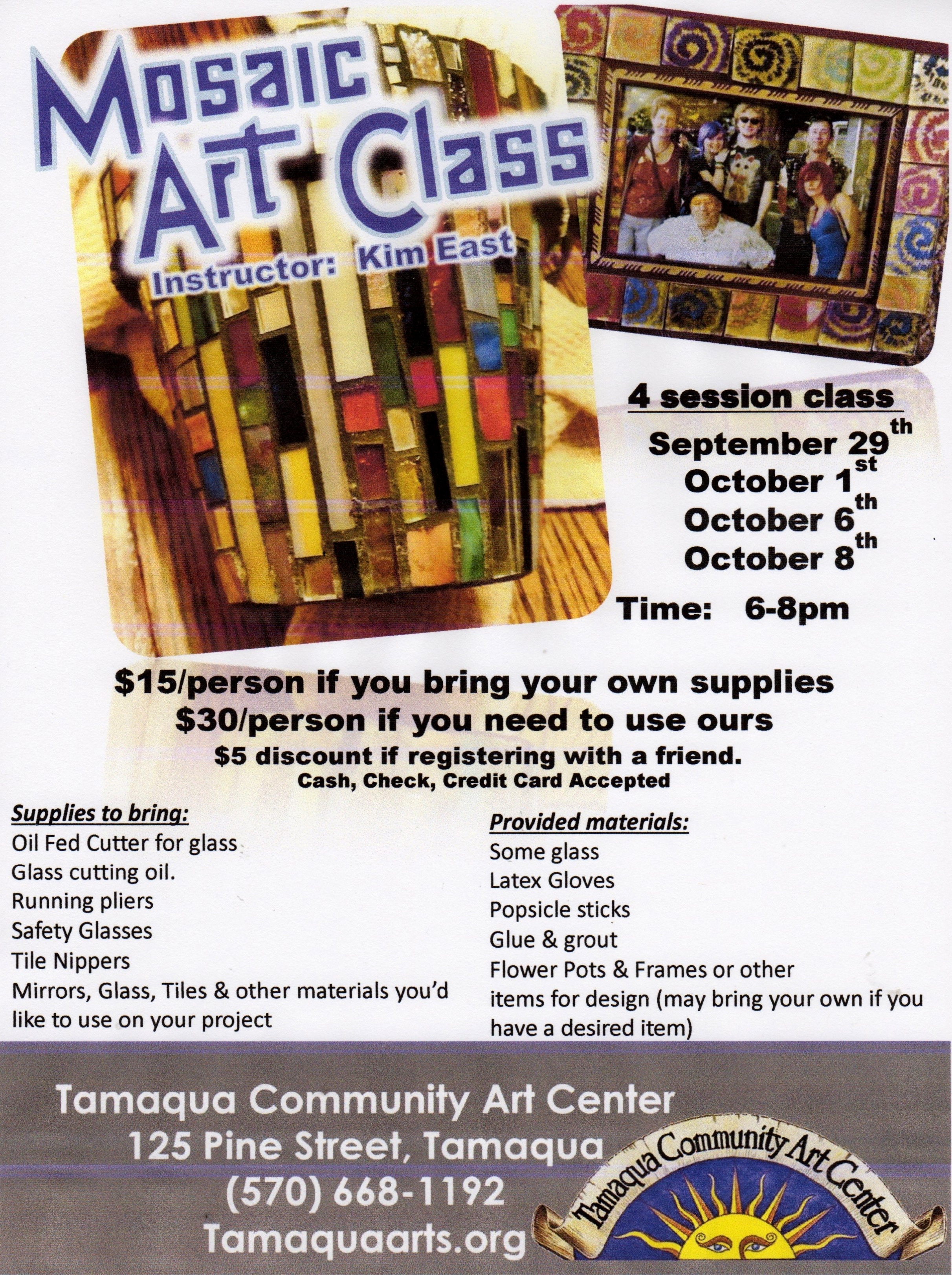 Instructor Kim East is holding a 4-session mosaic art class starting Monday, September 29, 2014 at the Tamaqua Community Arts Center.
