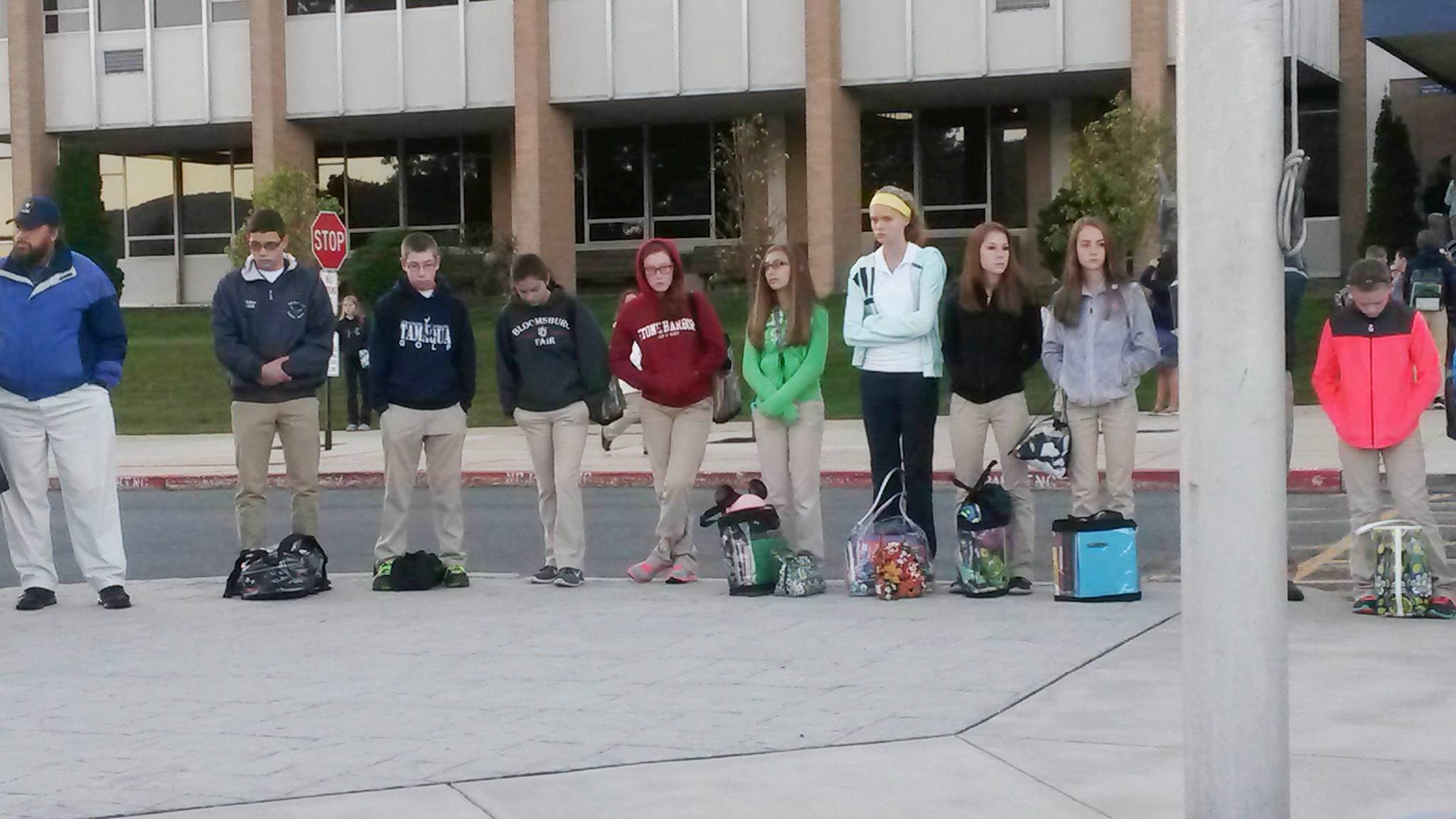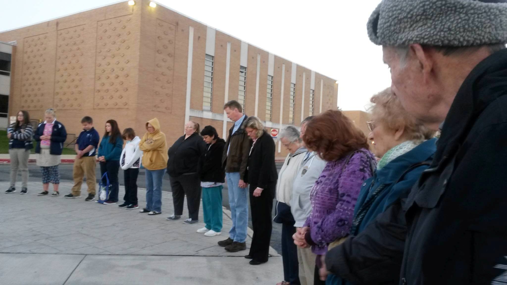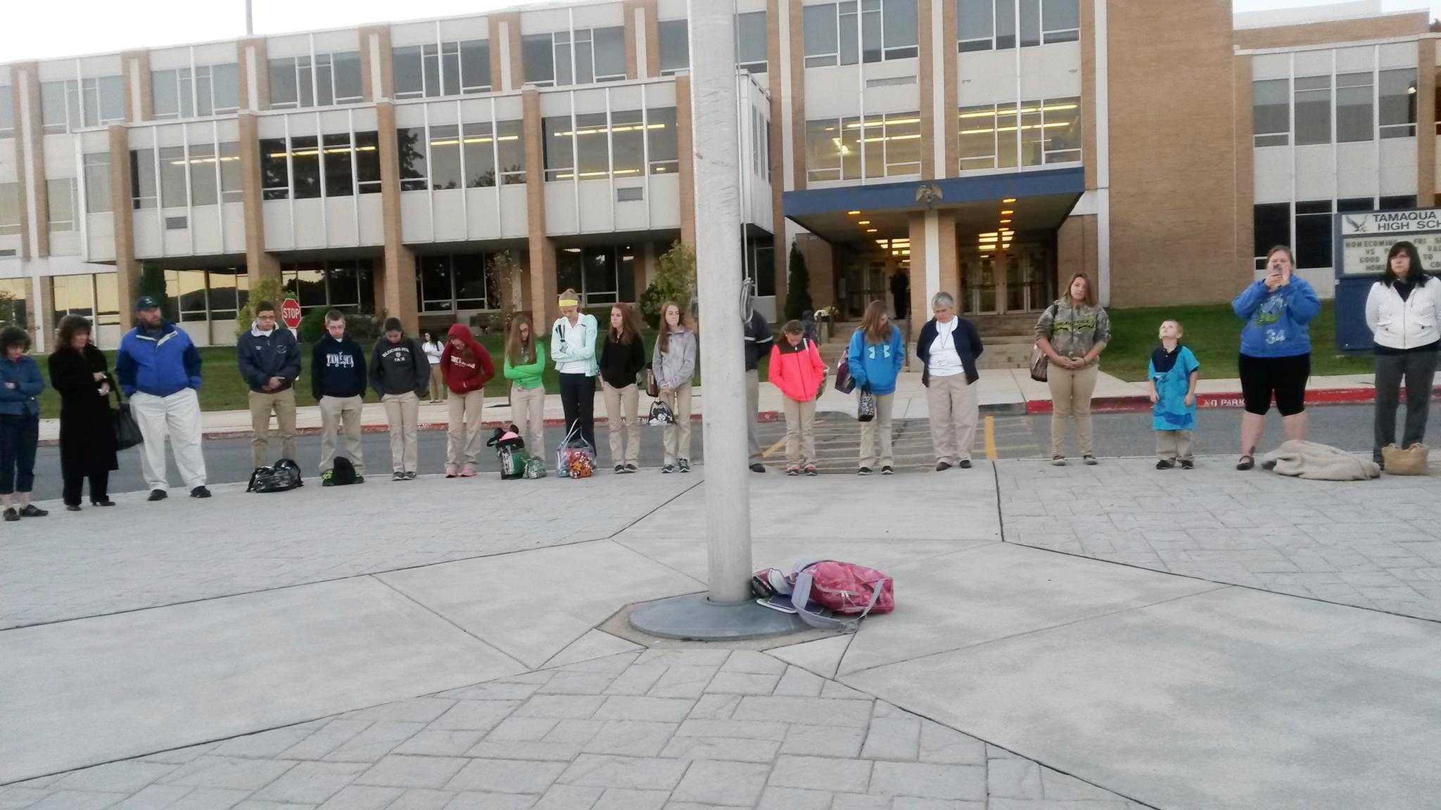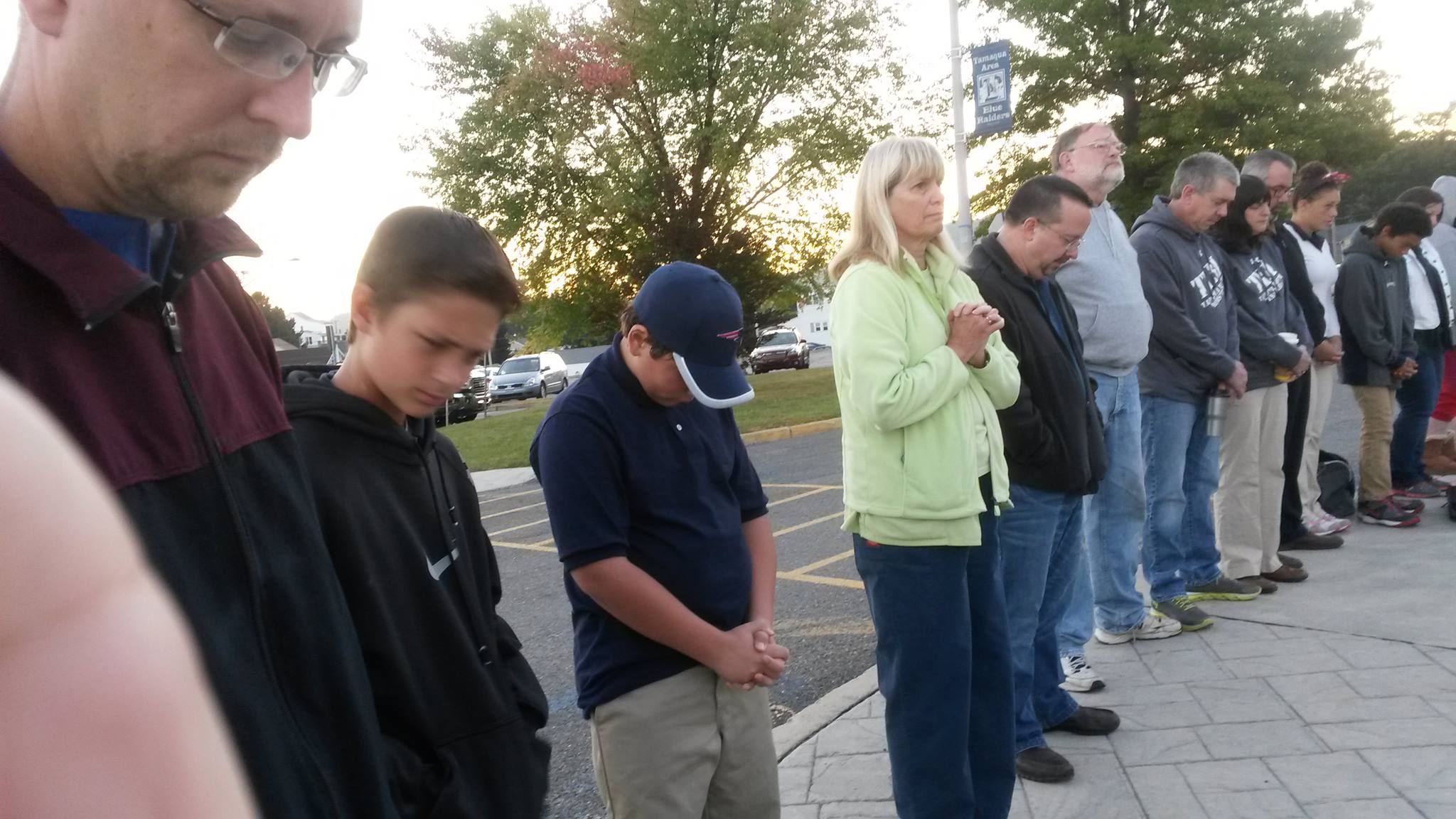 Taking part in a worldwide global day of student prayer this morning (Wednesday, September 24, 2014), students and other participants held their hands in prayer around the flagpole in front of the Tamaqua Senior High School. Rebecca Ansbach started the prayer, with closing prayer by Antonetta Gerace.