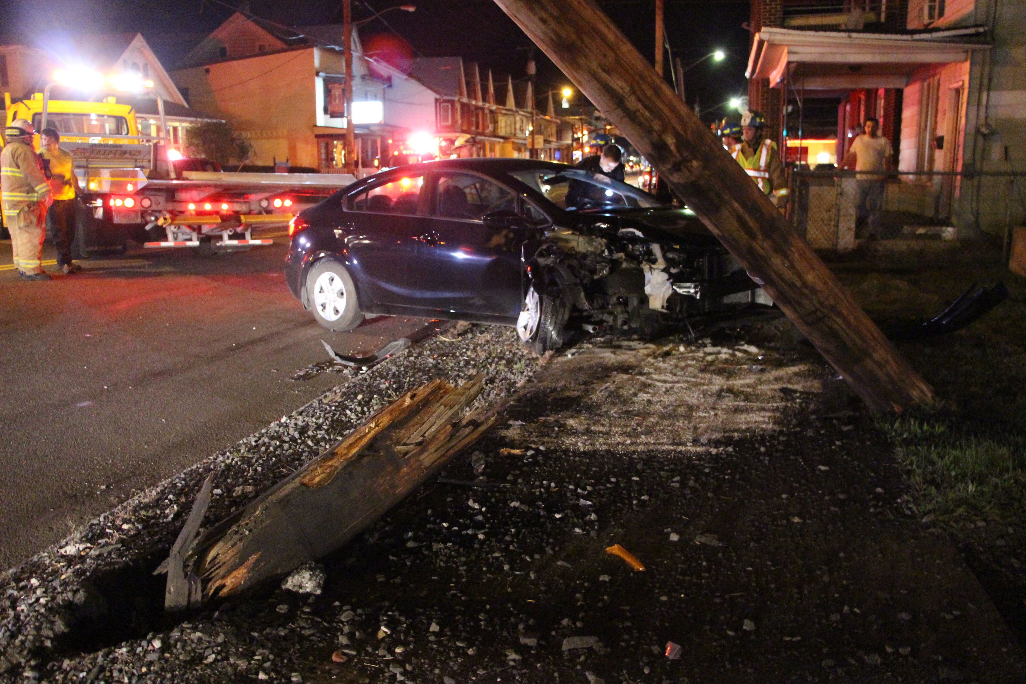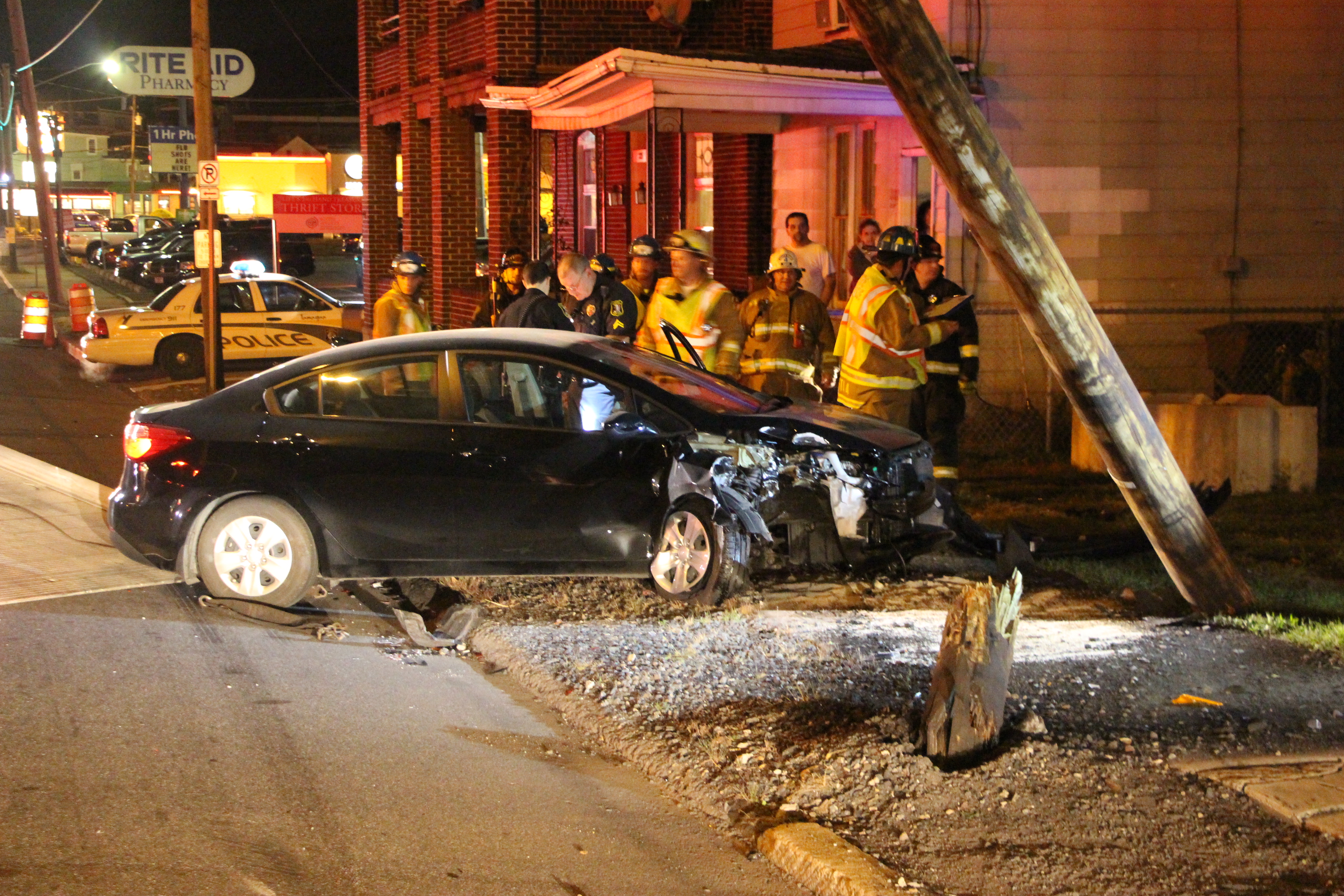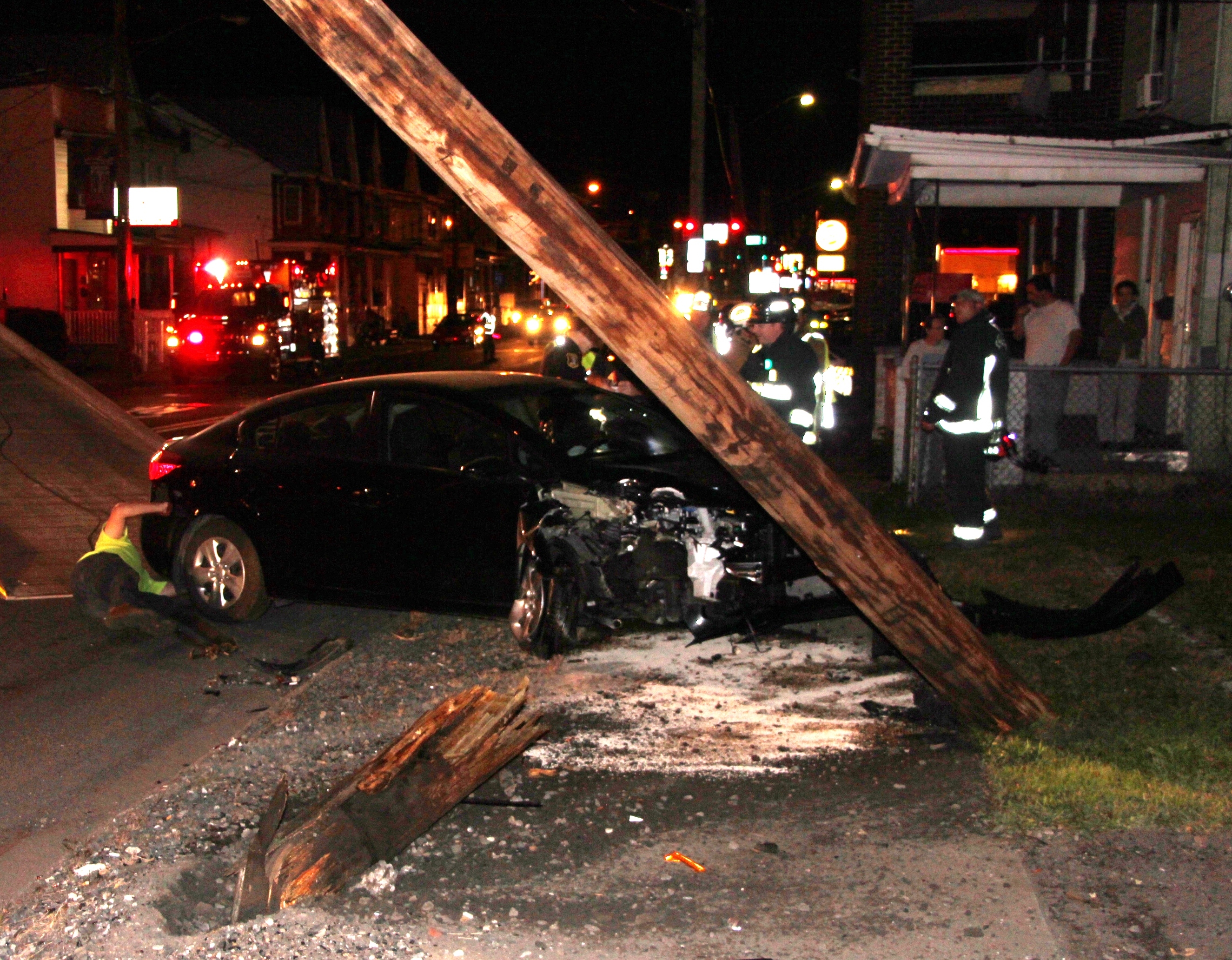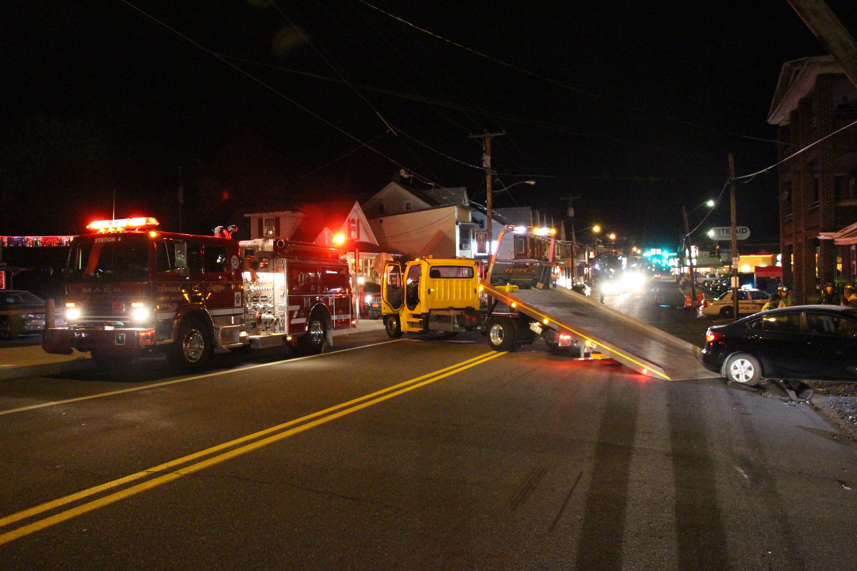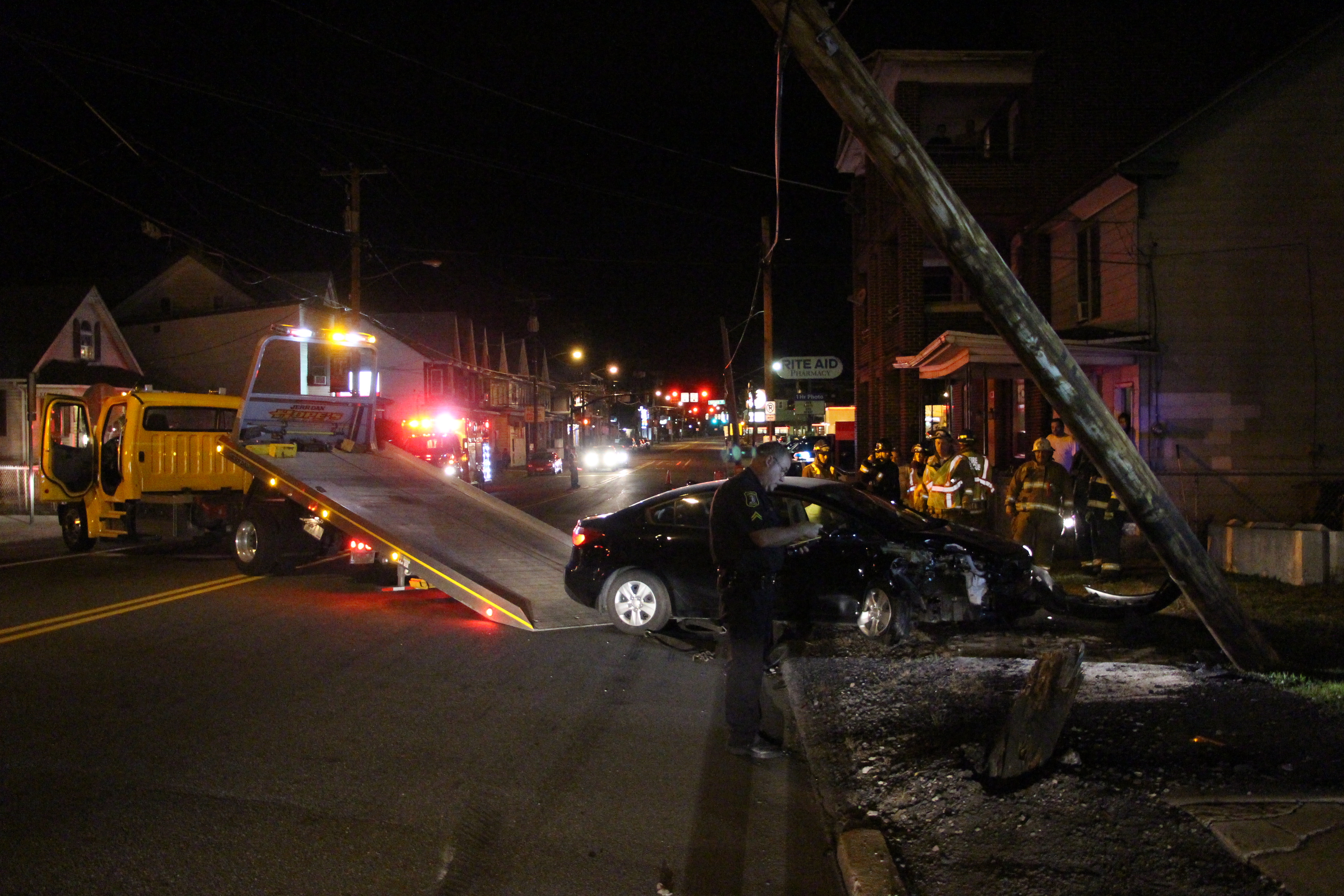 Observers on scene stated that the male (driving a black Kia Forte) was traveling north on SR309 around 11:35 PM when, for some reason, he struck the passenger rear side of a grey Subaru Forrester, also traveling north on SR309. The impact resulted in the Kia snapping a utility pole across from Mike’s Cars and Truck car lot on Center Street. In addition, flying debris from the pole smashed into the back window of a parked Ford Escape along 233 Center Street.