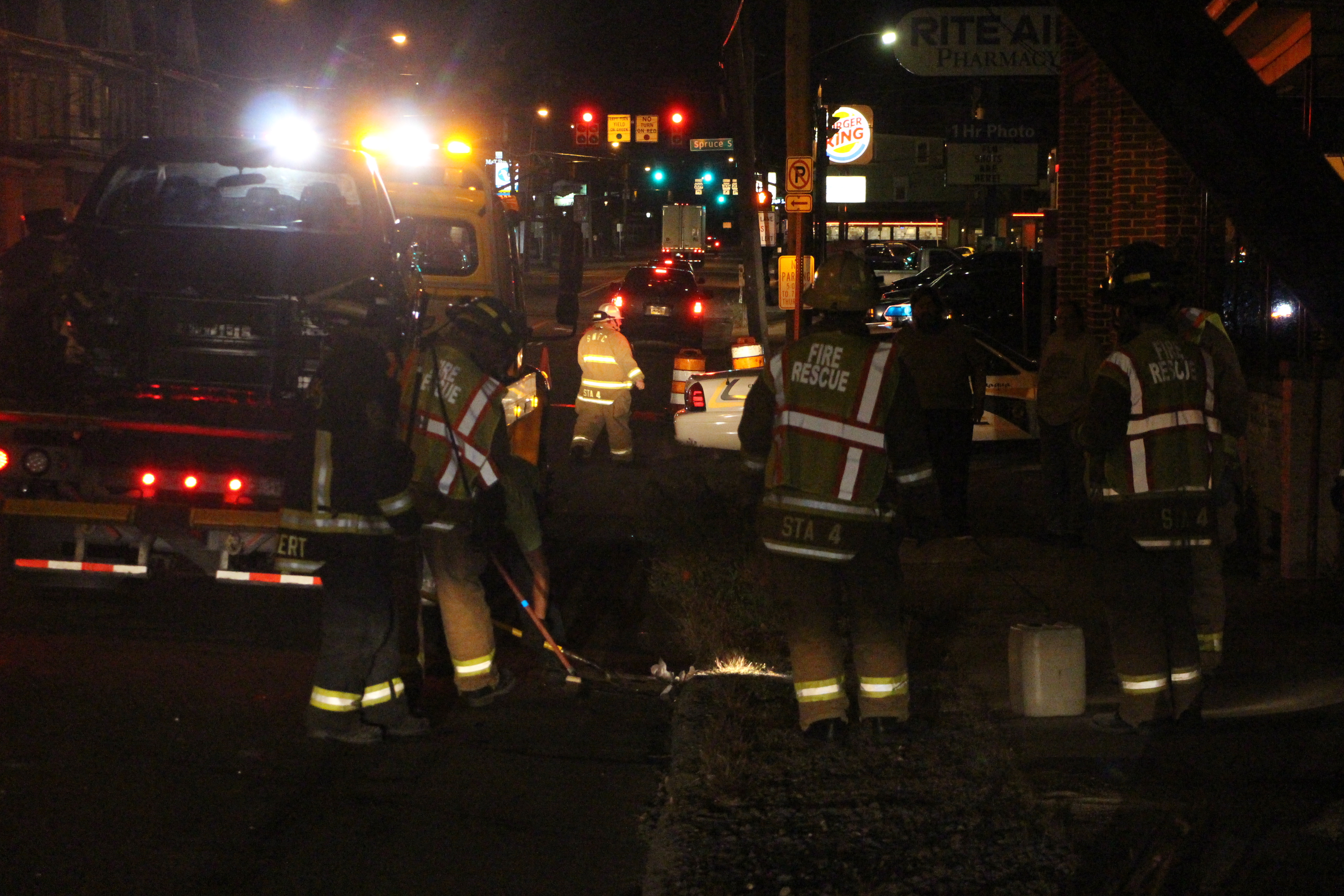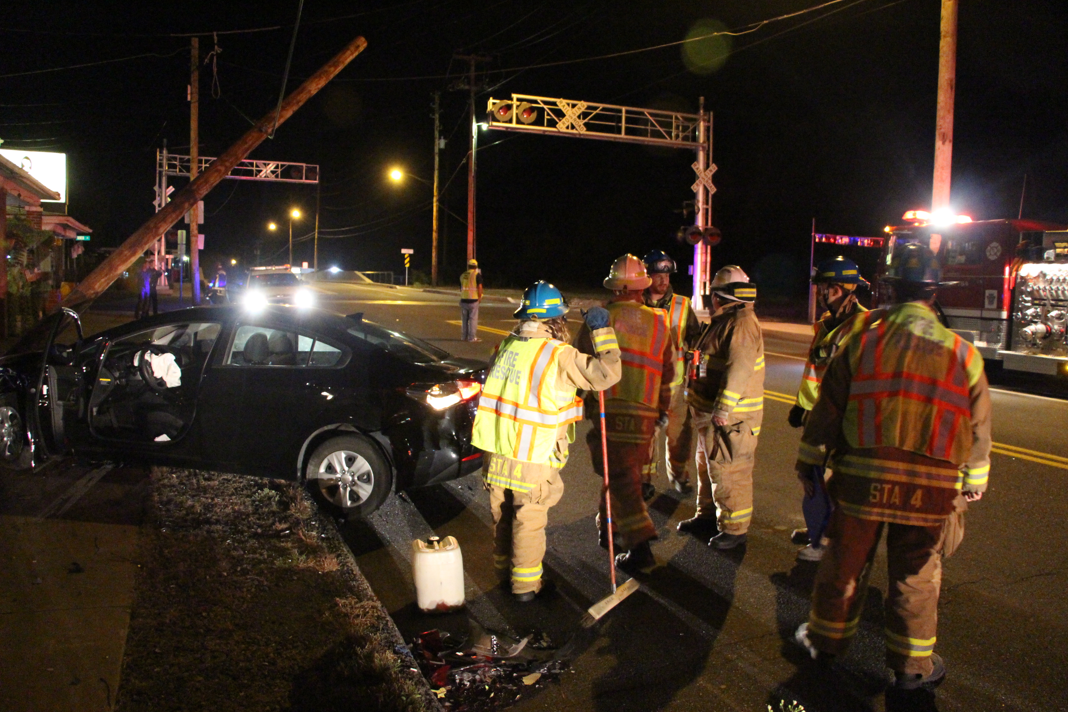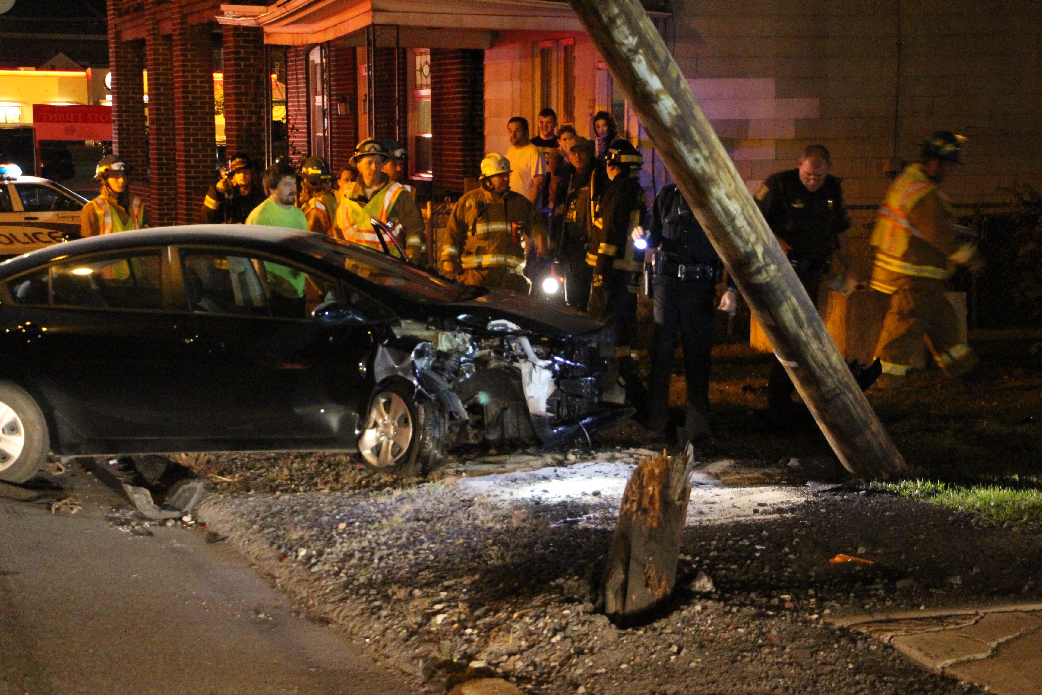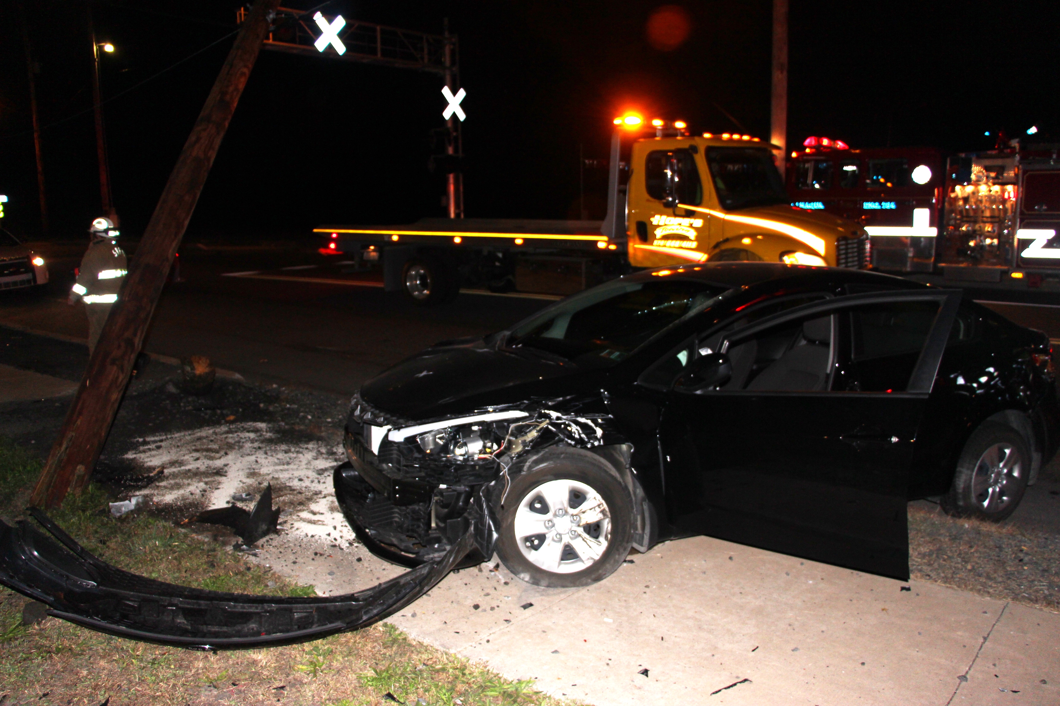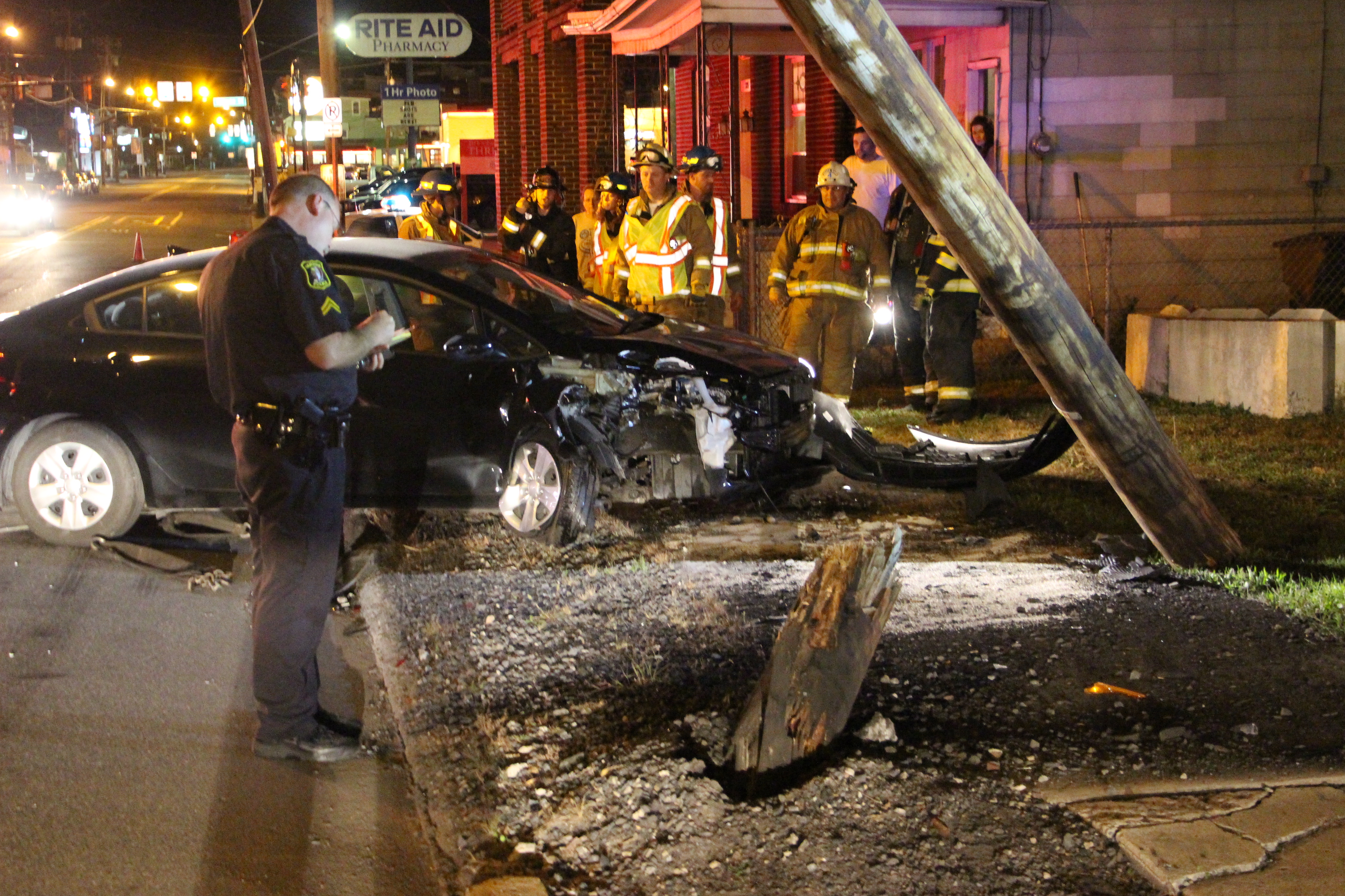 Observers on scene stated that the male (driving a black Kia Forte) was traveling north on SR309 around 11:35 PM when, for some reason, he struck the passenger rear side of a grey Subaru Forrester, also traveling north on SR309. The impact resulted in the Kia snapping a utility pole across from Mike’s Cars and Truck car lot on Center Street. In addition, flying debris from the pole smashed into the back window of a parked Ford Escape along 233 Center Street.