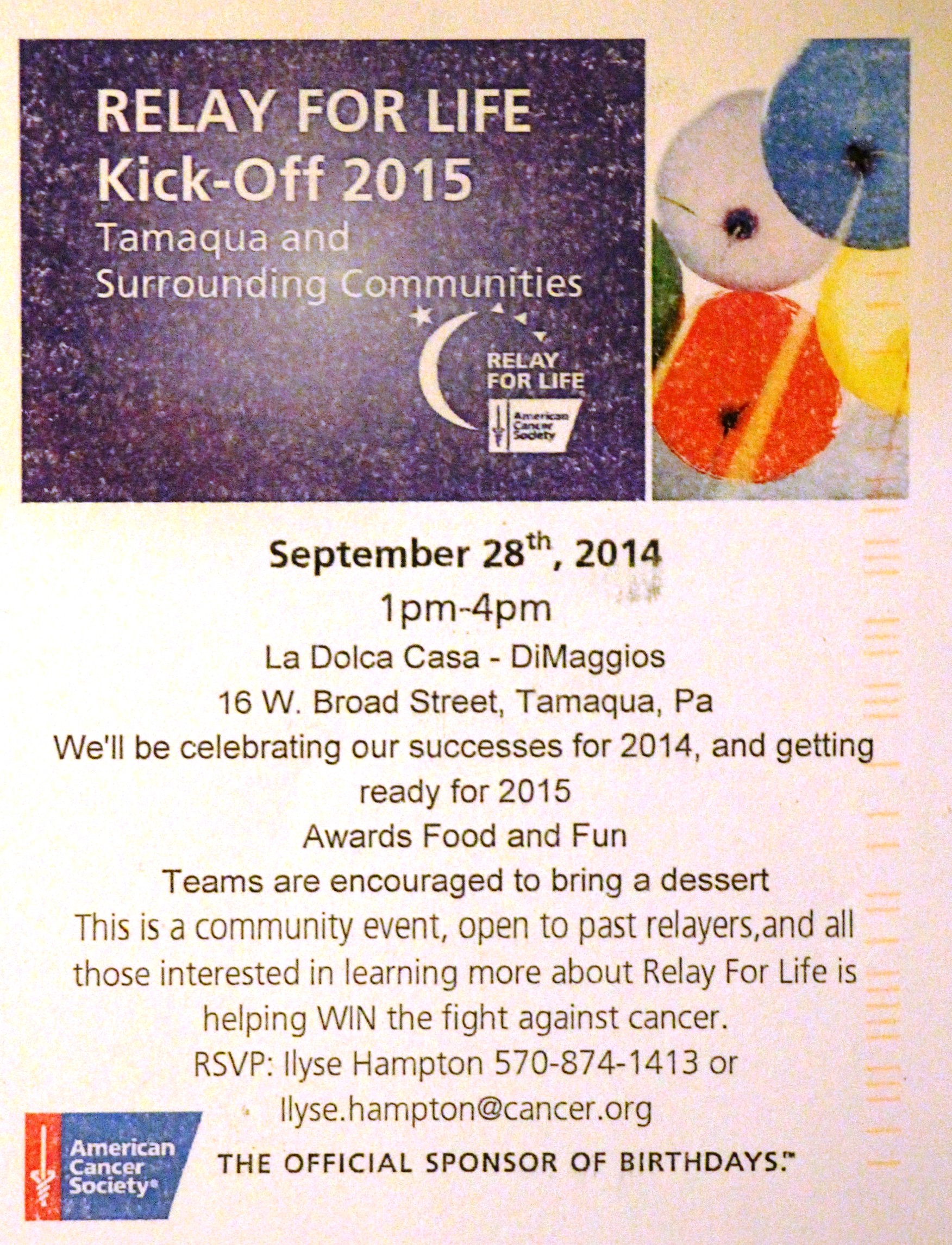 Members, past participants, teams, and visitors are welcome to attend the Relay For Life 2015 Kick-Off Party planned Sunday, September 28, 2014 at the La Dolce Casa in Tamaqua.