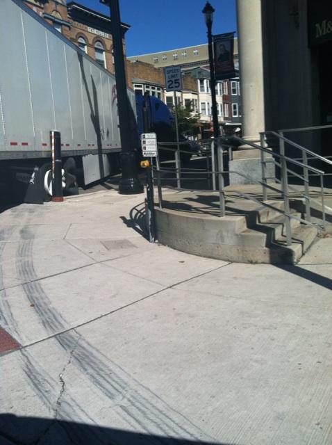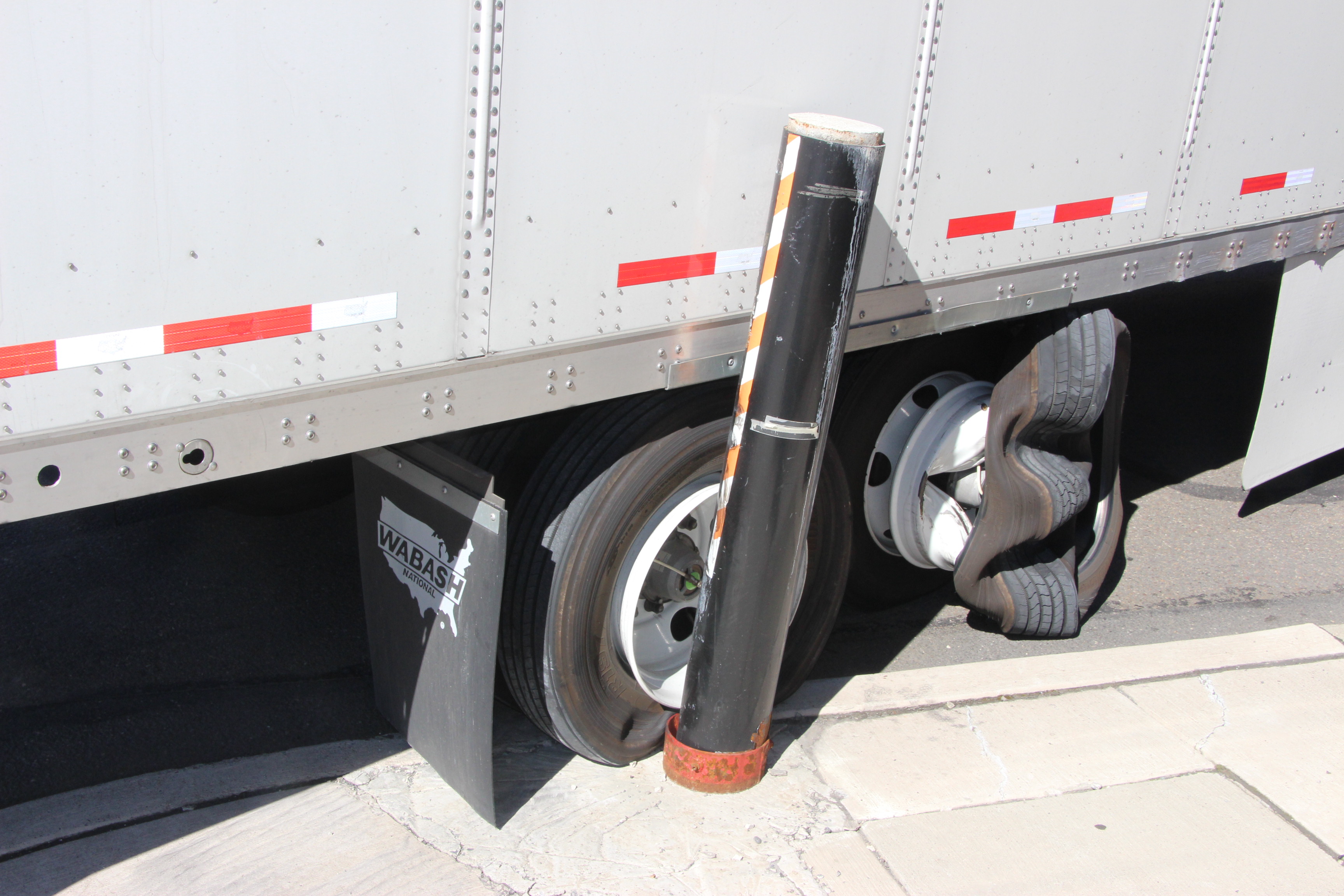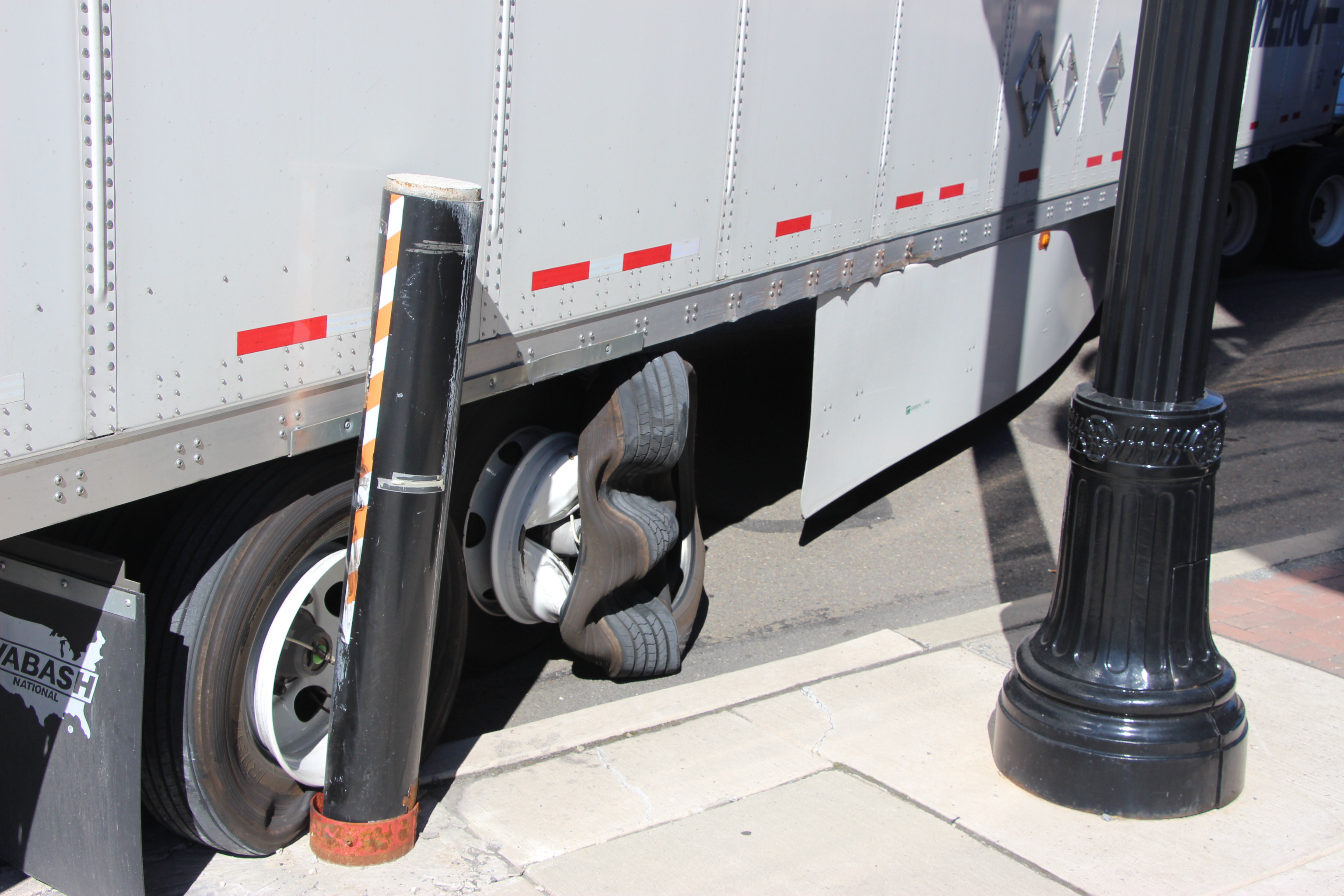 Around 1:30 PM yesterday (Saturday, September 27, 2014), a tractor trailer turning east from SR309 (Center Street) onto US209 (East Broad Street) at the Five Points ended up with tires after swiping a pole at the intersection. The logo in the side of the trailer showed the truck was from Transport America.