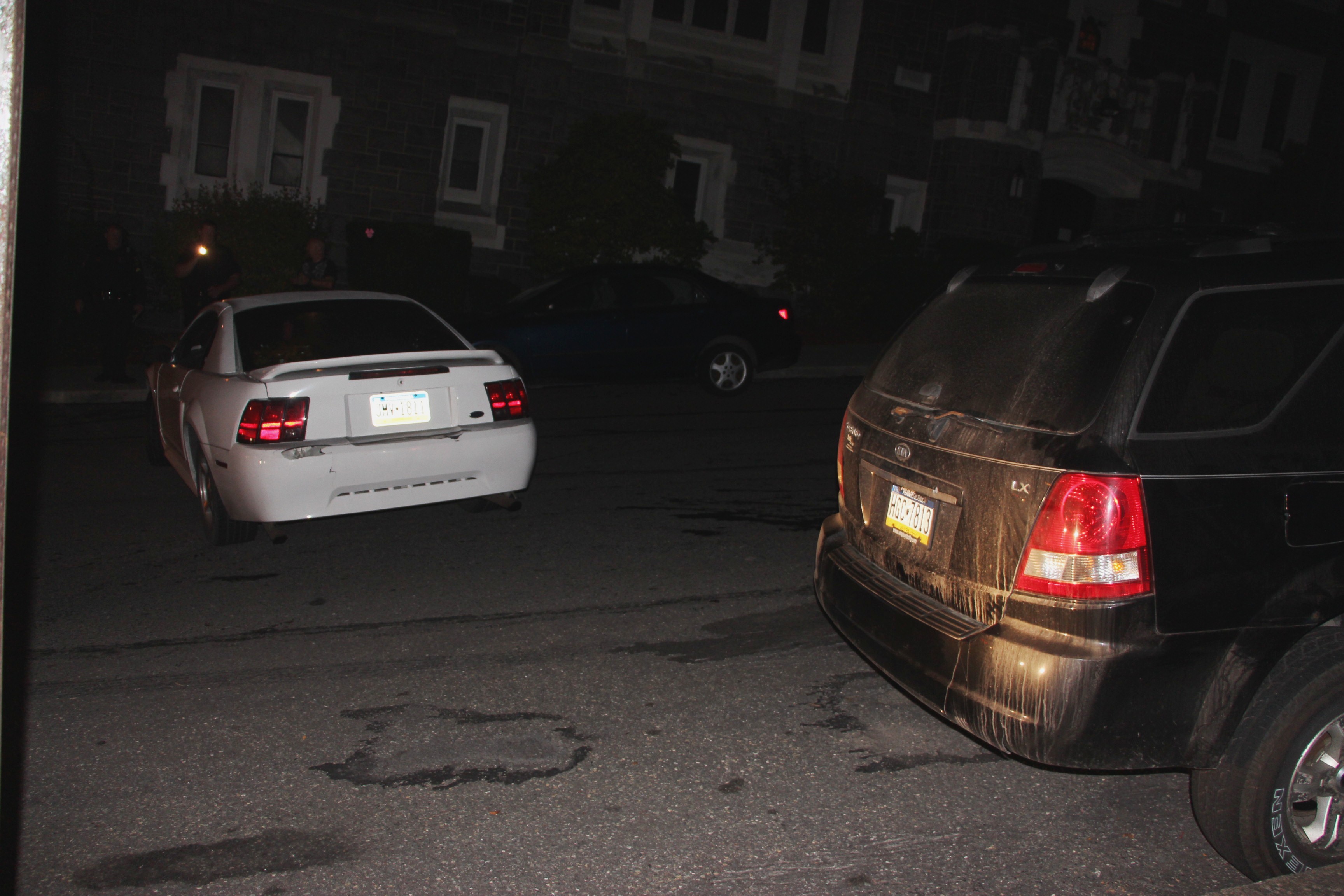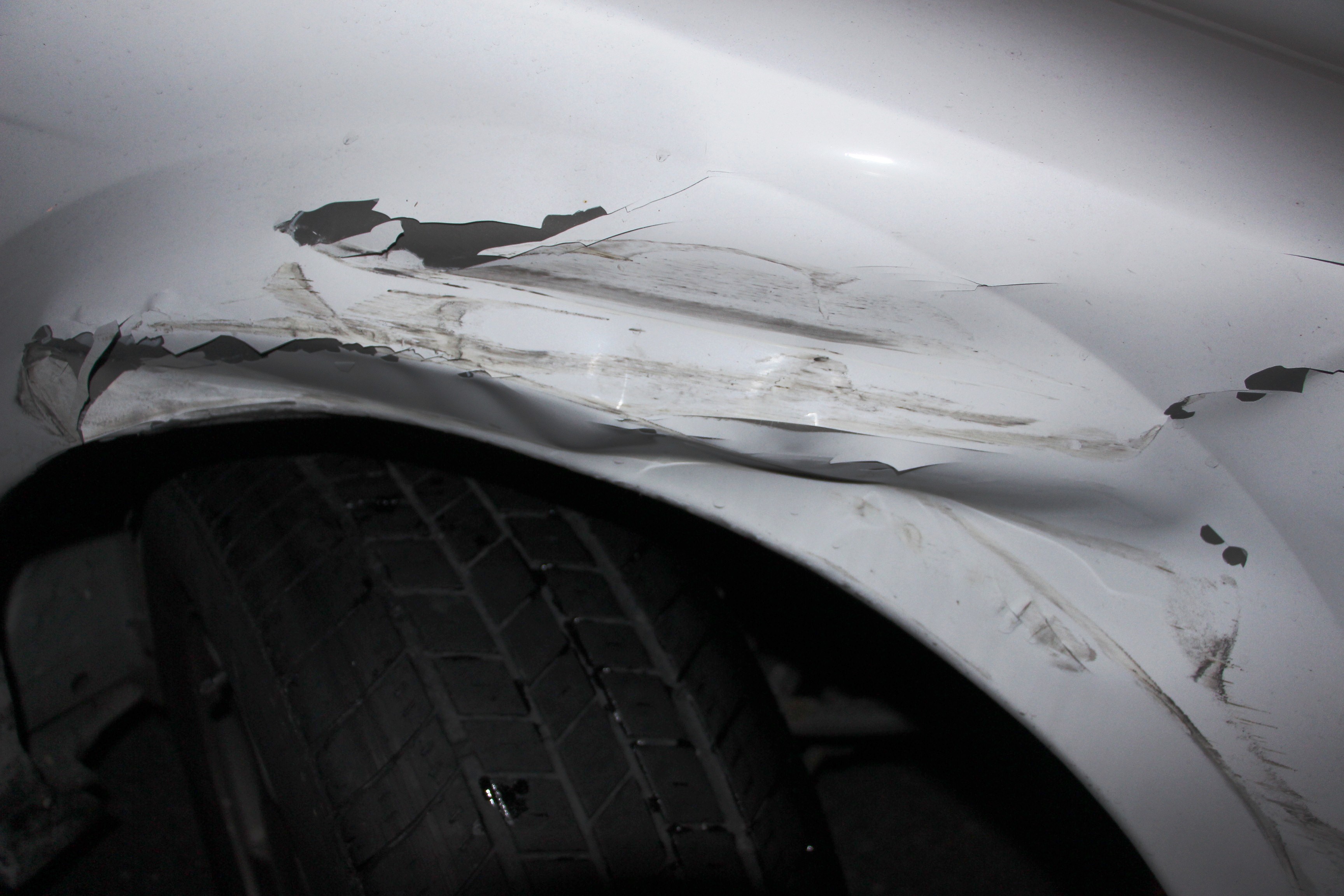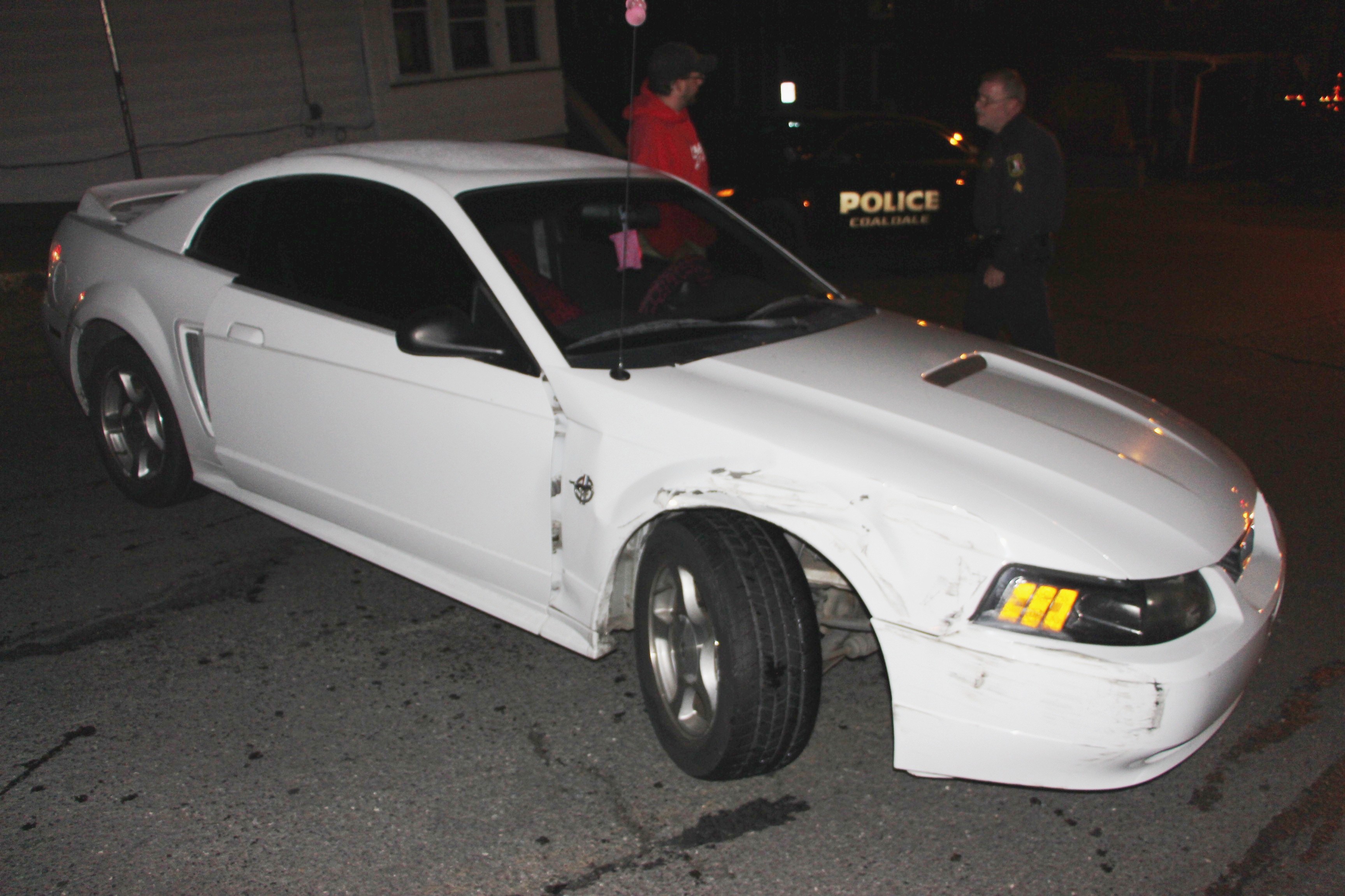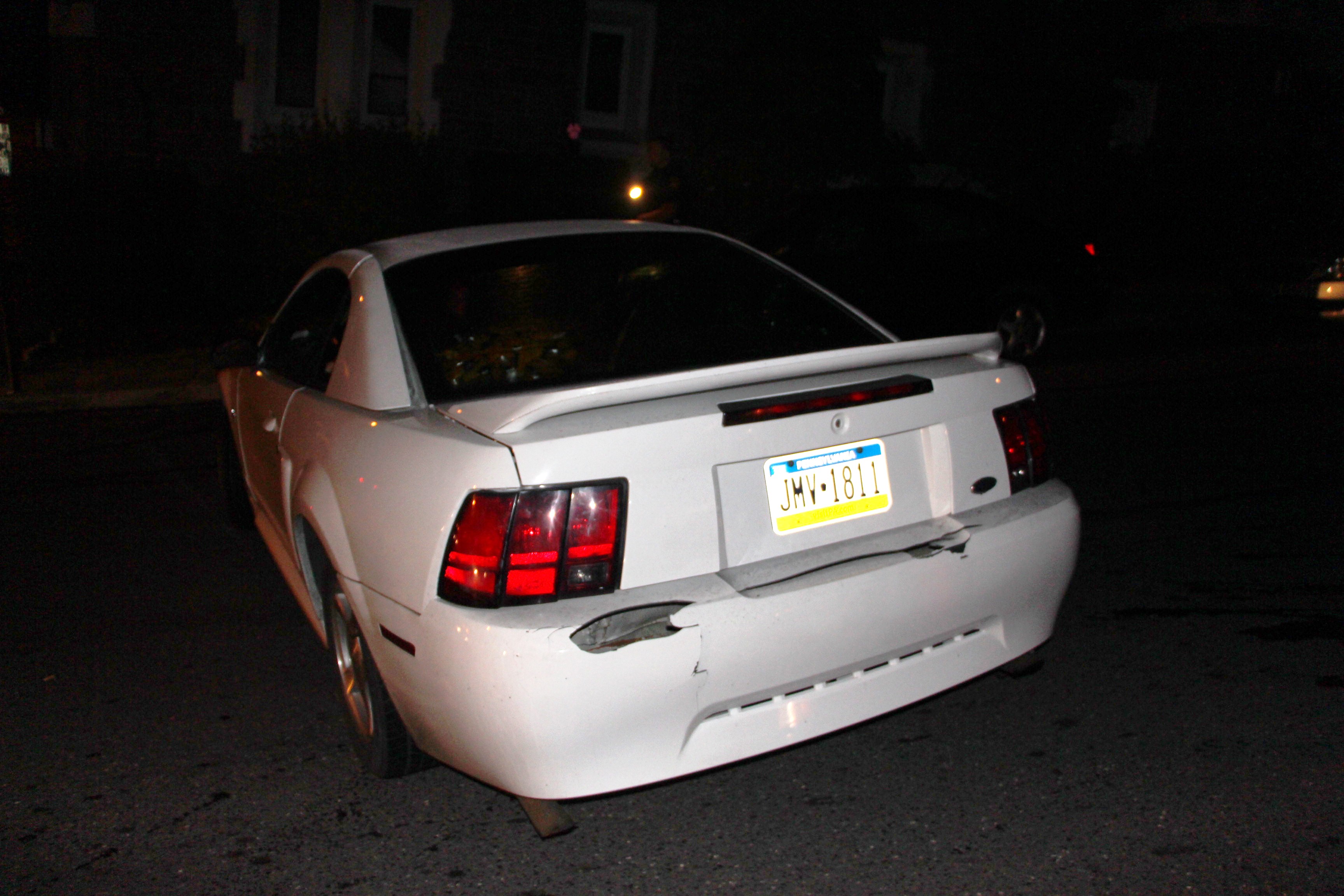 The impact caused the front of the Kia to be pushed onto the curb. Damage to the Mustang varied from the front passenger side, as well as rear of the vehicle.