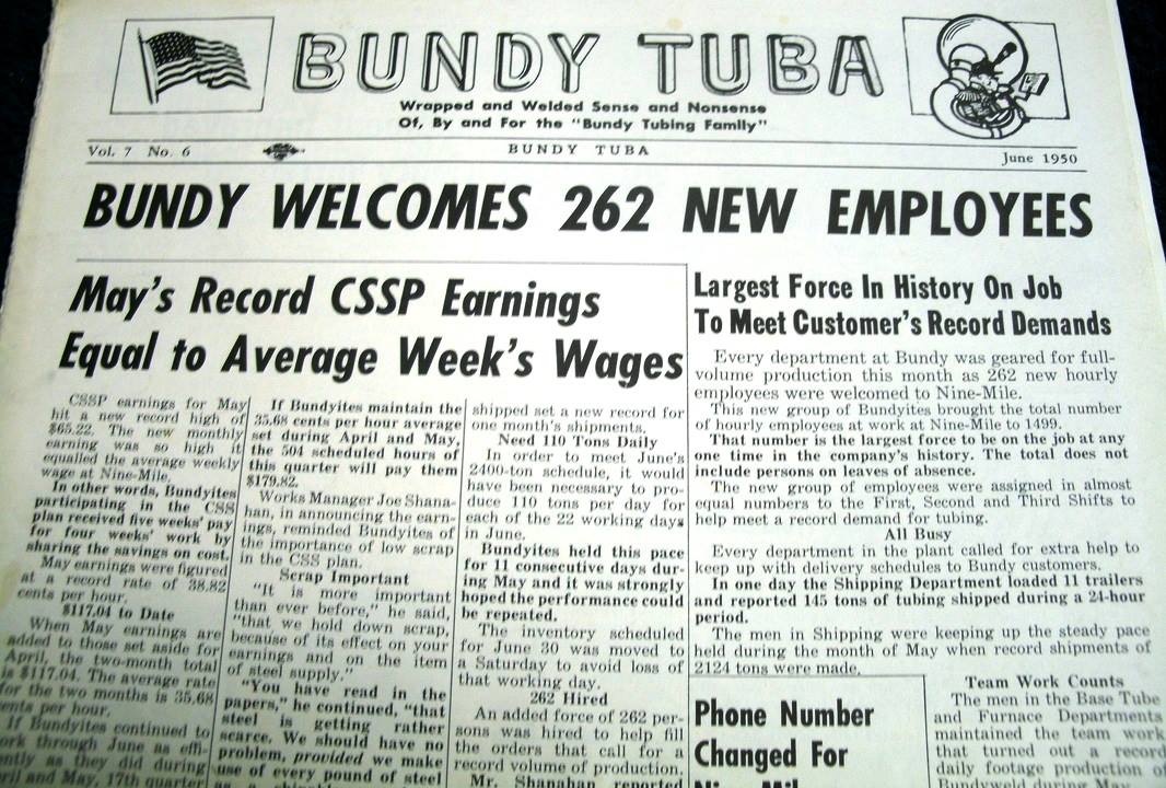 After World War 2, our local economy was on the decline. The mines were shutting down and women were forced to seek employment in garment factories. In 1949, Bundy Tubing announced it was going to locate a plant in Hometown. It promised to hire around 700 employees, but peak employment only hit only 450. Bundy Tubing later expanded the Hometown plant in 1956.