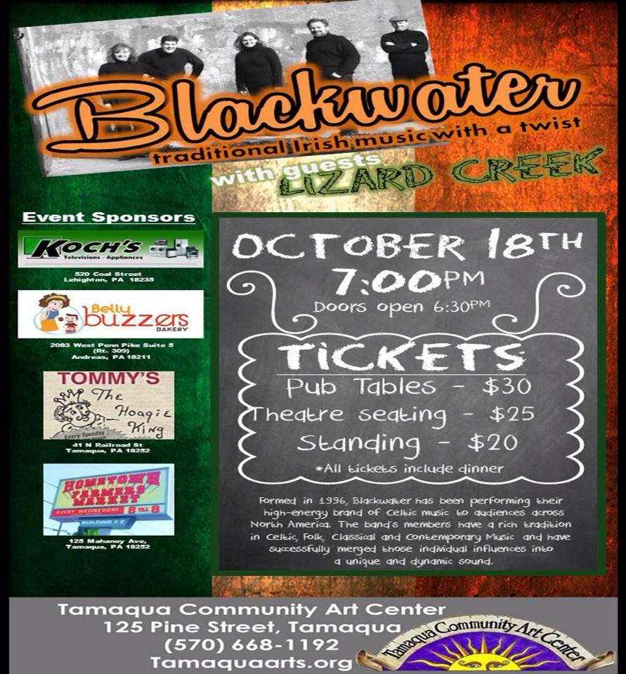 10-18-2014, Blackwater, Lizard Creek, perform, Community Arts Center, TamaquaBlackwater AND Lizard Creek will perform Saturday, October 18, 2014 at the Tamaqua Community Arts Center, 125 Pine Street.