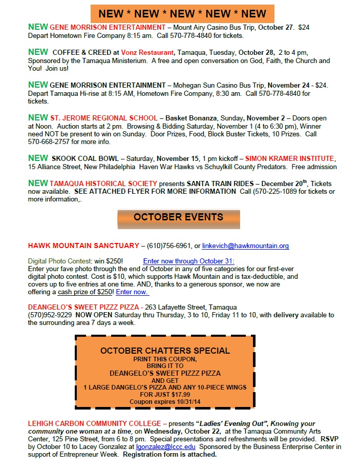 Here is the latest Tamaqua Area Chamber of Commerce’s Chamber Chatters newsletter dated Friday (October 17, 2014).