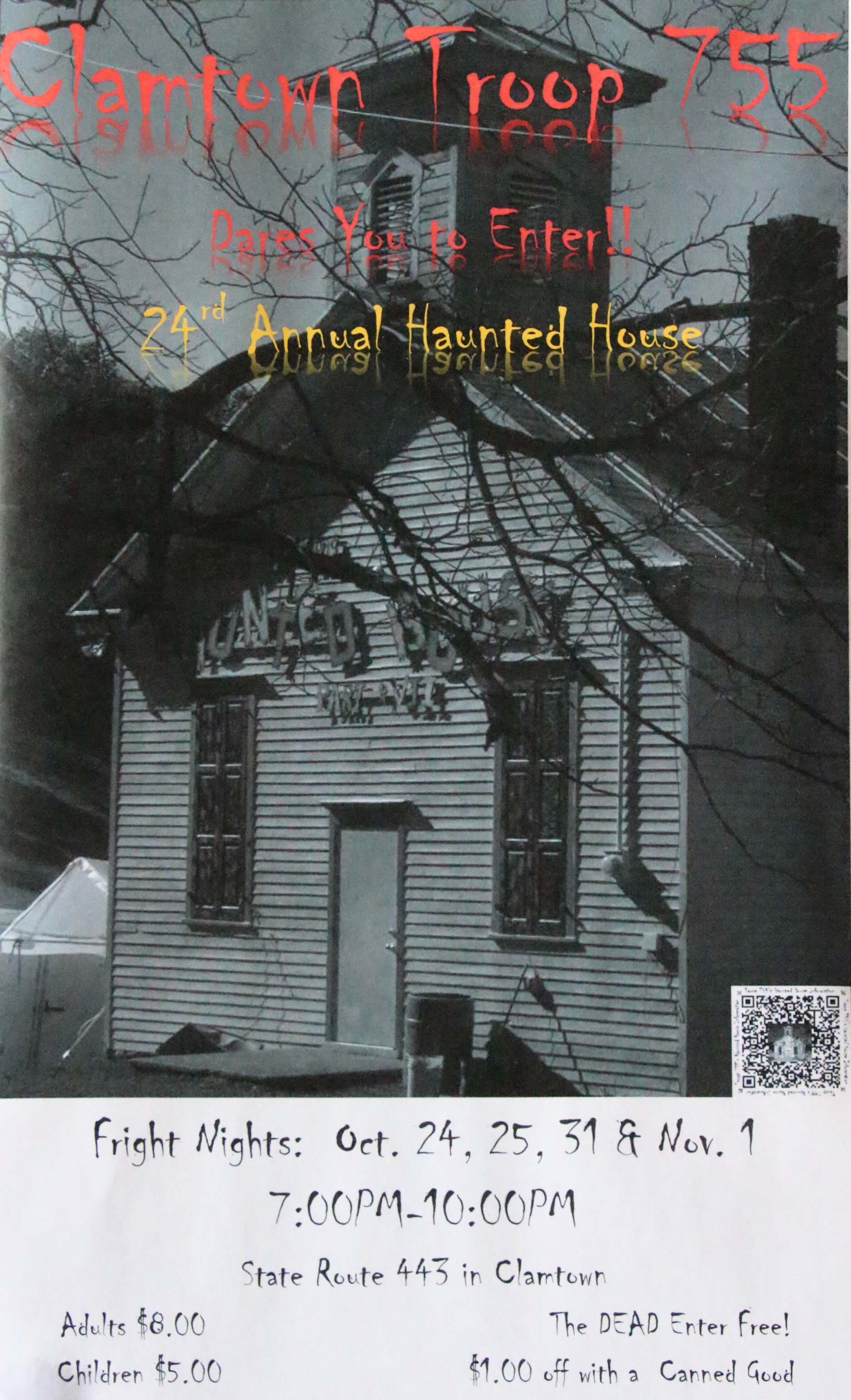 Scouts, troop leaders and volunteers with Boy Scout Troop 755 are holding their annual Clamtown Haunted School House on October 24, 25, 31, and November 1, 2014 from 7 PM to 10 PM.