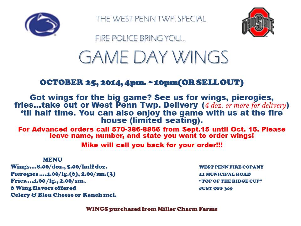 The West Penn Fire Company is having a Wing Night on Saturday, October 25, 2014 at their station from 4 PM to 10 PM or sellout.