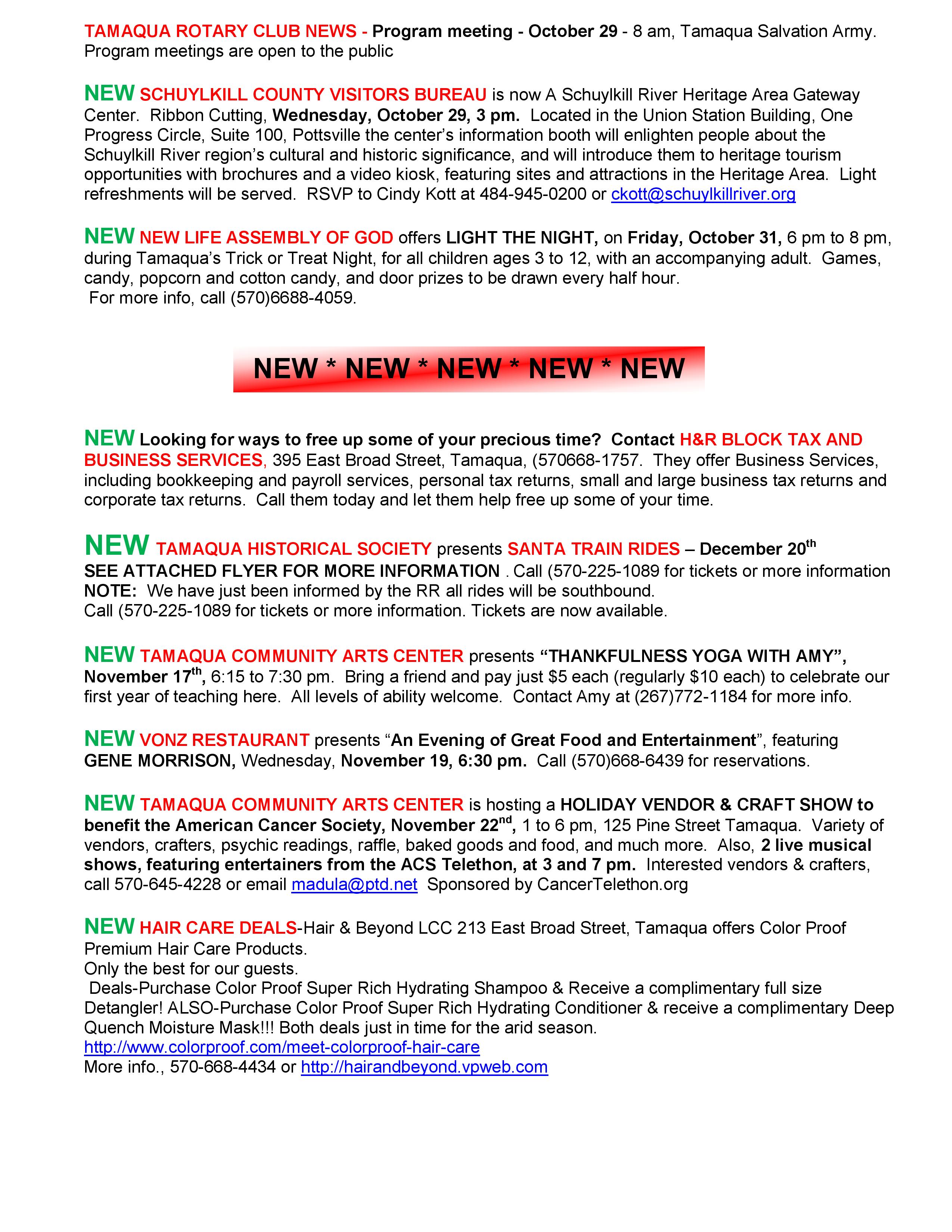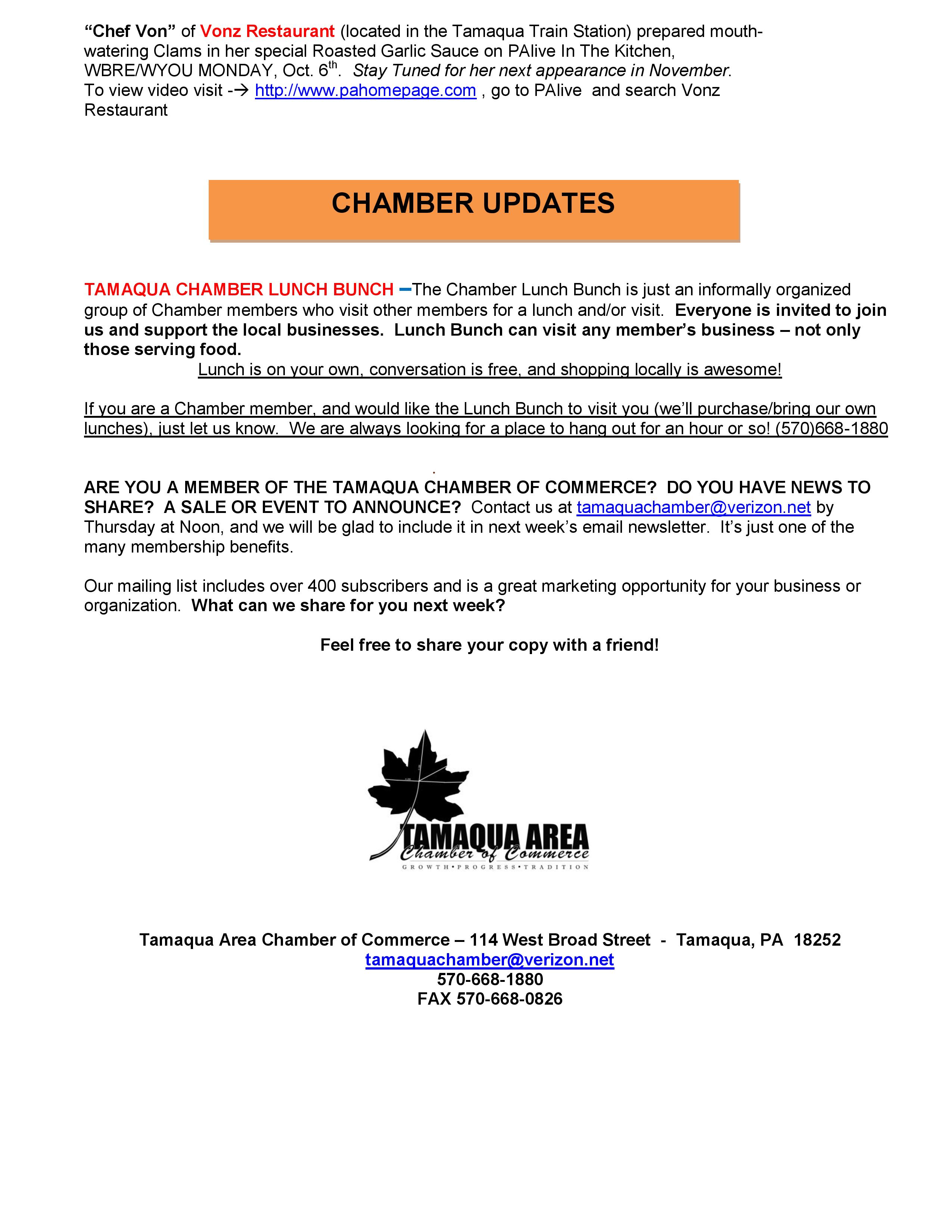 Here is the latest Tamaqua Area Chamber of Commerce’s Chamber Chatters newsletter dated Friday (October 24, 2014).