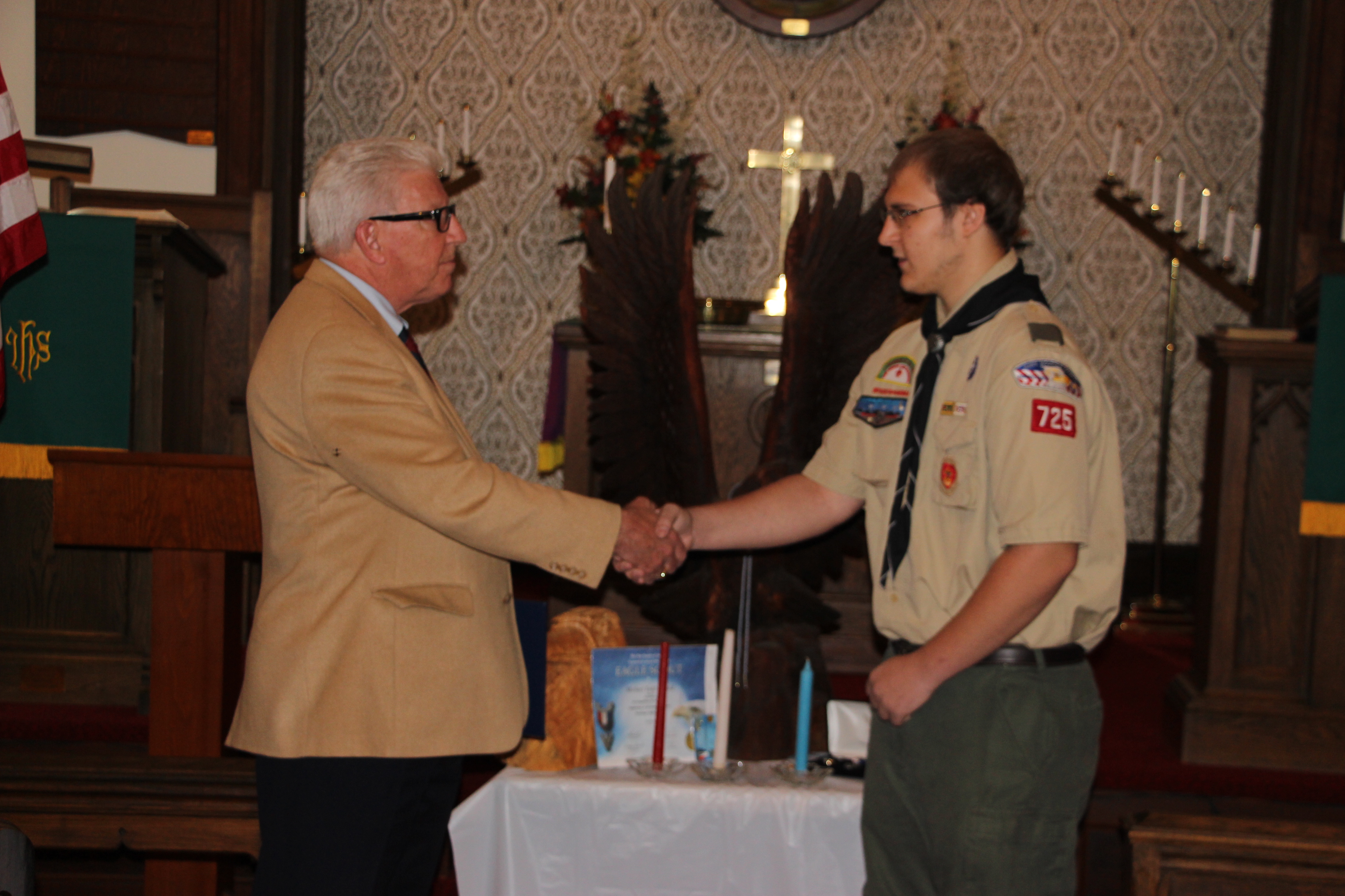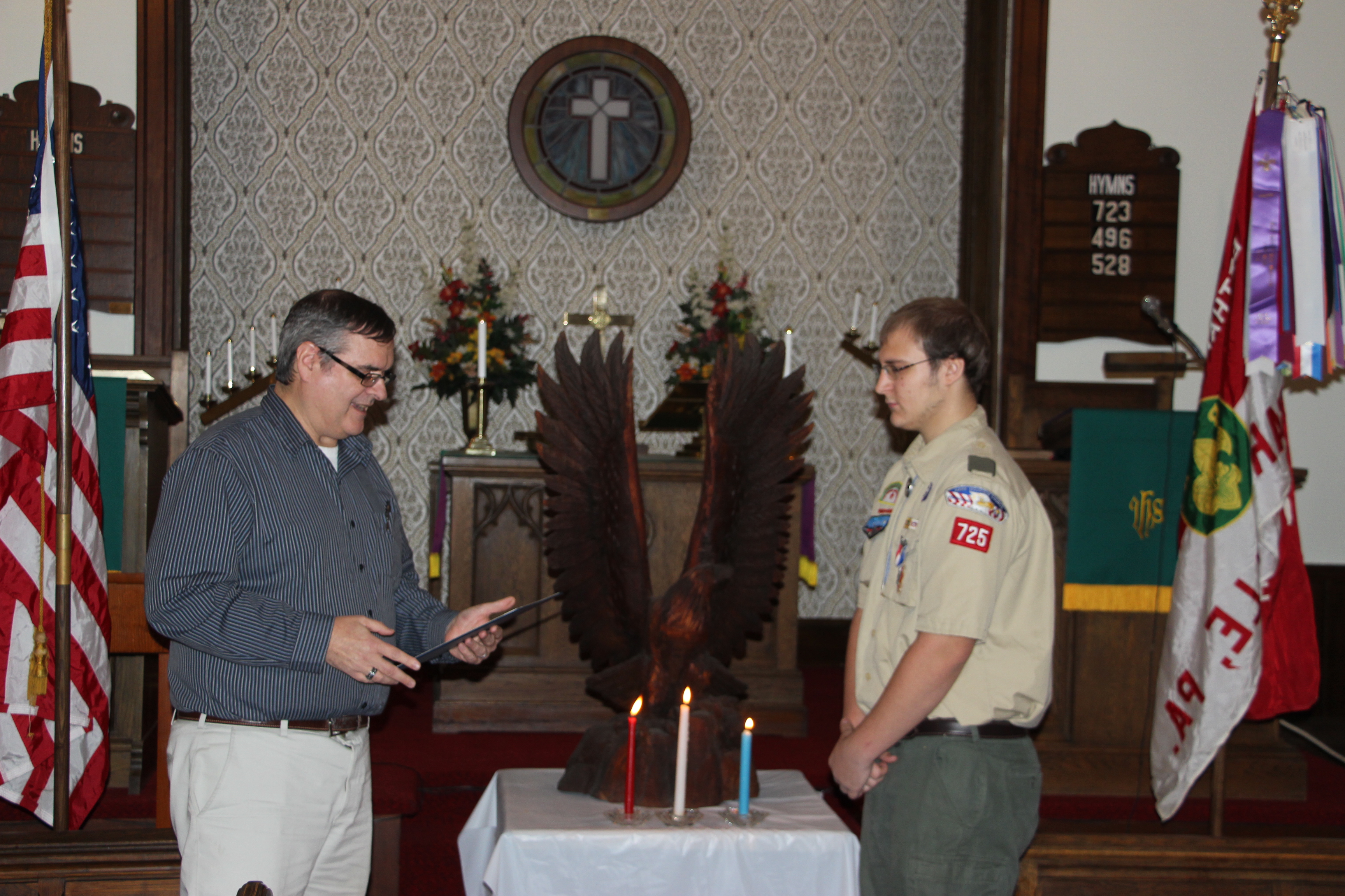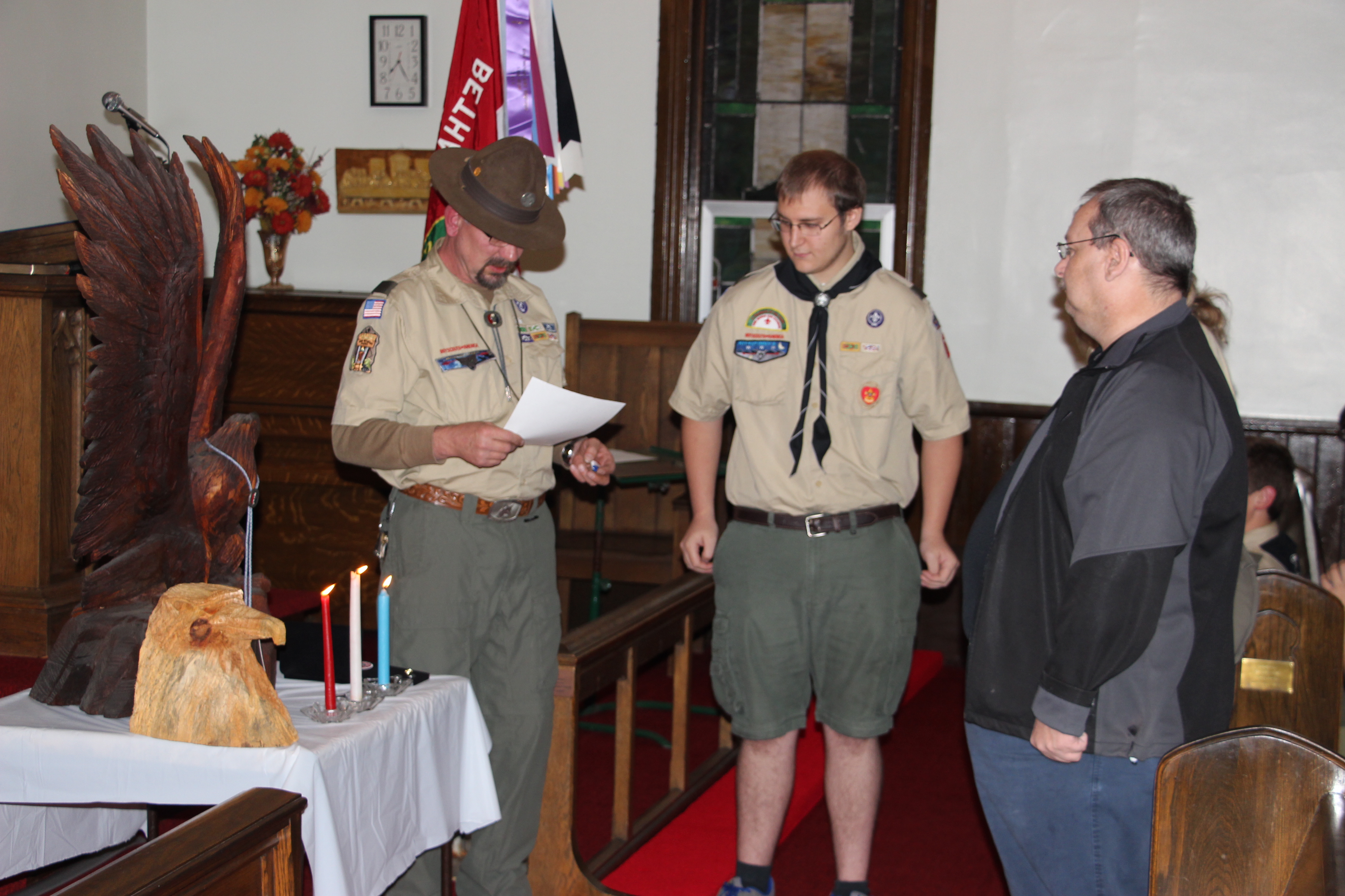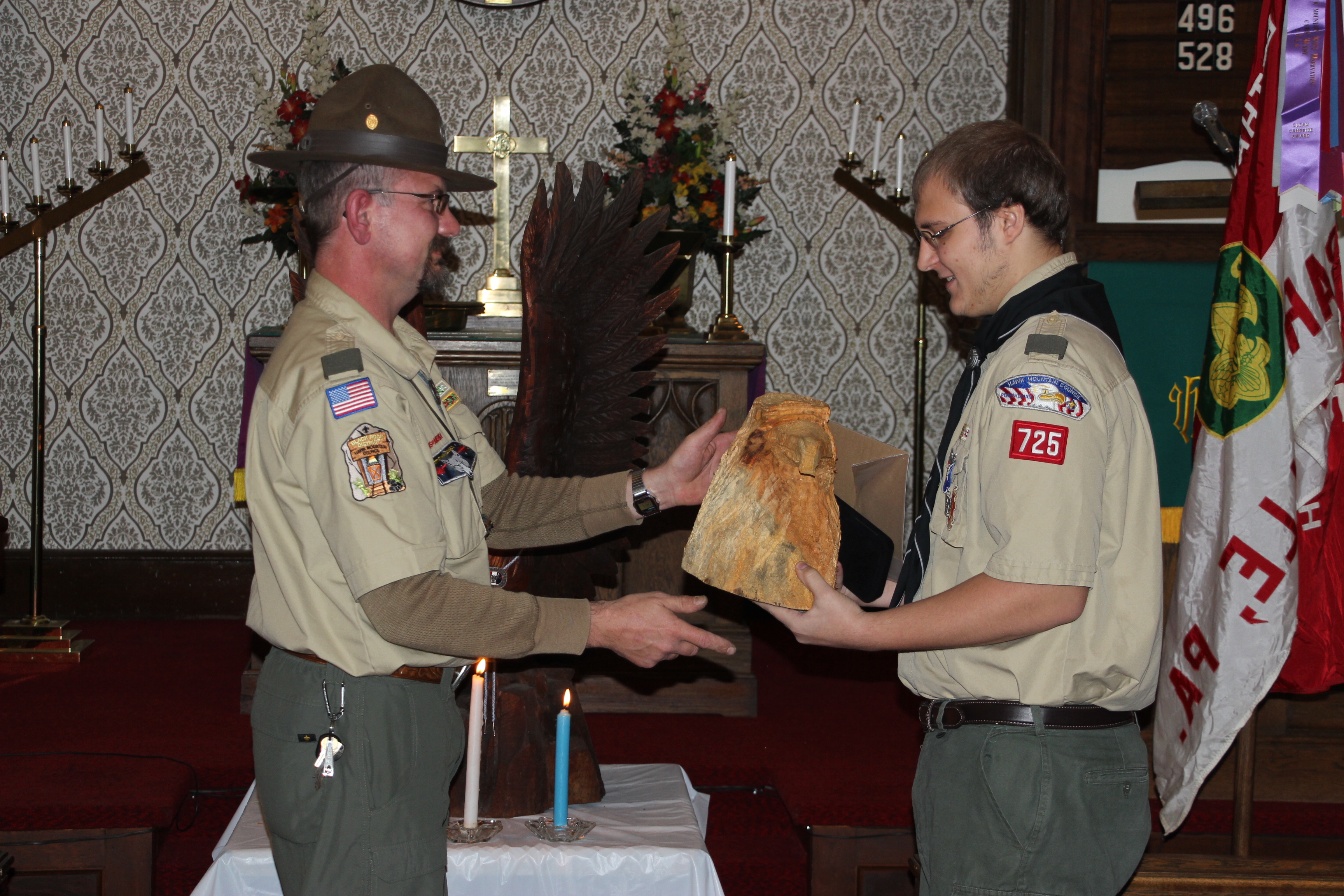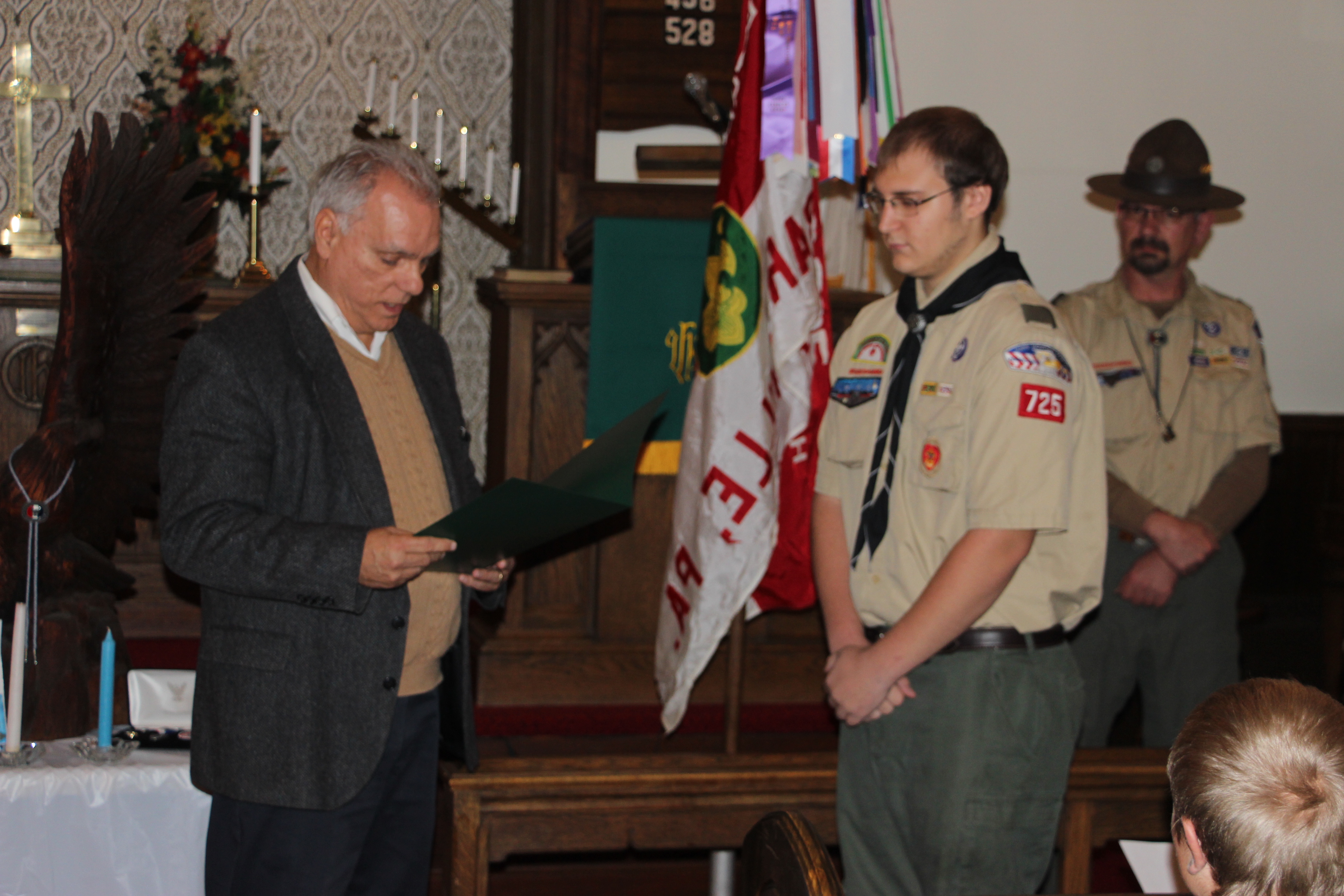 Scoutmaster Roy Bradbury, who spoke of Michael’s accomplishments and journey as a scout, said that only about 6 percent of all boy scouts earn the Eagle Scout rank. He also presented Michael with a traditional eagle wood carving.