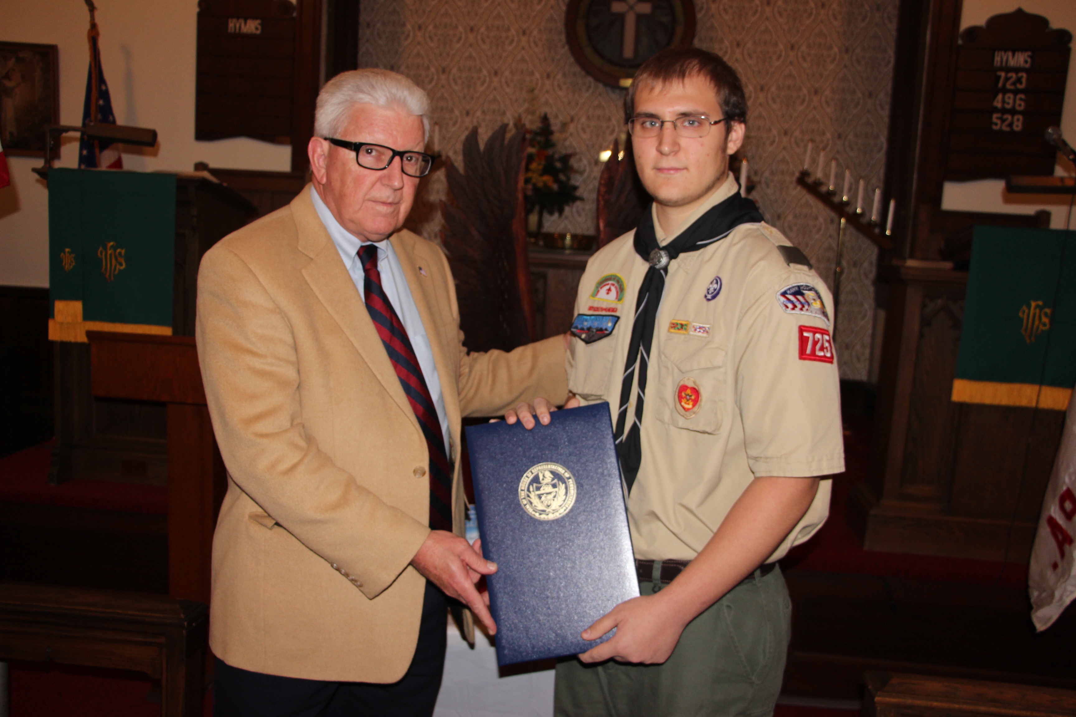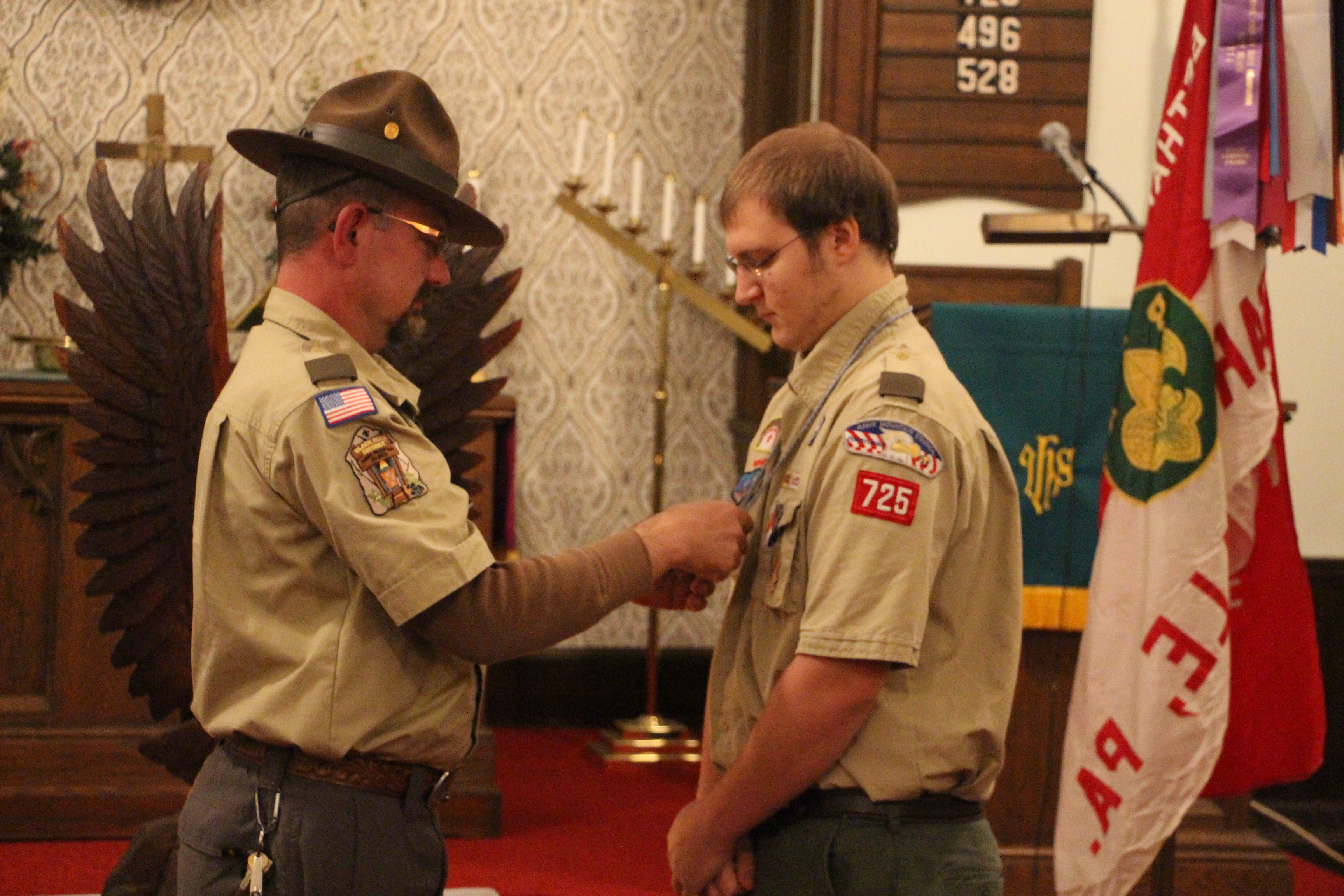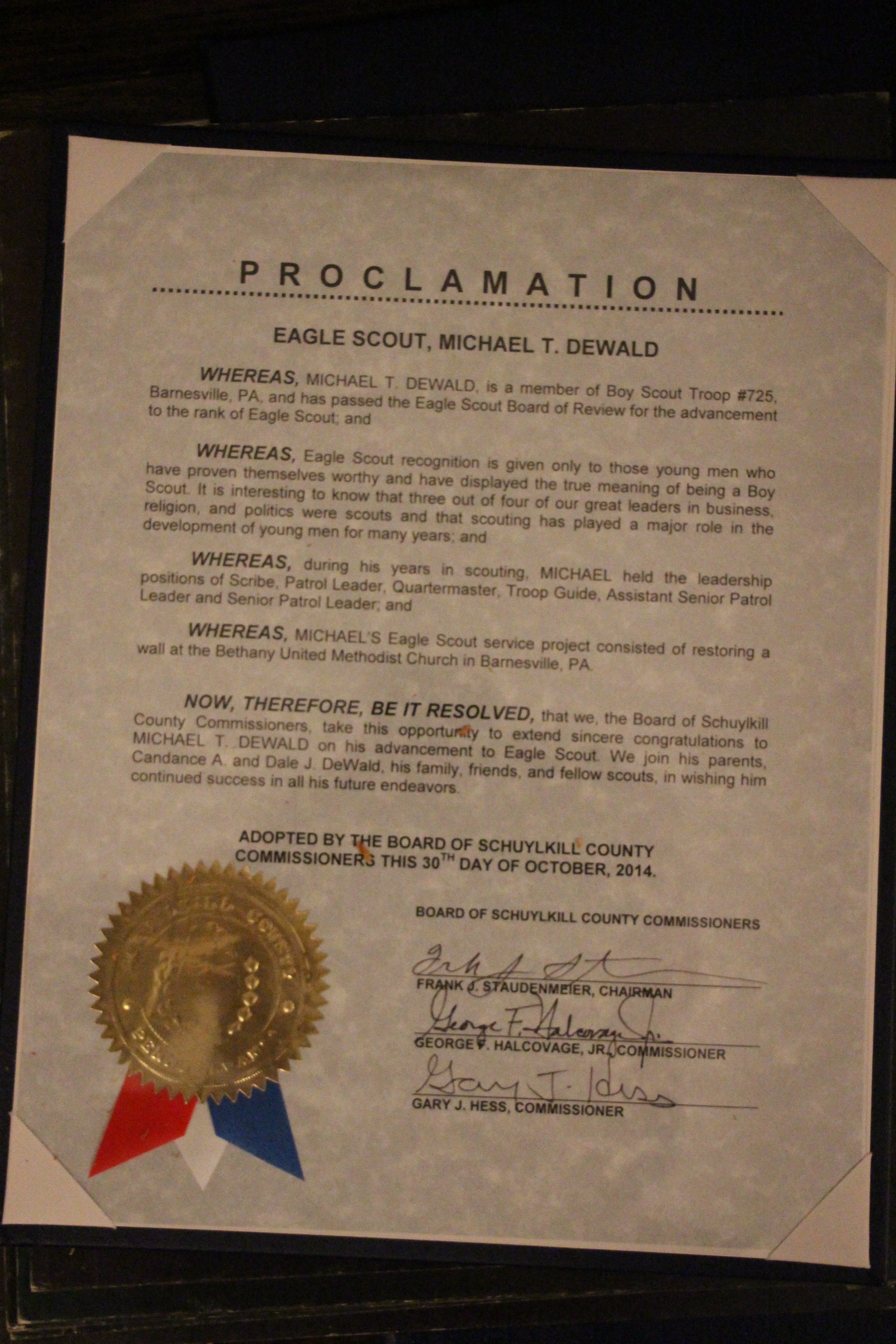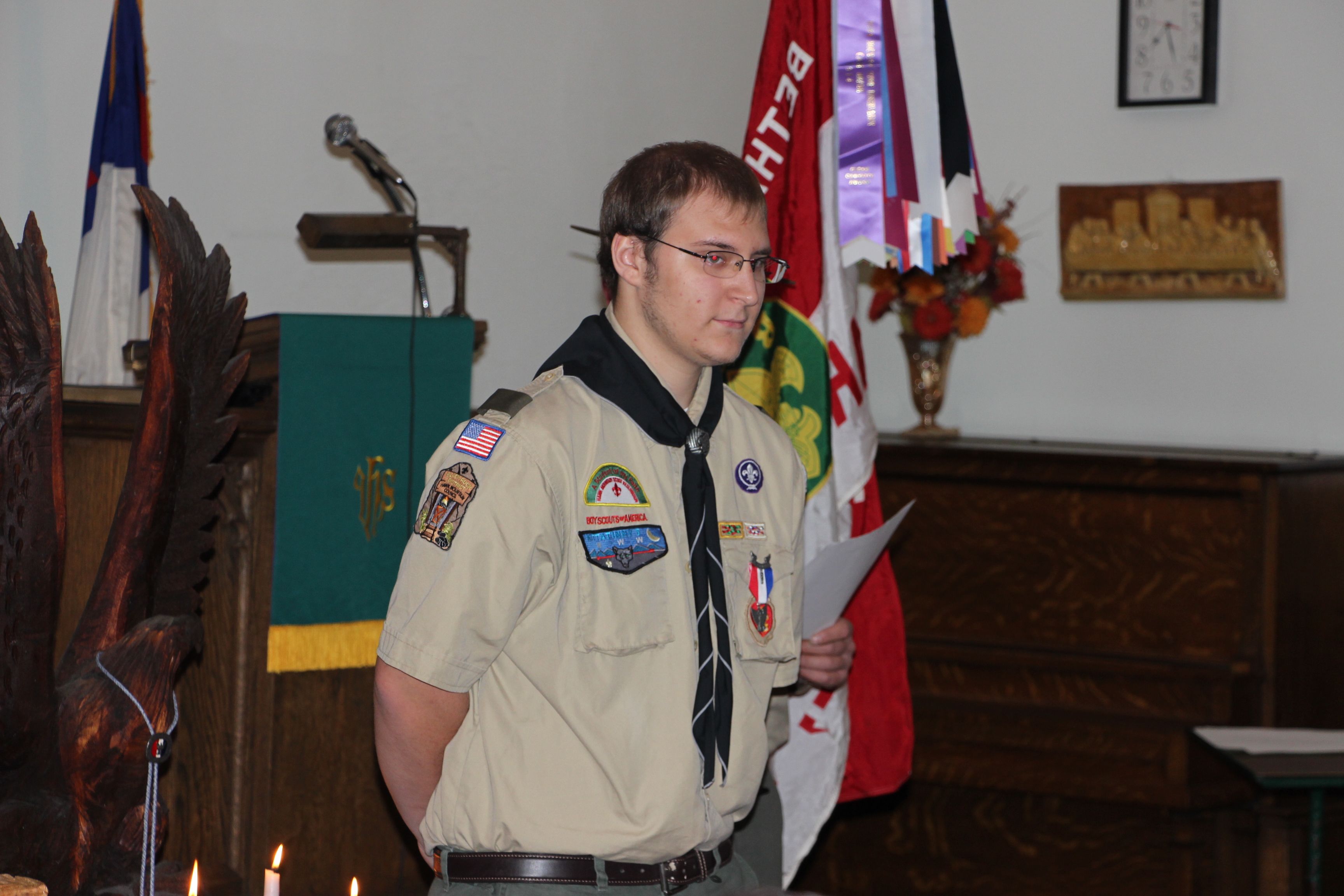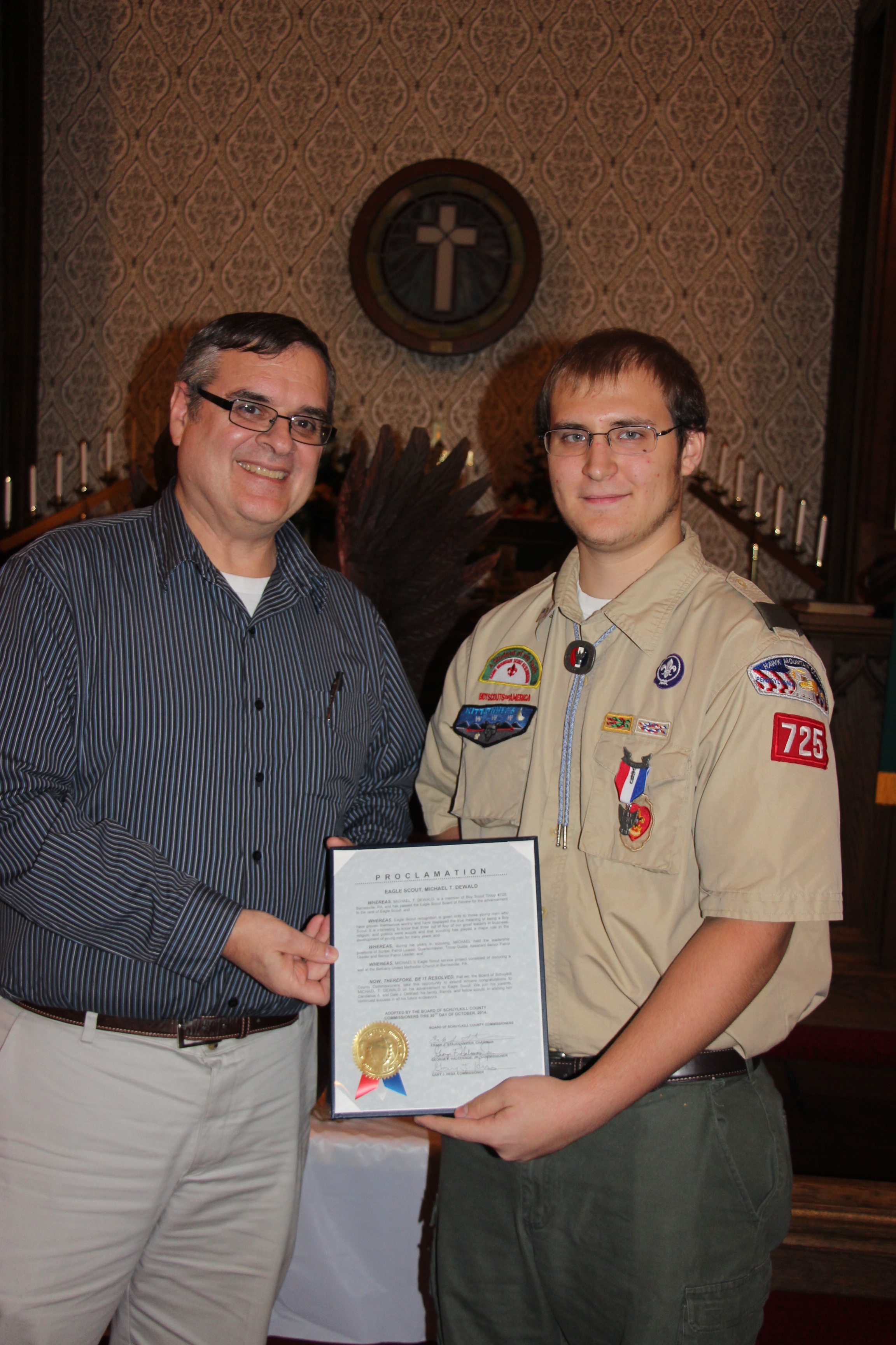 Michael DeWald, 18, of Mahanoy City, earned his Distinguished Eagle Scout Award on Thursday, October 30, 2014 at the Bethany United Methodist (B.U.M.) Church in Barnesville.