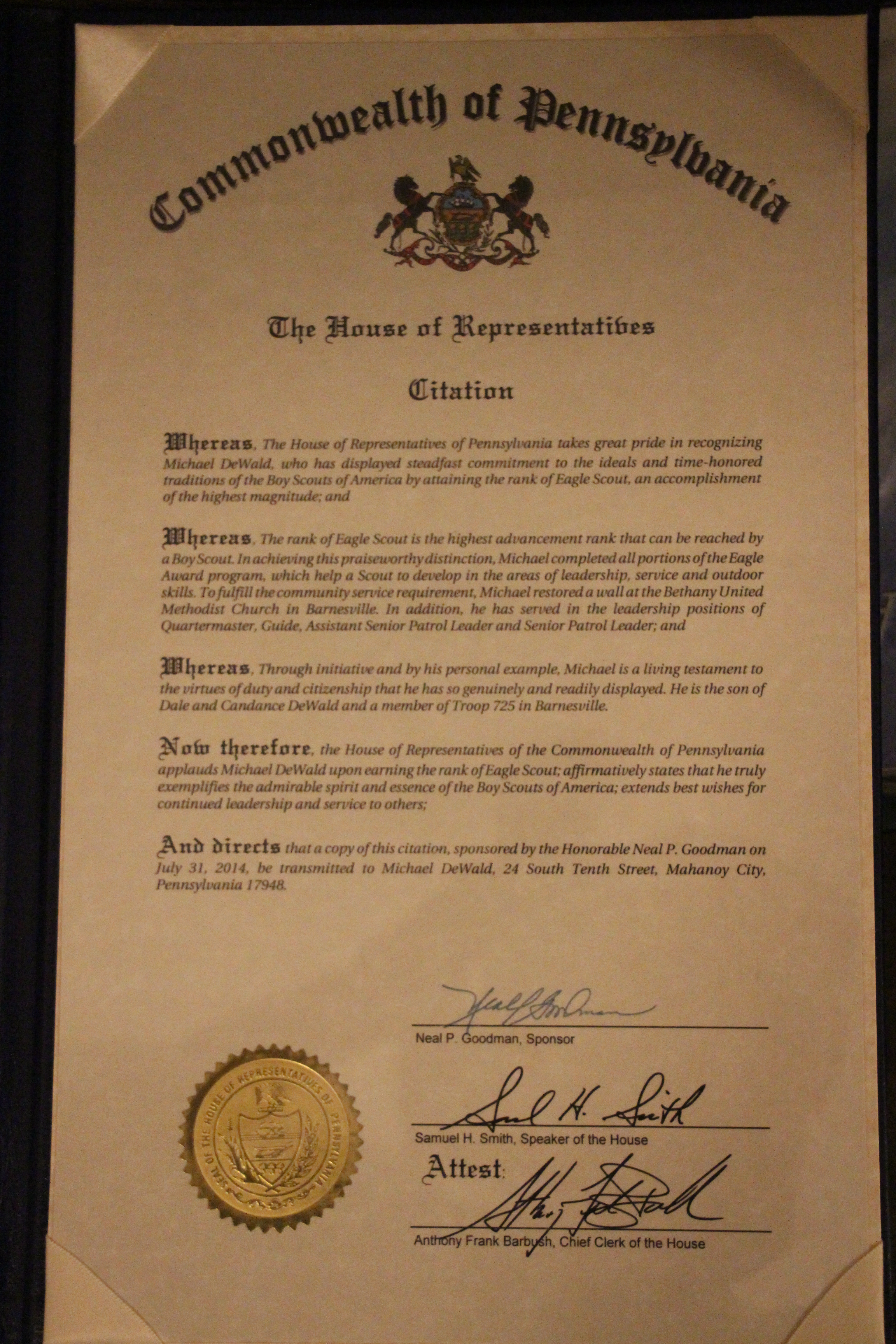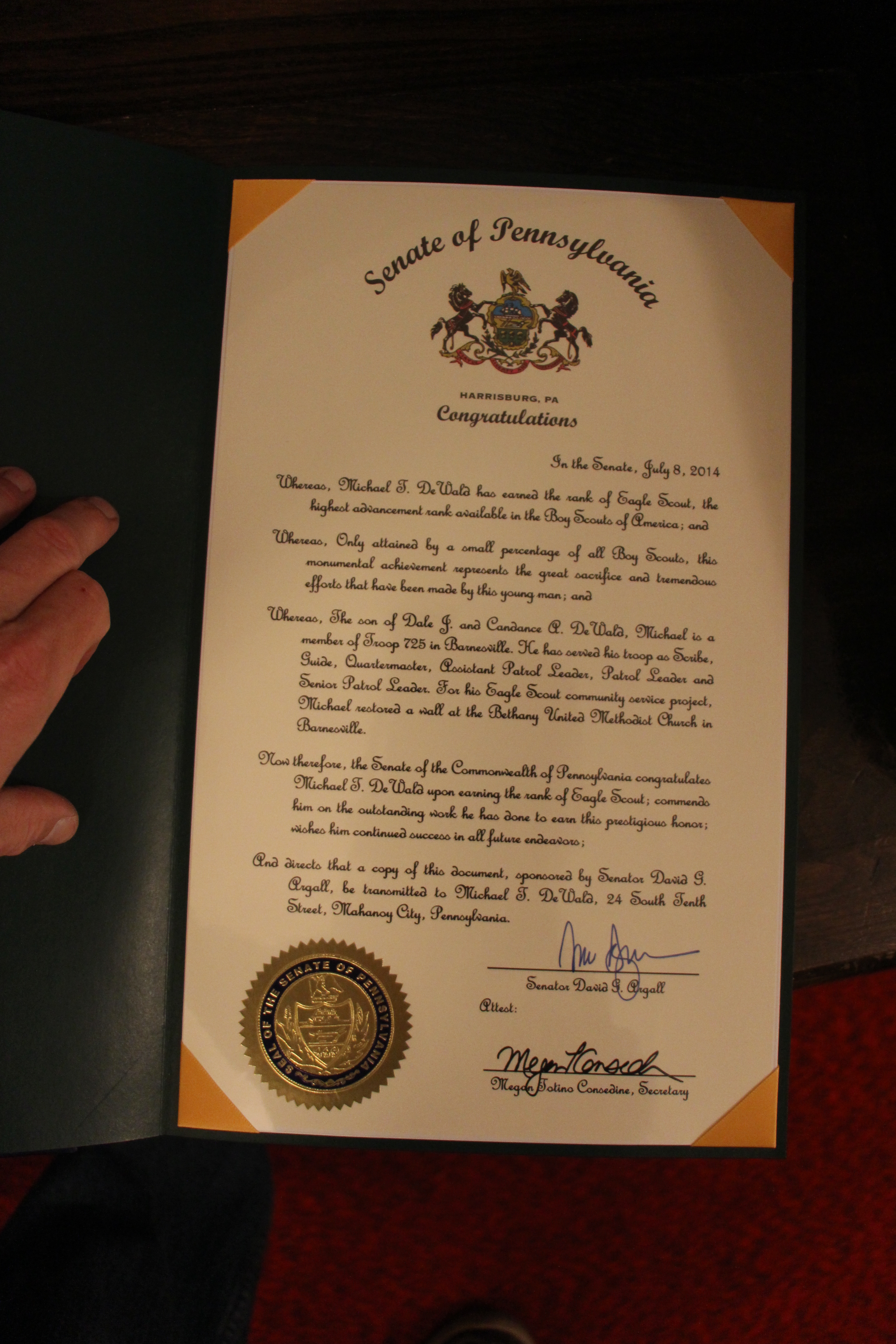 Officials attending the ceremony were Champ Holman (who presented a congratulatory certificate on half of Senator David Argall), Ed Kleha (who presented a citation on behalf the Representative Neal Goodman), and Pastor Greg Hafer (who presented a proclamation on behalf of the Schuylkill County Commissioners).