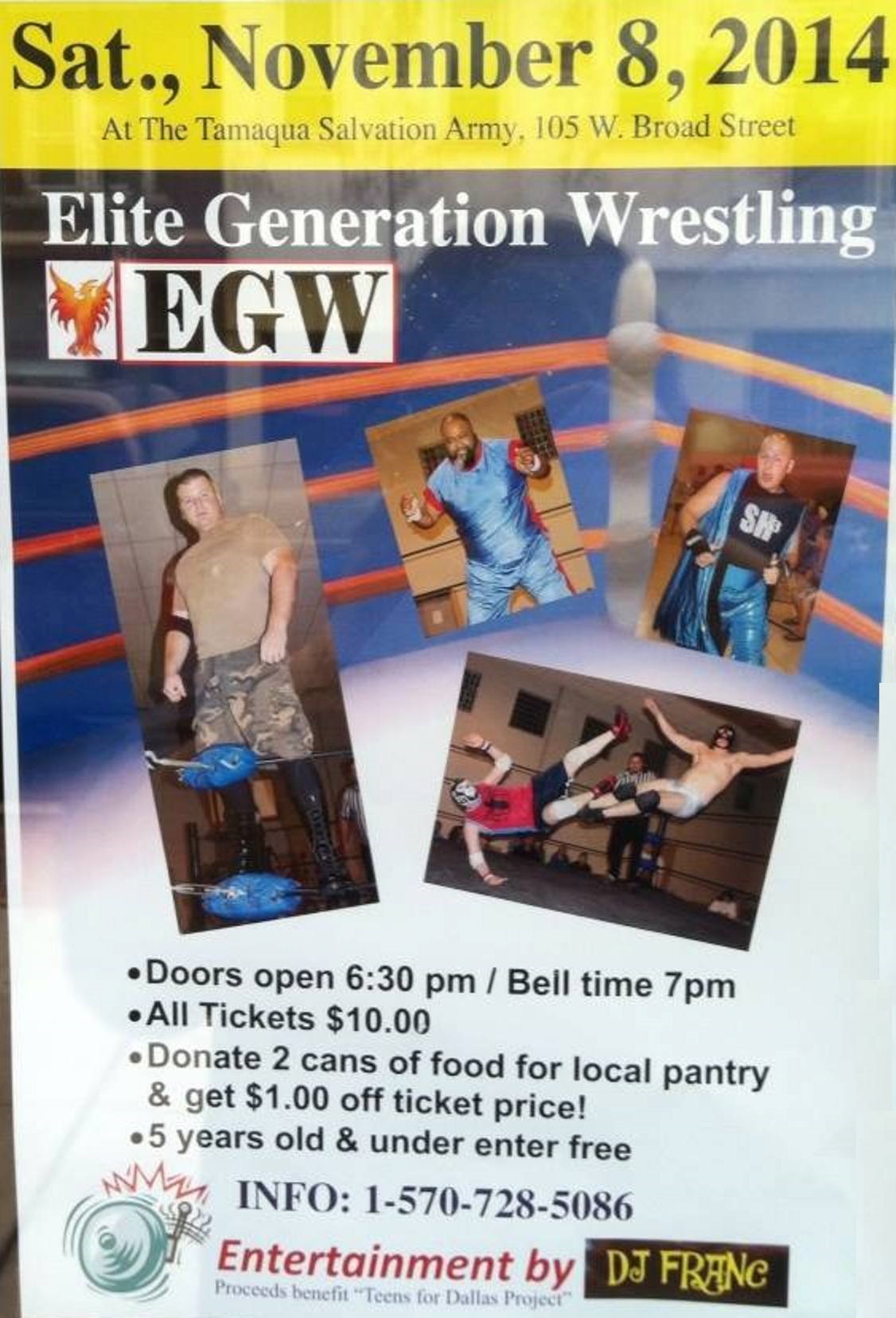 Members, wrestlers and volunteers with Elite Generation Wrestling are holding a wrestling show on Saturday, November 8, 2014 to benefit the Tamaqua Salvation Army.